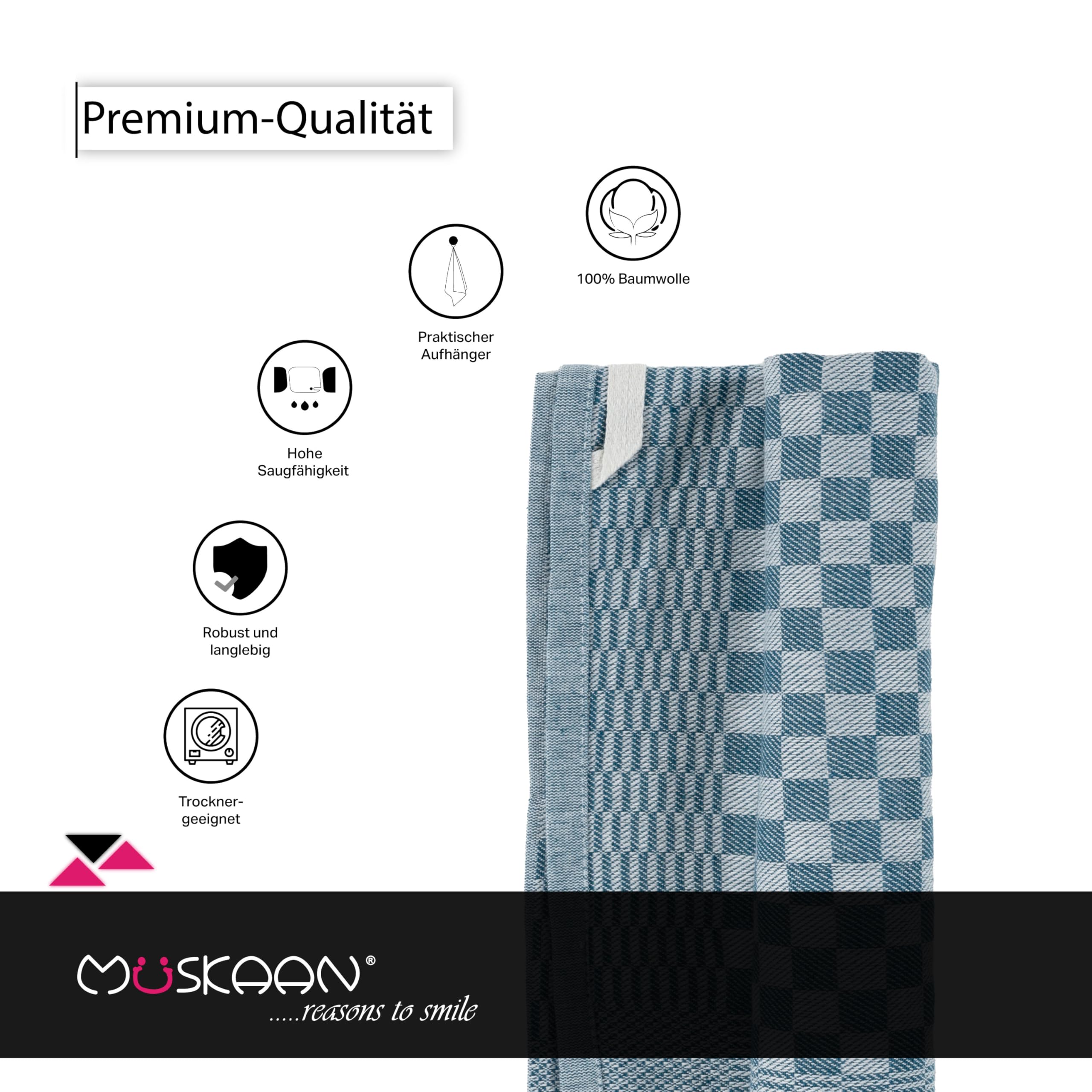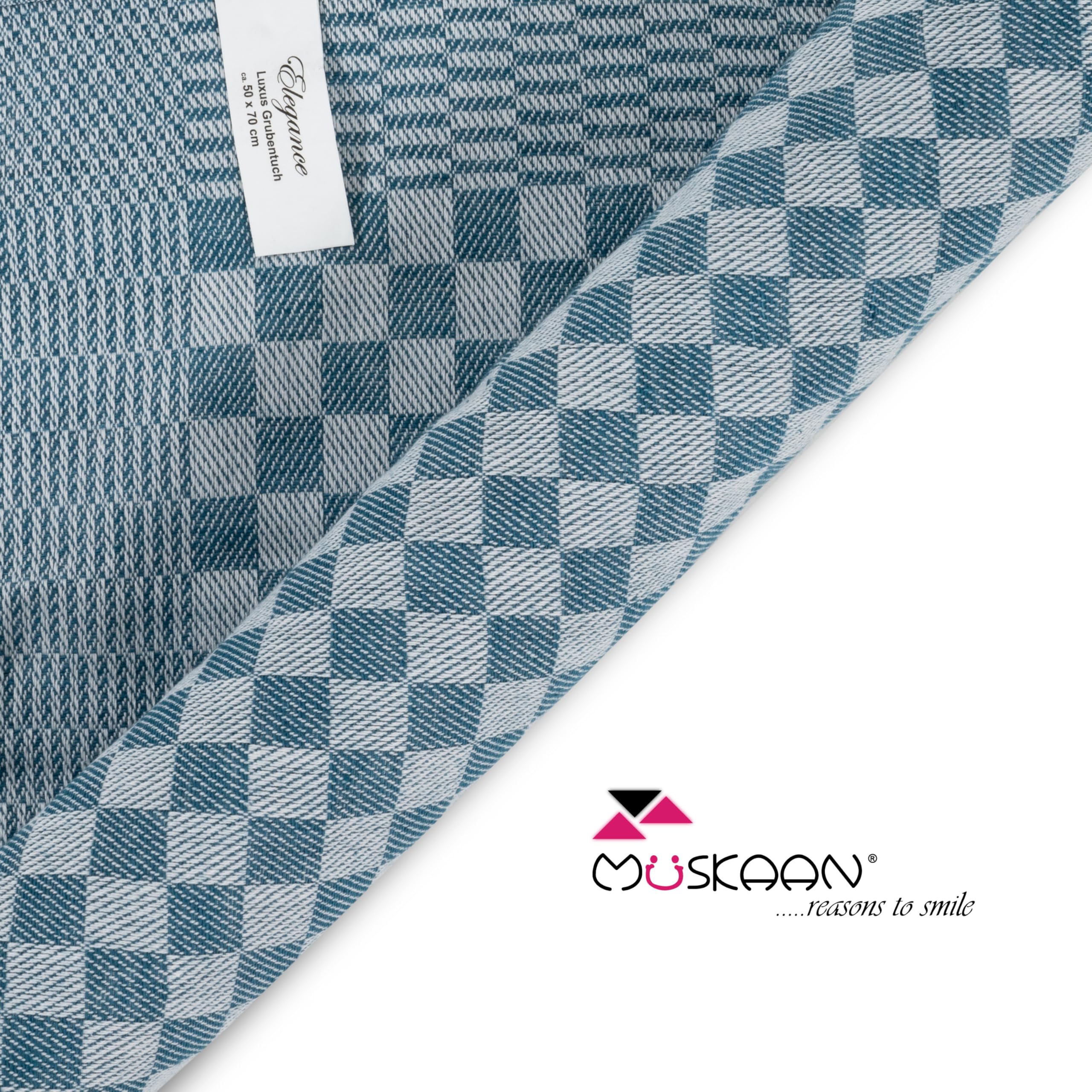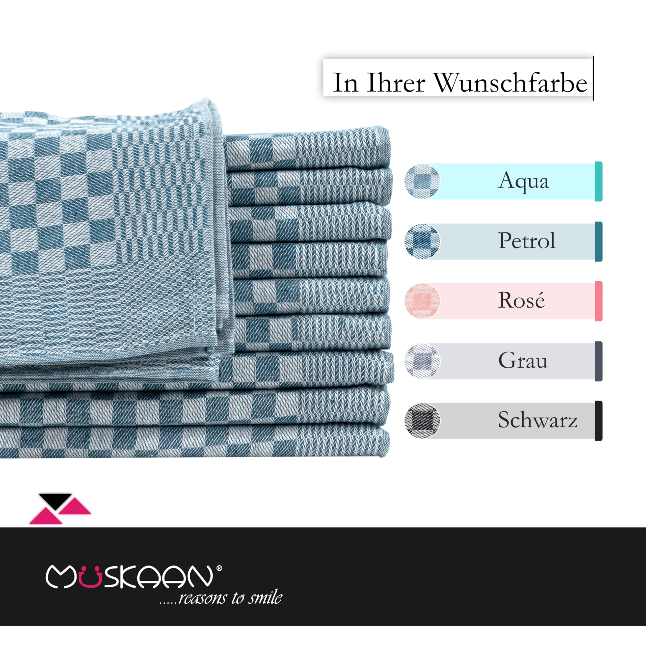 Müskaan Grubentücher - Tradition trifft auf modernen Komfort! Müskaan präsentiert Ihnen die ultimativen Geschirrtücher für Ihre Küche. Mit einer Dichte von 210gsm, in den Abmessungen von 50x70 cm und einem Gewicht von 75g pro Stück bieten diese Tücher die perfekte Grösse und Dicke für all Ihre Bedürfnisse. Aus 100% Baumwolle gefertigt, sind sie nicht nur hautsympathisch und fliessend weich, sondern auch extrem saugfähig. Sie absorbieren Feuchtigkeit und Wasser und garantieren eine streifenfreie Reinigung. Egal ob Sie ein Glas polieren, verschüttete Flüssigkeiten aufwischen oder einfach nur das Geschirr abtrocknen möchten – mit unseren Tüchern meistern Sie jede Herausforderung mit Leichtigkeit. Und wenn es um das Waschen geht? Einfach und praktisch! Unsere Tücher sind bis zu 95°C waschbar und trocknergeeignet. In einem Set von 10 Stück und in fünf attraktiven Farben erhältlich – aqua, petrol, rosé, grau und schwarz – gibt es für jeden Geschmack und jede Küchenfarbe das Passende. Das zeitlose Design passt zu modernen und traditionellen Küchen und verleiht Ihrem Raum eine elegante Note. Zudem sorgen die integrierten Aufhänger für eine einfache Aufbewahrung. Entscheiden Sie sich für Müskaan, wenn Sie Qualität, Funktionalität und Stil in einem Produkt suchen. Diese Tücher werden schnell zu einem unverzichtbaren Bestandteil Ihrer Küchenausstattung!
