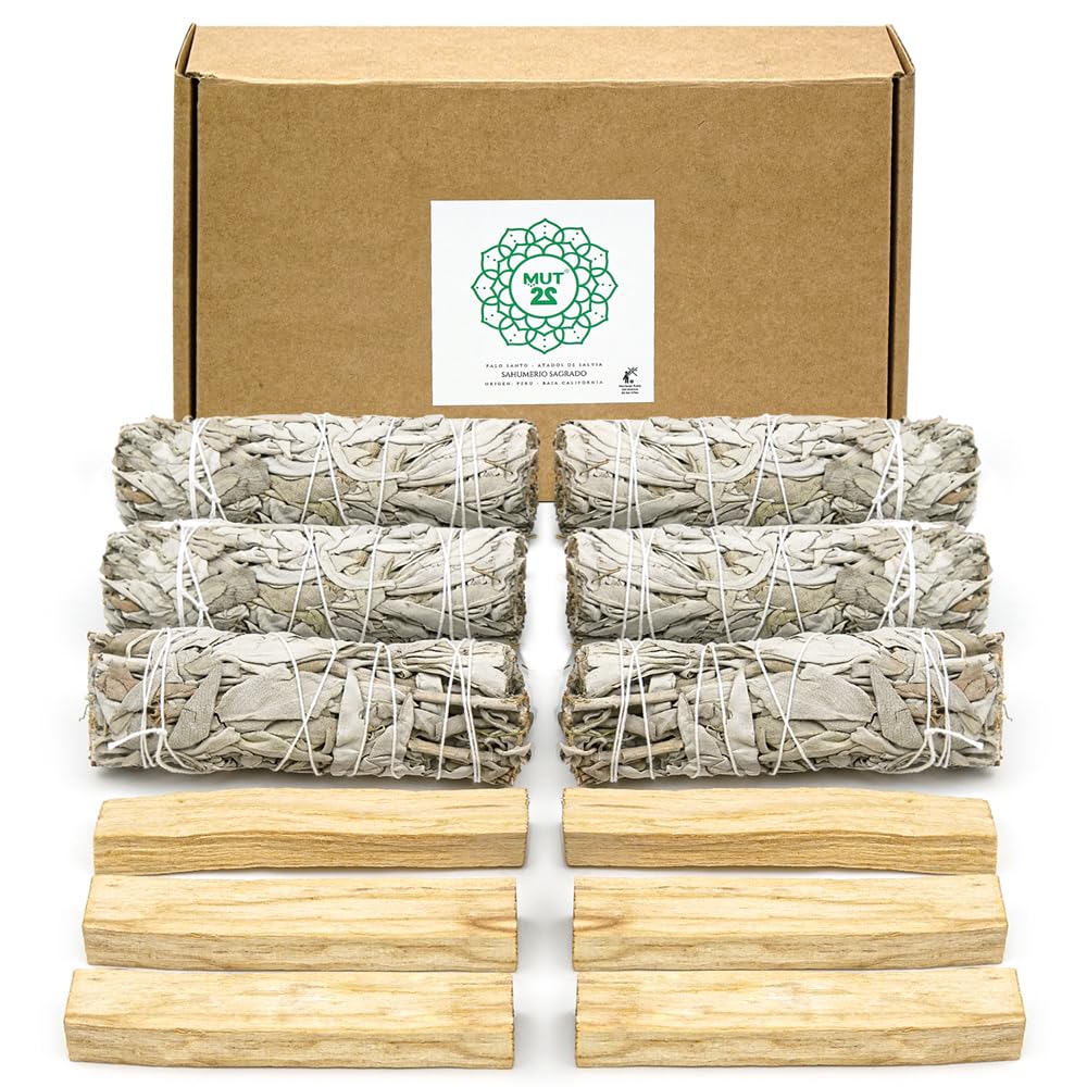 MUT22 6 Weisser Salbei und 6 Palo Santo Premium Kalifornischer, 100% natürlich und reinigend, ideal für spirituelle und energetische Rituale (6 Weisser Salbei + 6 Palo Santo)