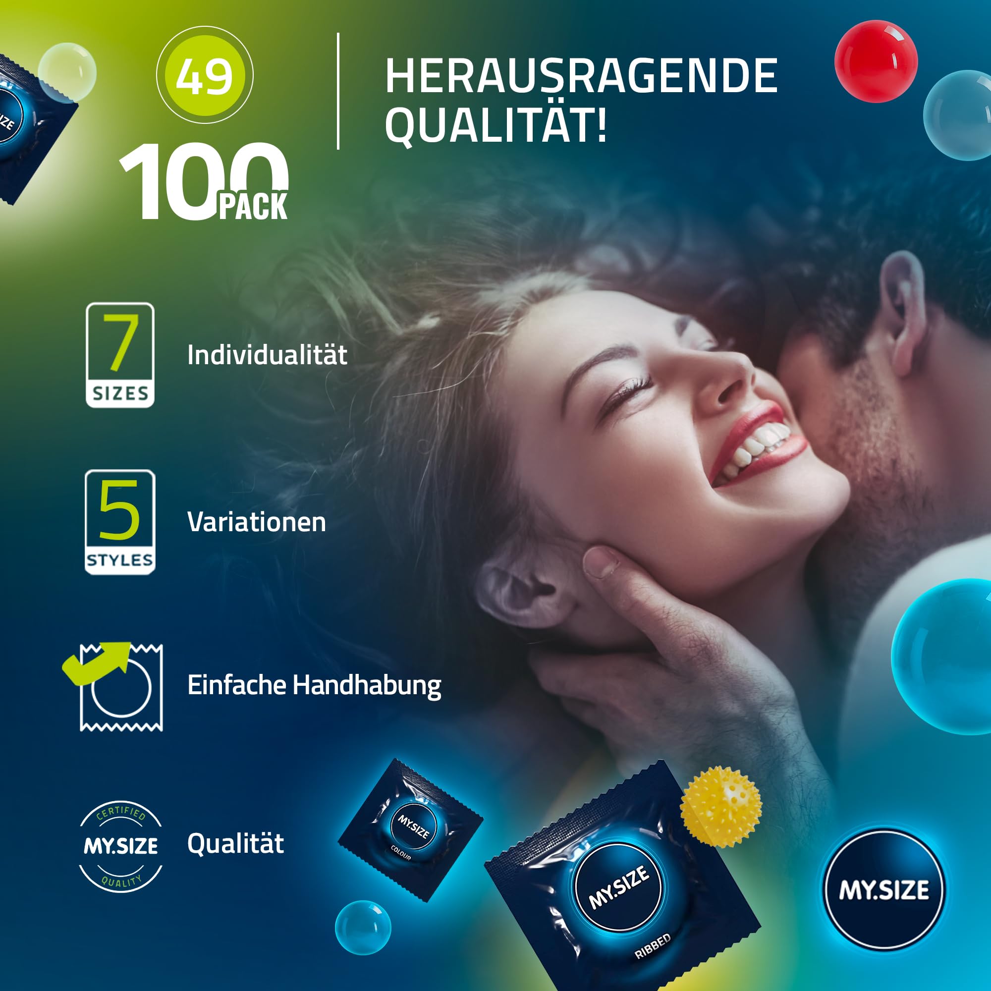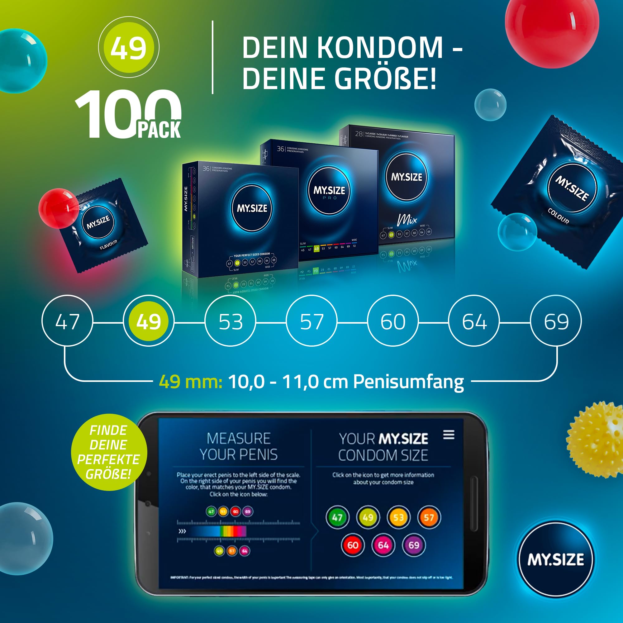 • Der Deal: 100 Stück MY.SIZE Kondome in 5 Variationen: 43x „Classic“, 7x „naturfarben gerippt“, 7x „rot mit Erdbeerduft“, 7x „Blau“, 36x "PRO". Grösse 2, 49mm. CE gekennzeichnet. Gemäss EU-Richtlinie Für Medizinprodukte 93/42 EWG. (Erhältlich in weiteren nominalen Breiten. mit Gratis Online Measuring App.)