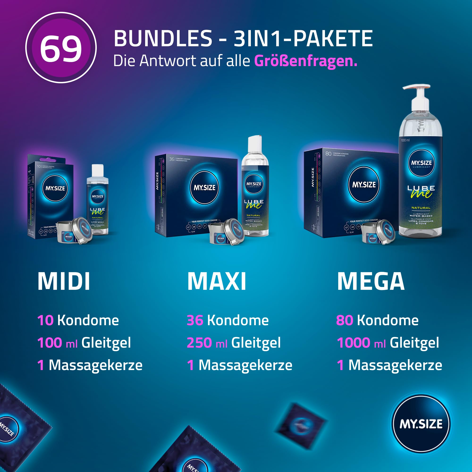 My.Size: Das passende Kondom für jeden. Kondome, die auf unterschiedliche Grössen nicht eingehen und dadurch abrutschen oder einengen, gibt es viele. Darüber entstehen Jahr für Jahr hundertmillionenfach Frust und Unlust allein in deutschen Betten. Für höchste Ansprüche an Qualität, Empfinden und Sicherheit von Kondomen wurden My.Size-Kondome entwickelt. Lustvoller lieben, sicherer und mit deutlich grösserem Empfinden. Eins von sieben My.Size Kondomen passt zu jedem - mit Sicherheit. Millionen Kondomverwender europaweit haben ihre perfekte Kondomgrösse mit My.Size schon gefunden und sich damit ihren grossen Lustgewinn erobert. So finden Sie Ihre passende Kondomgrösse: Hierzu einfach ein Massband mit Zentimetern vorsichtig um den erigierten Penis wickeln und das Ergebnis ablesen. My.Size 47 mm: 9,5 - 10,0 cm Penisumfang My.Size 49 mm: 10,0 - 11,0 cm Penisumfang My.Size 53 mm: 11,0 - 11,5 cm Penisumfang My.Size 57 mm: 11,5 - 12,0 cm Penisumfang My.Size 60 mm: 12,0 - 13,0 cm Penisumfang My.Size 64 mm: 13,0 - 14,0 cm Penisumfang My.Size 69 mm: 14,0 - 15,0 cm Penisumfang. Hinweis: Der Penisumfang ist für die Wahl der richtigen My.Size Grösse entscheidend. Die Penislänge spielt keine Rolle bei der passenden Kondomgrösse. Tipp: Soll das Kondom enger sitzen oder möchten Sie besonders viel spüren? Wählen Sie eine kleinere bzw. grössere My.Size Kondomgrösse aus.