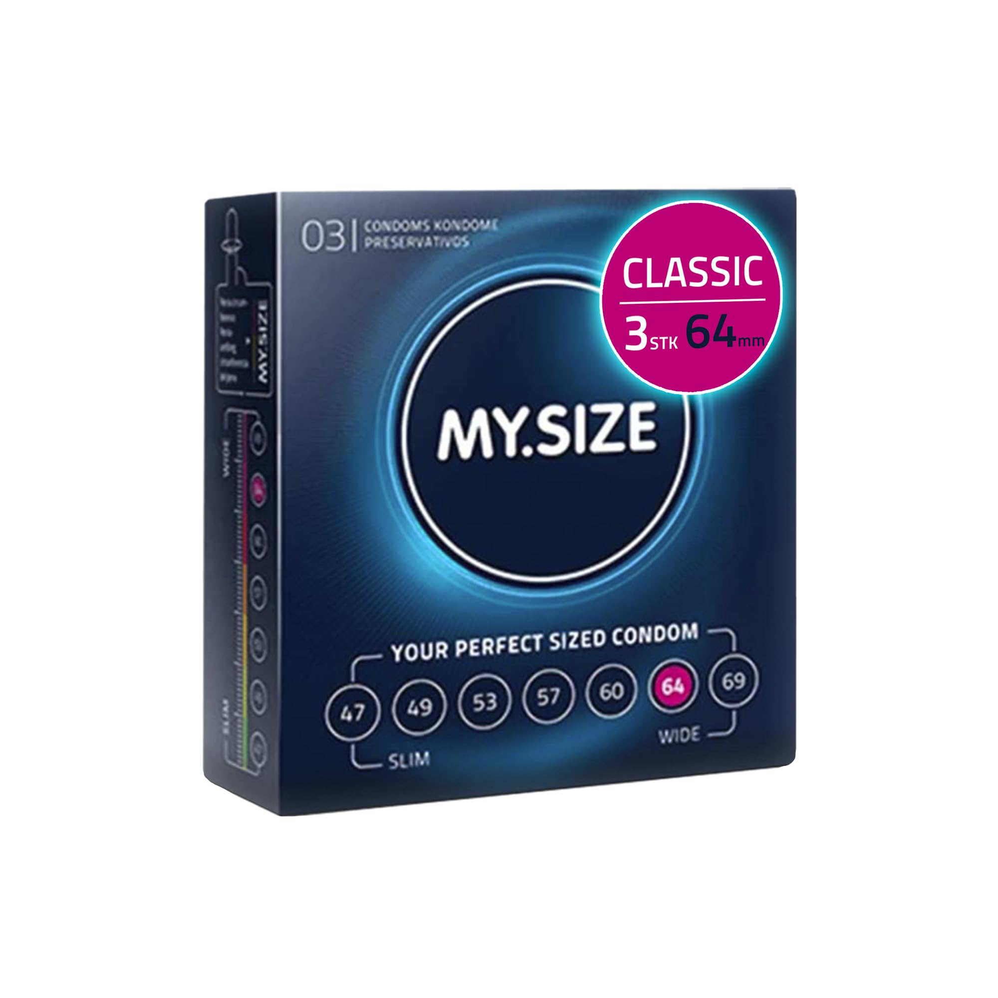 MY.SIZE Classic Kondome Grösse 6 | 64 mm Breite | 3 Stück Probierpackung | extra dünn | gefühlsecht hauchzart | dünne 0,07 mm Wandstärke