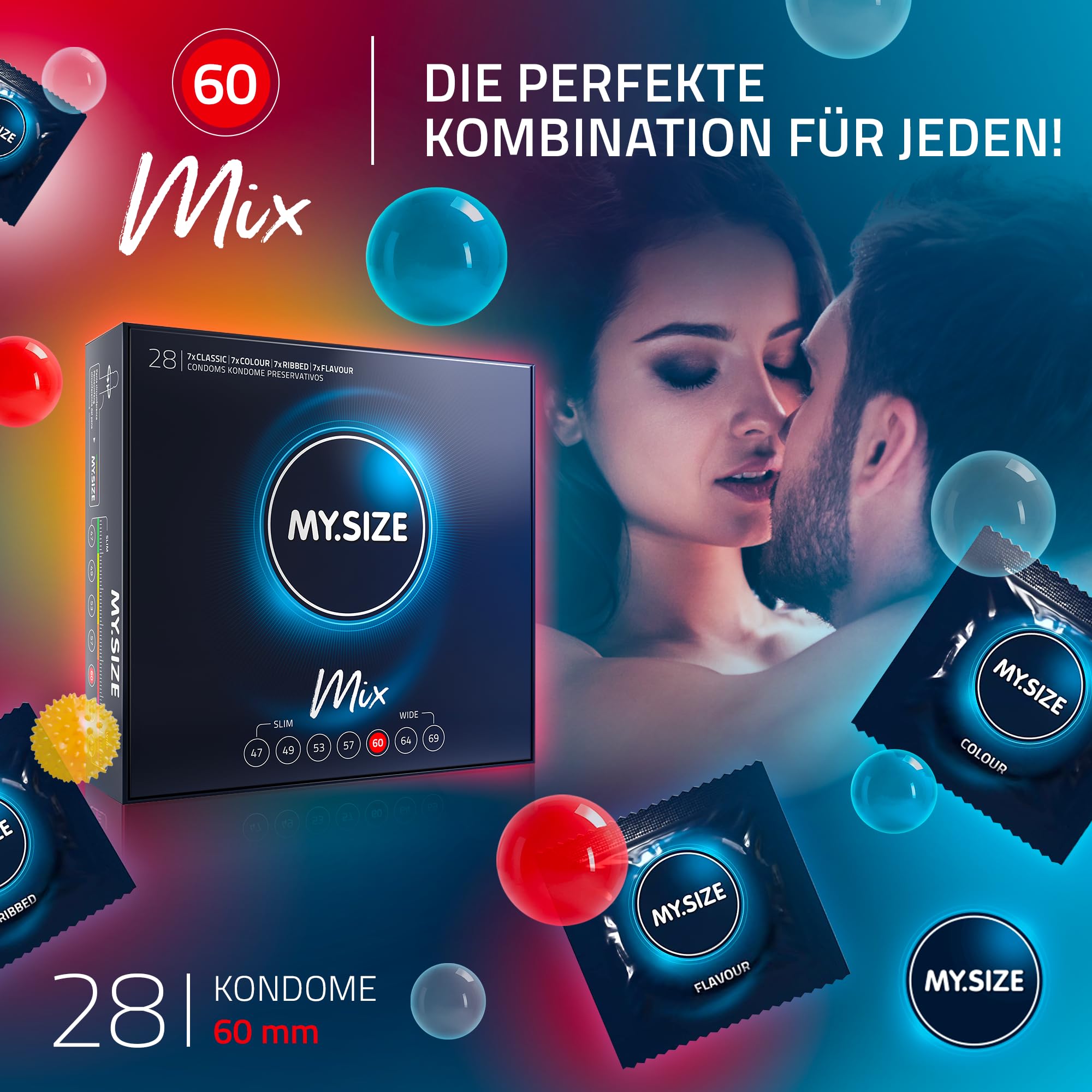 • Der Deal: 28 Stück MY.SIZE Kondome in 4 Variationen: 7x „Classic“, 7x „Ribbed“, 7x „Flavour“, 7x „Colour“. Grösse 5, 60mm. CE gekennzeichnet. Gemäss EU-Richtlinie Für Medizinprodukte 93/42 EWG. (Erhältlich in weiteren nominalen Breiten. mit Gratis Online Measuring App.)