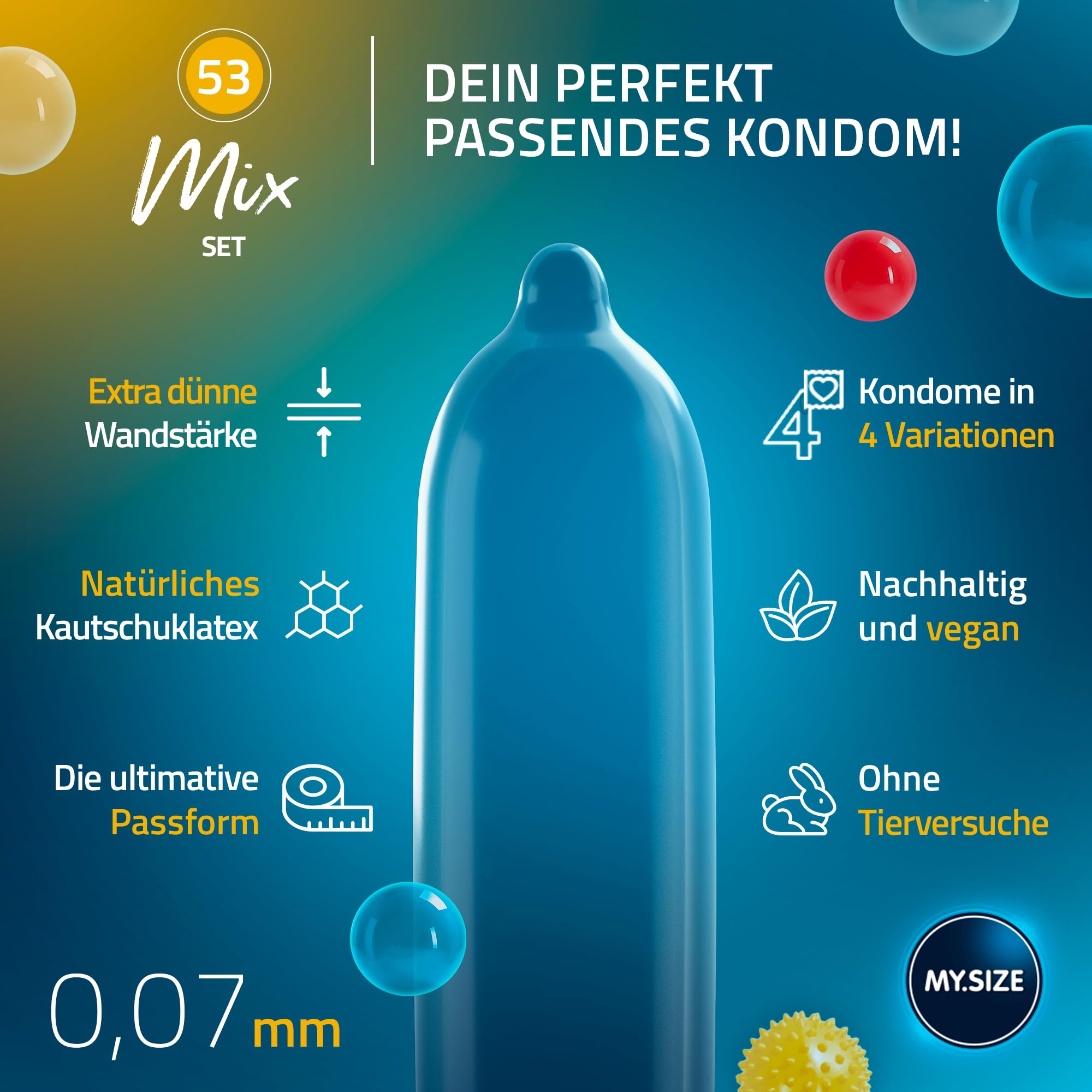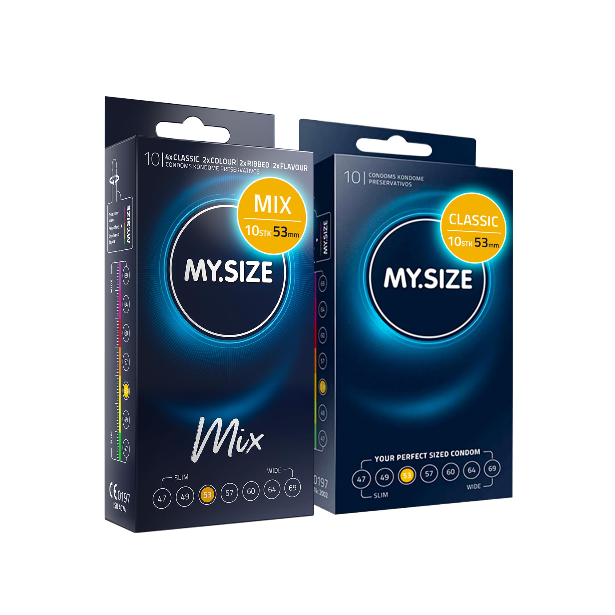 - Der Deal: je 10 Stück MY.SIZE Classic + Mix Kondome in 4 Variationen: 4x „Classic“, 2x „Ribbed“, 2x „Flavour“, 2x „Colour“. Grösse 3, 53mm. CE gekennzeichnet. Gemäss EU-Richtlinie Für Medizinprodukte 93/42 EWG. (Erhältlich in weiteren nominalen Breiten. mit Gratis Online Measuring App.)