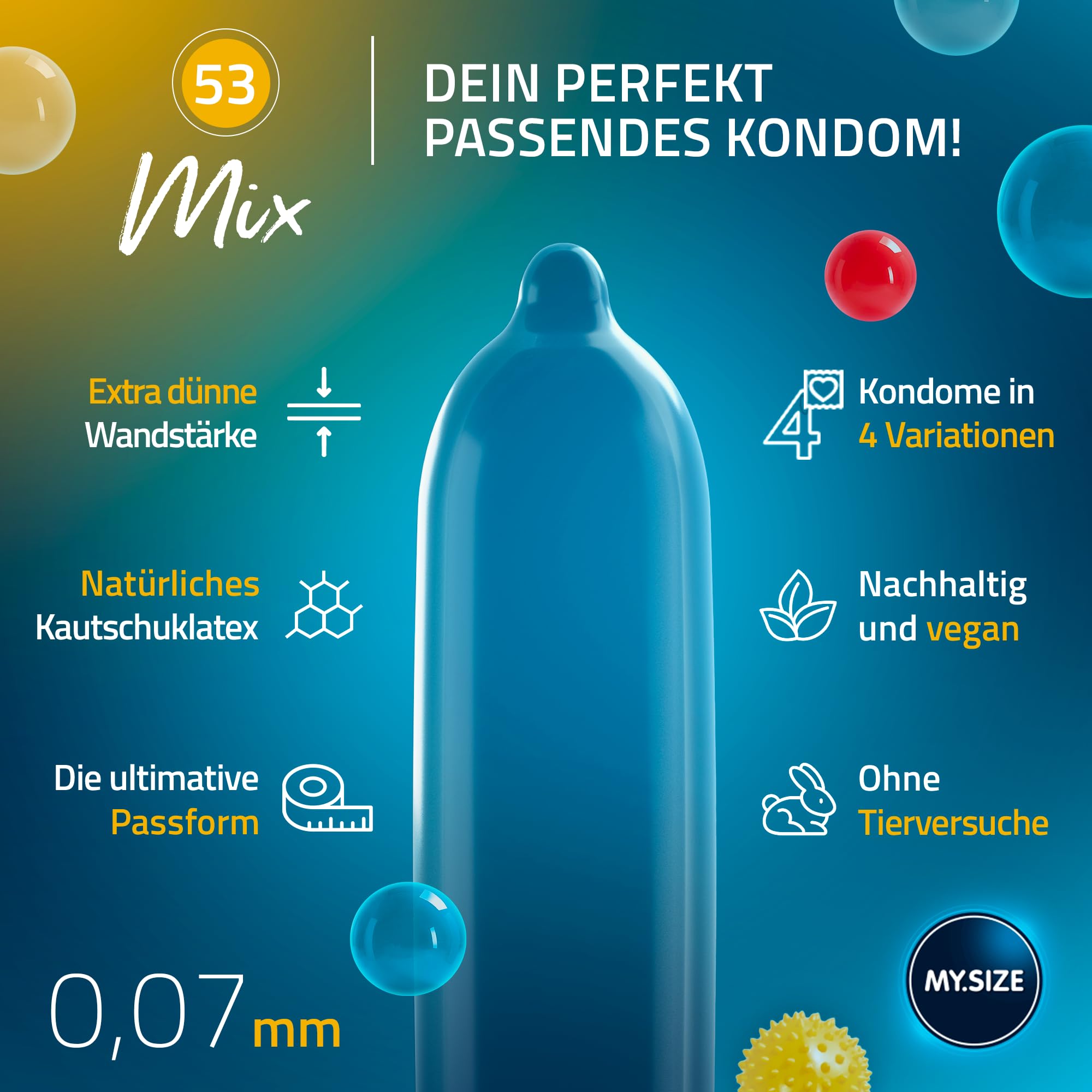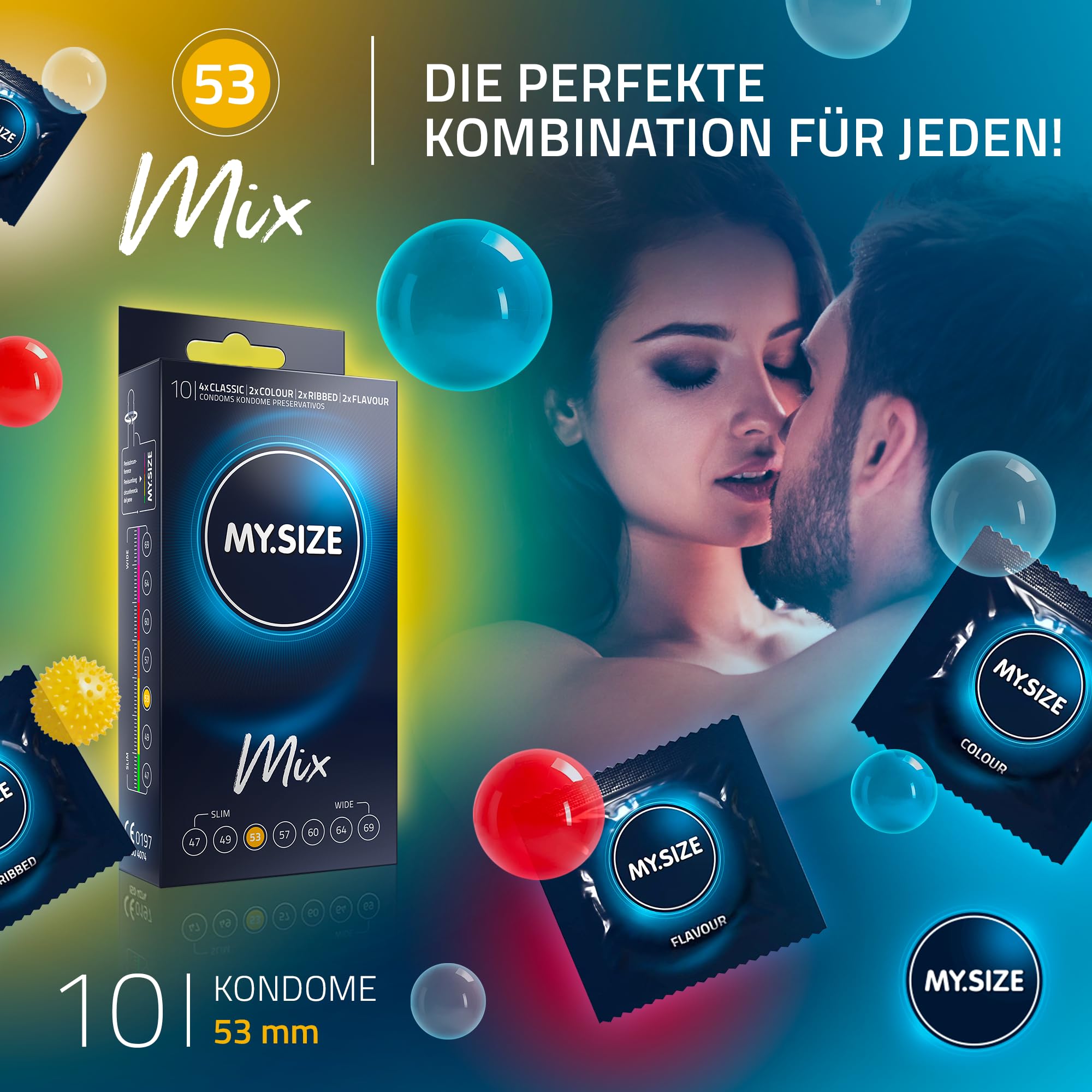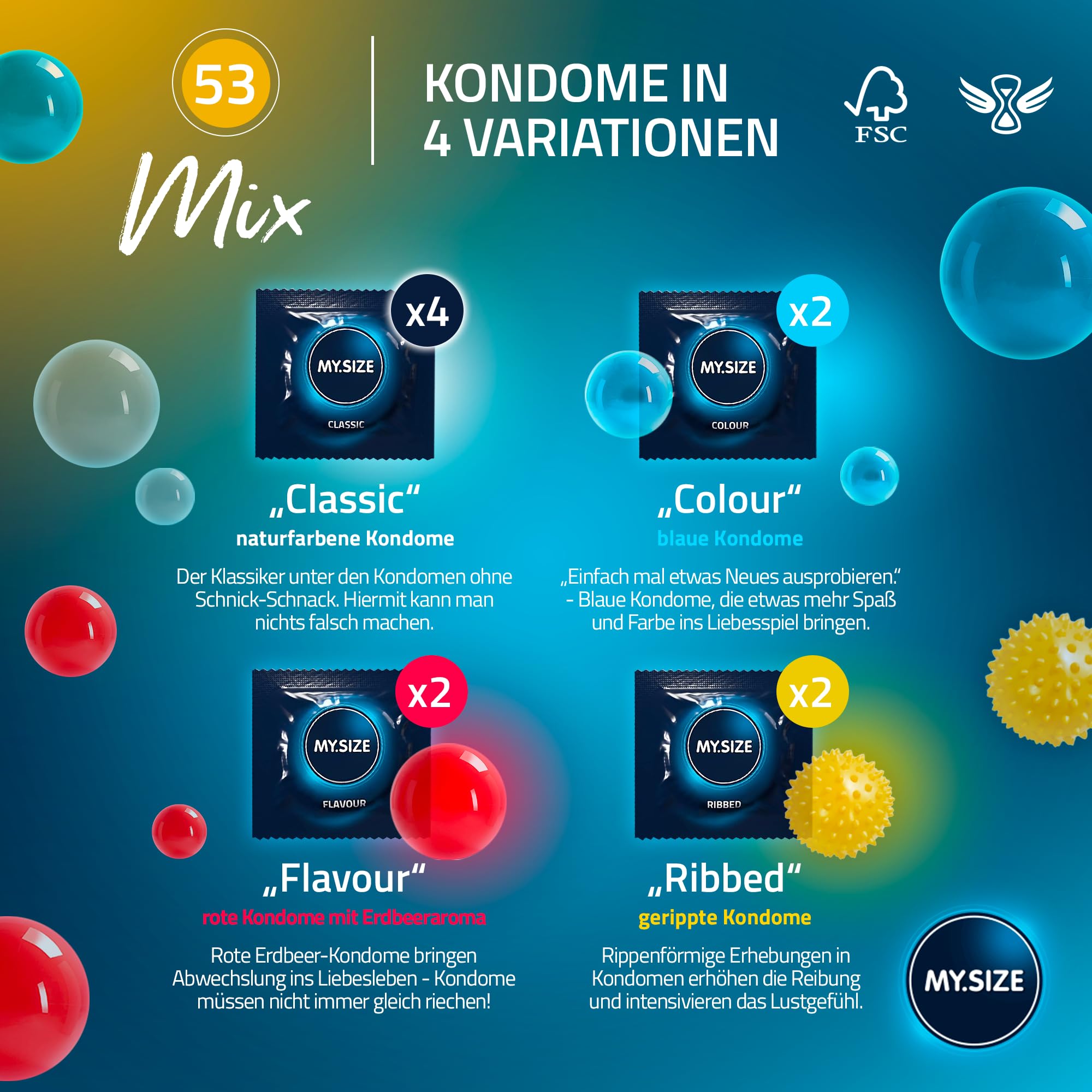 My.Size Mix Kondome Grösse 3, 53 mm, Standardpackung, | 10 Stück | Condome in 4 aufregenDen Sorten, mit Aroma, Farbe, Genoppt & Classic