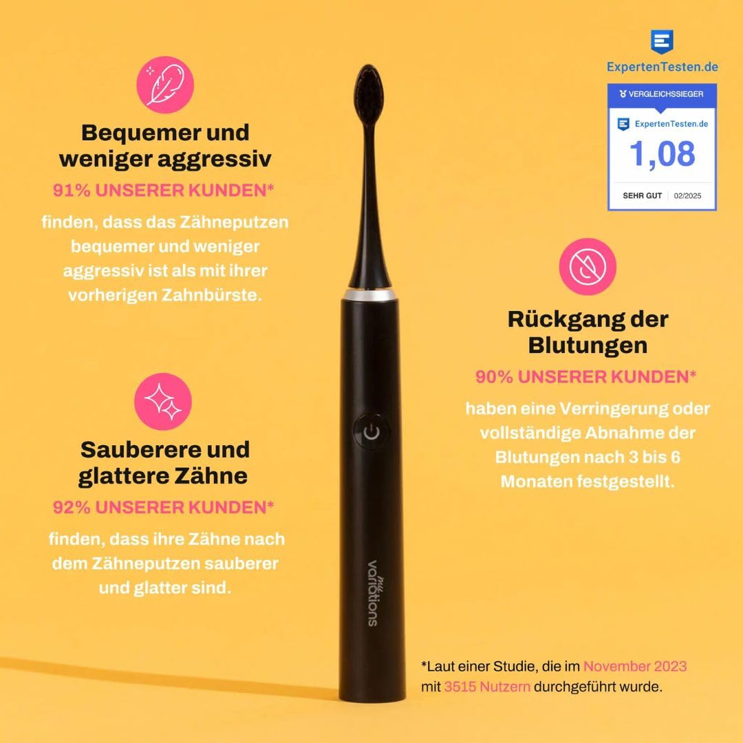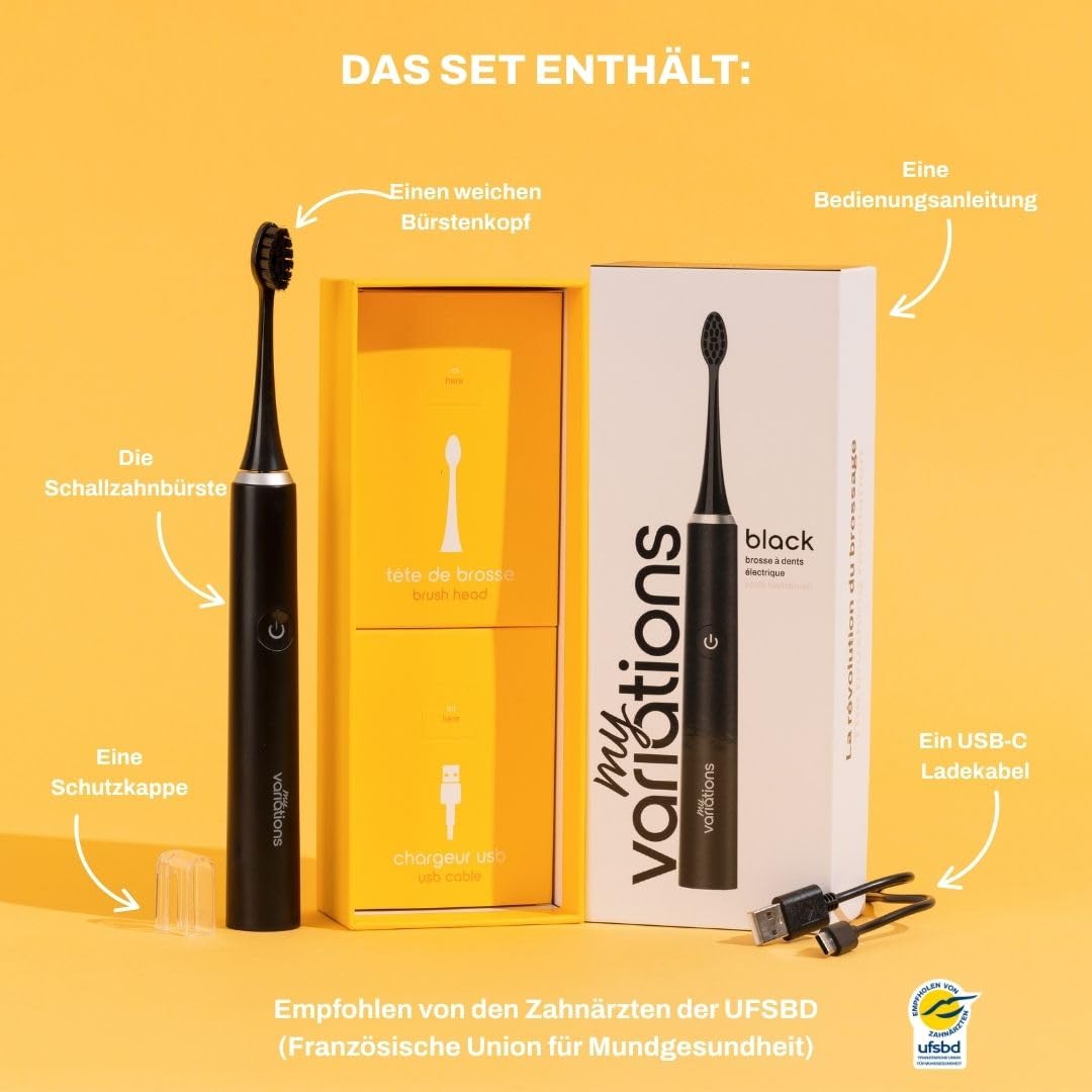????【 AKKULAUFZEIT VON EINEM MONAT 】: Geniessen Sie eine elektrische Zahnbürste mit einer aussergewöhnlichen Akkulaufzeit von 30 Tagen (bei 2 x 2 Minuten Putzen pro Tag). ????【 KRAFTVOLLE UND SANFTE SCHALLTECHNOLOGIE 】: Mit 40.000 Vibrationen pro Minute reinigen Sie Ihre Zähne gründlich, ohne das Zahnfleisch zu belasten. Die Schalltechnologie erzeugt Mikro-Wasserblasen für eine optimale Reinigung, ohne das Zahnfleisch zu schädigen. ⏲️【 INTEGRIERTER 2-MINUTEN-TIMER 】: Putzen Sie effektiv mit dem intelligenten 2-Minuten-Timer und 30-Sekunden-Erinnerungen zum Seitenwechsel. Die Bürste stoppt automatisch nach 2 Minuten. ✨【 5 PUTZMODI 】: Wählen Sie aus 5 Putzmodi, die auf all Ihre Bedürfnisse abgestimmt sind – von empfindlichem Zahnfleisch bis hin zu einer Tiefenreinigung. Alles einfach über eine Taste steuerbar. ????【 VON ZAHNÄRZTEN EMPFOHLEN 】: Offiziell empfohlen von den Zahnärzten der Französischen Union für Mundgesundheit, dem grössten Verband von Zahnärzten in Frankreich. ????【 AUCH FÜR KINDER ERHÄLTLICH 】: Die MyVariations-Zahnbürste ist auch in einer Kinder-Version erhältlich, geeignet ab 3 Jahren! ????【 2.452 WEICHE DUPONT-NYLON-BORSTEN 】: Der Bürstenkopf von MyVariations ist mit 2.452 weichen Dupont-Nylon-Borsten ausgestattet – für maximale Effizienz und zugleich sanft bei empfindlichen Zähnen.