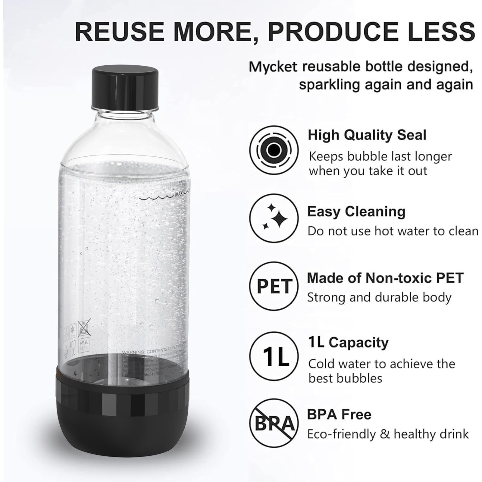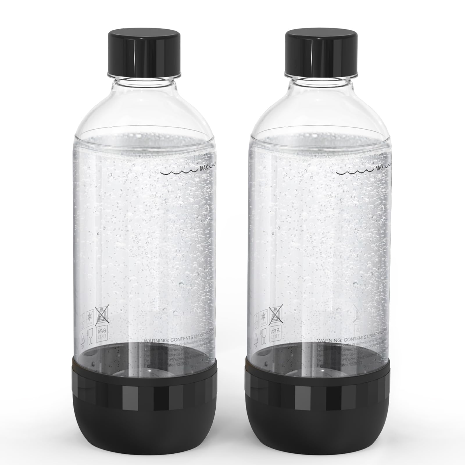 Mycket Soda Maker Flaschen, 2 x 1L Carbonating Bottles, BPA-frei Kohlensäureflaschen, Wiederverwendbare PET-Sprudelwasserflaschen, Ersatzflaschen für Soda-Maschine, Schwarz