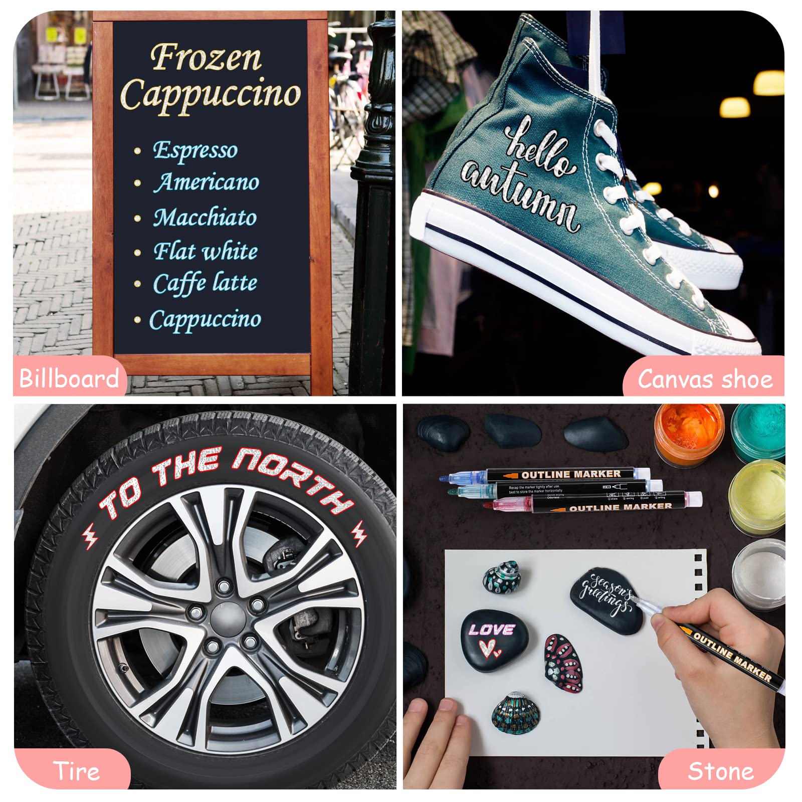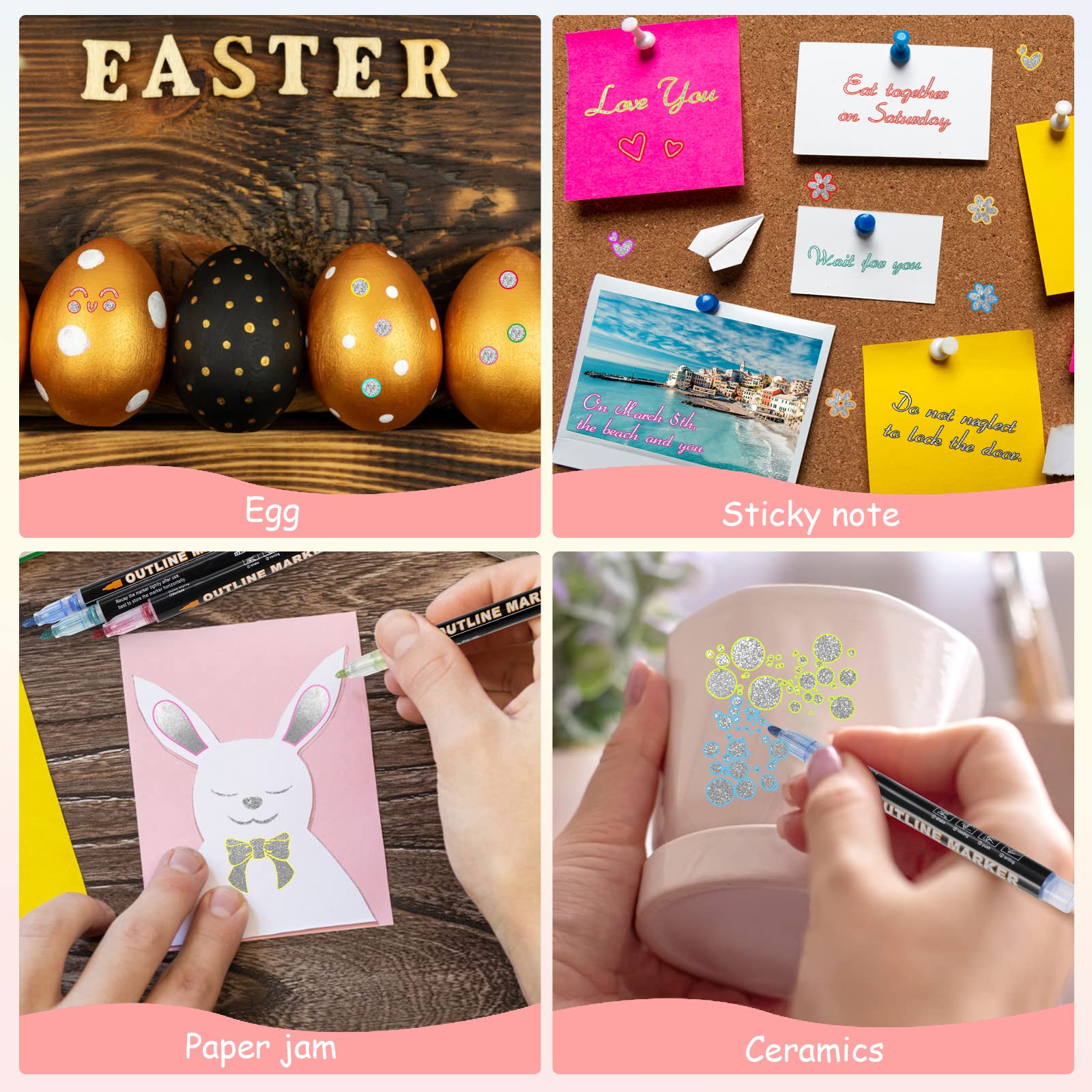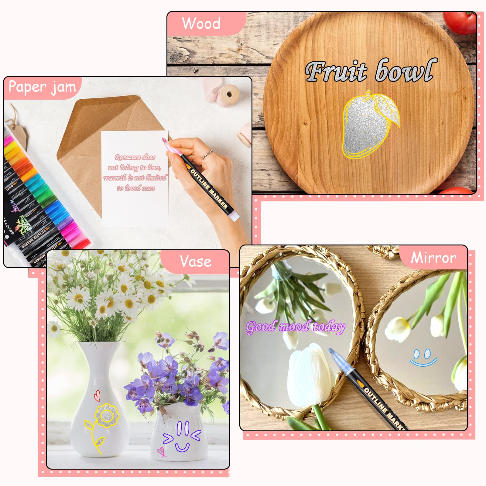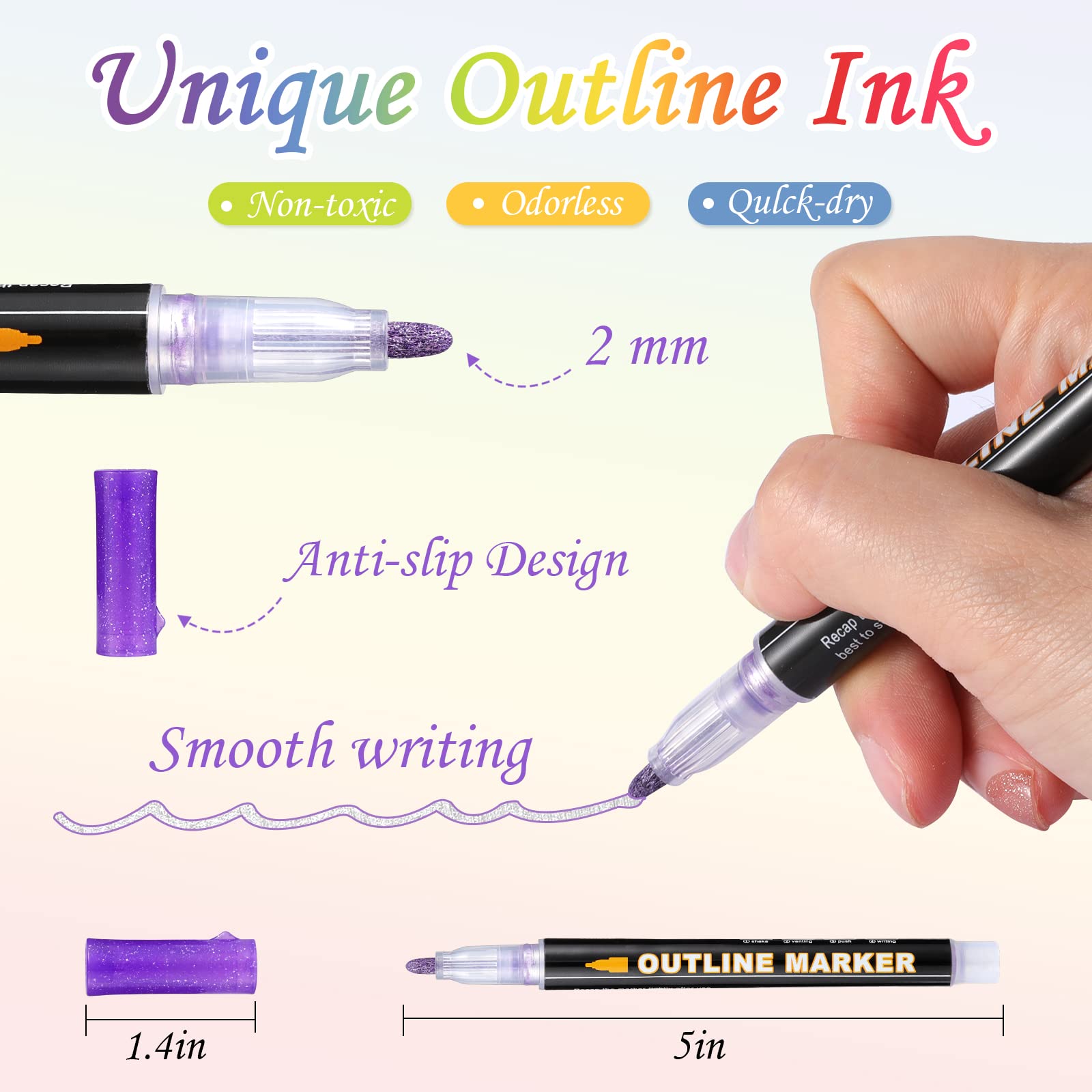 Metal line-contour paint marking set, including 24 vivid glitter colors. Diese Selbst-Kontur-Marker sind in lebendigen Metallic-Silber mit einem bunten Rand um sie herum geschrieben.einzigartige Technologie erzeugt automatisch Konturen für Sie, um schöne zweifarbige Effekte zu erstellen und auch die Linien, die Sie schreiben, werden sehr glatt sein.die Tinte Haftung ist auch sehr gut