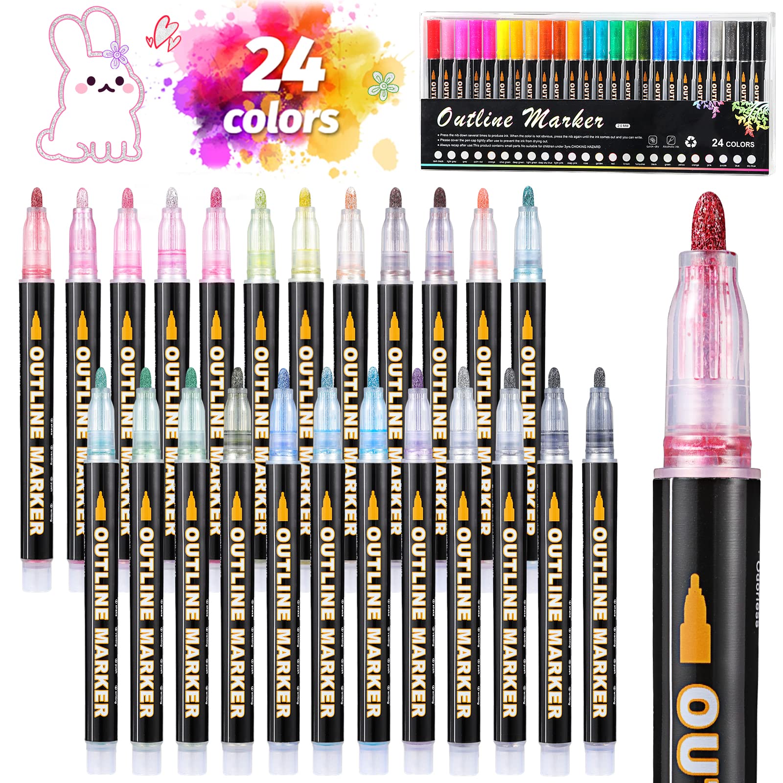 Mzh Art Double Line Metallic Markers 24 Farben Outline Stifte Glitzerstifte für die Gestaltung Ihrer eigenen Fotoalbum, Gästebuch, Scrapbook