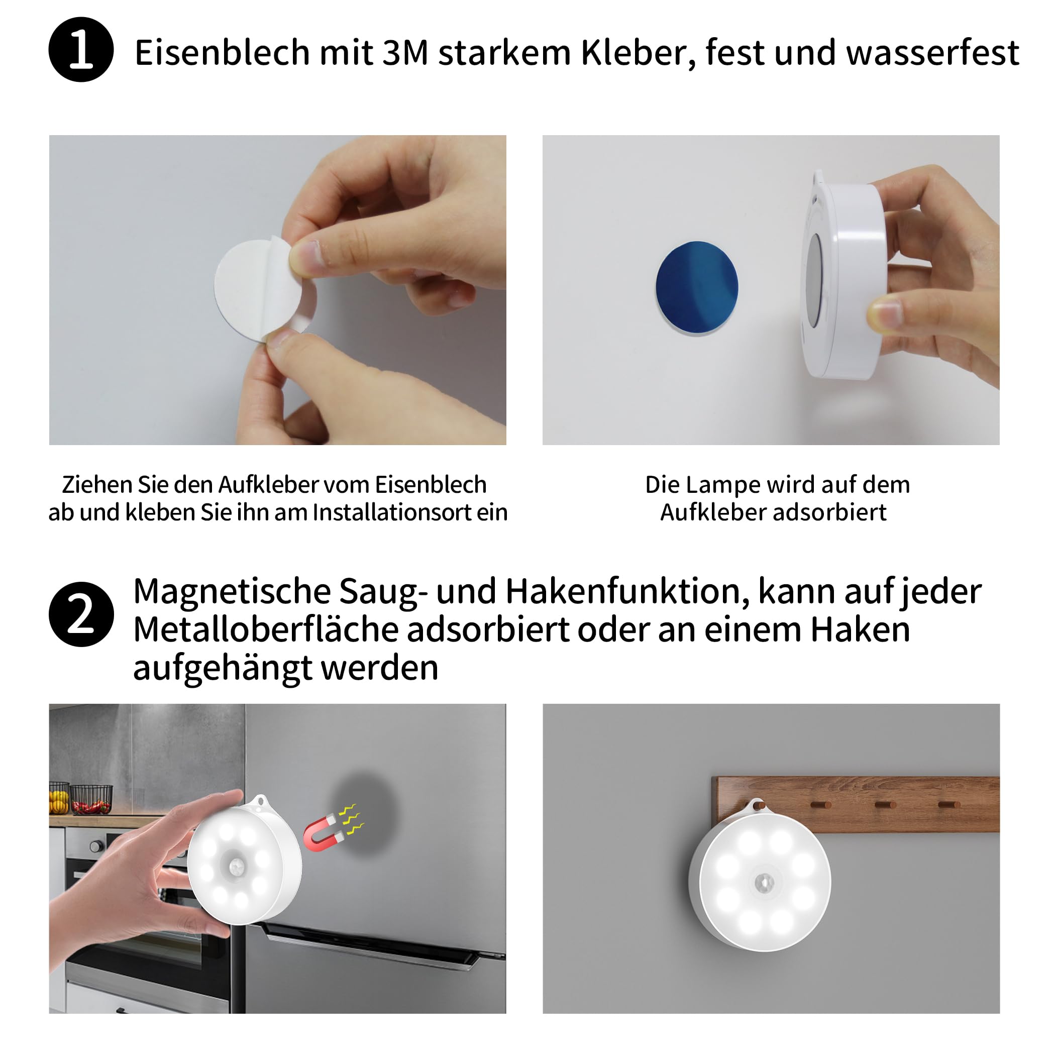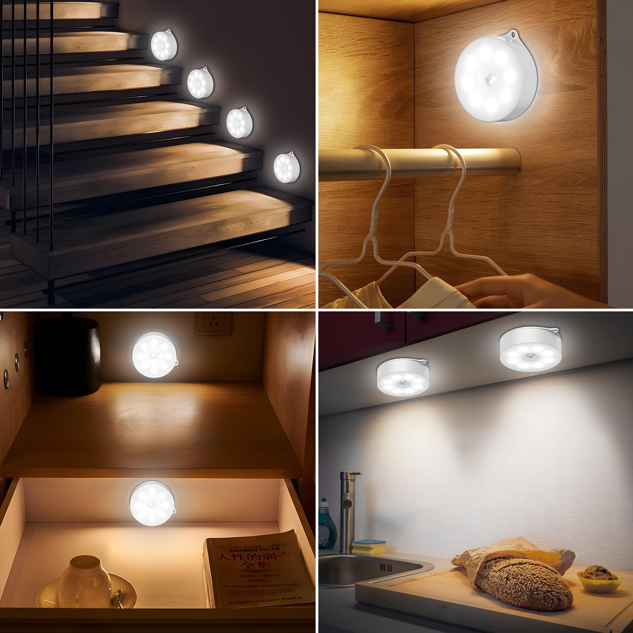 - Weit Verbreitet:Die tragbare dieser Puck-Leuchten mit Bewegungssensor macht sie ideal, um überall dort zusätzliches Licht hinzuzufügen, wo Sie es benötigen, von Küchen und Schlafzimmern bis hin zu Treppen, Kellern, Dachböden, Garagen, Schränken, Schubladen, und mehr.
