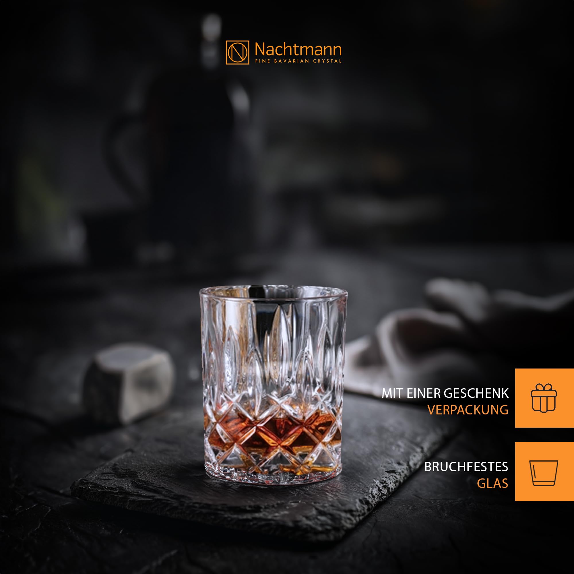 FORMSCHÖNES DESIGN- Präsentieren Sie Ihre Spirituosen ideal zu jeder Tischplatte oder Bar in den edlen Whisky-Gläsern und dem Dekanter der Noblesse-Serie. Besondere Abende oder Cocktailpartys erhalten ein gewisses Flair dank des zeitlosen Schliffs der Kristallgläser. Die Verschmelzung von Funktionalität und Tradition verleiht ein funkelndes Ambiente- Ein Abend der etwas ganz besonderes wird. Ihre klassischen Spirituosen, wie zum Beispiel der Whisky oder Vodka werden edel-luxuriös hergerichtet. -NOBLESSE SERIE- Die Noblesse-Serie bringt einen Hauch von Luxus zu Ihnen nach Hause. Ästhetisch und schön aus feinstem Kristall geschnitten, sind die Longdrinkgläser unter allen anderen ein echtes „must have“, die neuen Glanz in Ihre Hausbar bringen. Ideal geeignet für festliche Abende wie: Candle Light Dinner, Familienfeiern, festliche Tafeln oder gemütliche Cocktail-Abende. -EINFACHE REINIGUNG- Die Longdrinkgläser lassen sich einfach reinigen und sind spülmaschinenfest. Dank der Anwendung des speziellen Platinum-Glas-Prozesses und der Verarbeitung reinster Zutaten, wie Pottasche, Sand und Metalloxid, sind sie äusserst bruchfest und brillanter als andere Gläser. Hinweis: Auch die häufige Reinigung in der Spülmaschine beeinträchtigt nicht die Qualität der Gläser in Farbe, Glanz oder Brillanz der Oberfläche. -QUALITÄT ,, MADE IN GERMANY‘‘- Mit dem Blick auf die Vergangenheit gestaltet Spiegelau & Nachtmann aktiv die Zukunft. Auf der Basis einer Handwerkstradition, die bereits 180 Jahre zurückreicht, werden umweltgerechte Produktionsverfahren in einer der modernsten Produktionsanlagen Europas entwickelt. In bester deutscher Tradition wird die Verbindung aus Handwerkskunst, strengster Qualitätskontrolle, neuen Technologien und der Leidenschaft für Perfektion geschaffen.