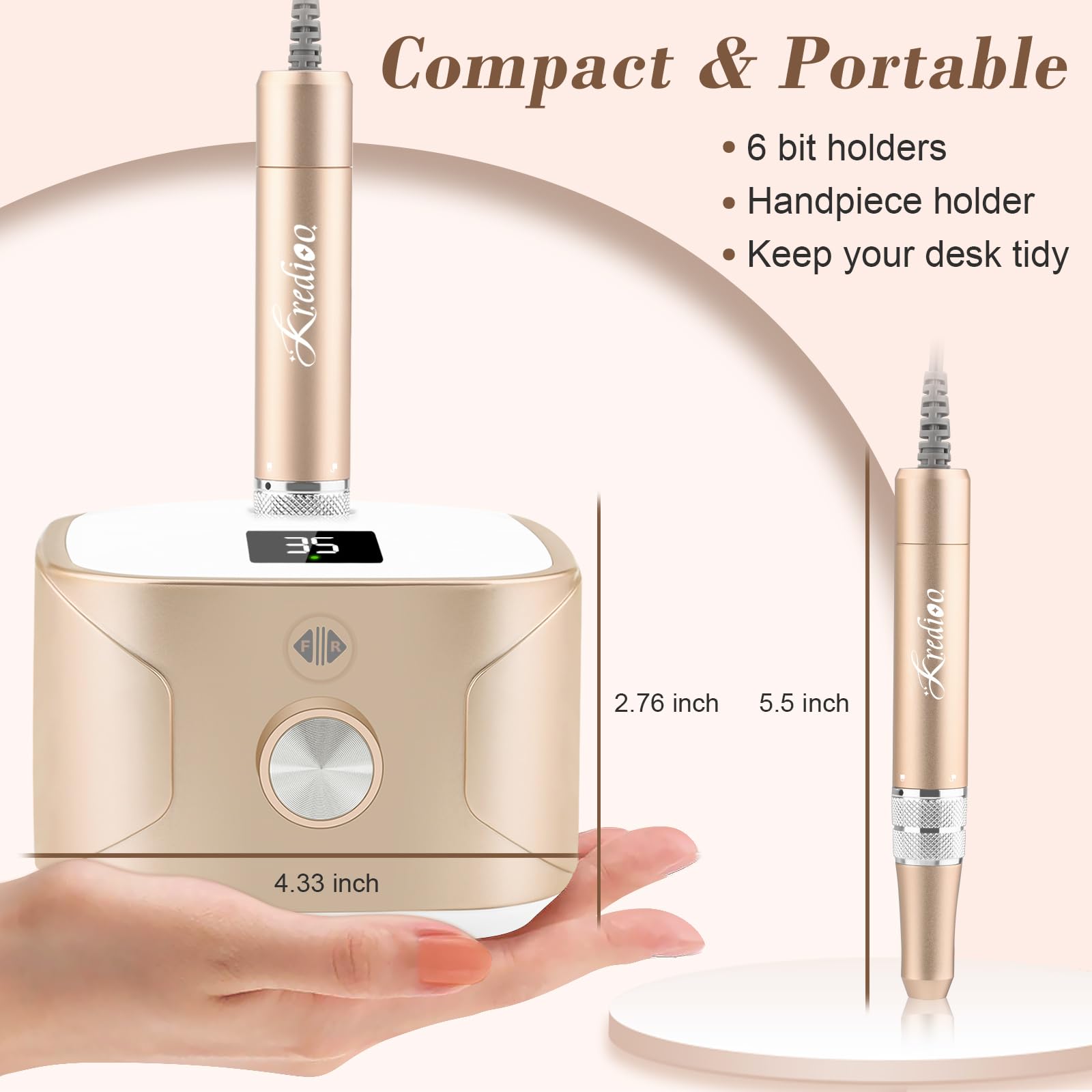 Der Kredioo Nagelfraeser ist ein professionelles elektrisches Manikuere und Pedikuere Geraet fuer die Anwendung im Salon oder zu Hause. Er eignet sich zum Bearbeiten von Gelnaegeln, Acrylnageln und Naturnaegeln und richtet sich an Anfaenger wie auch erfahrene Anwender.