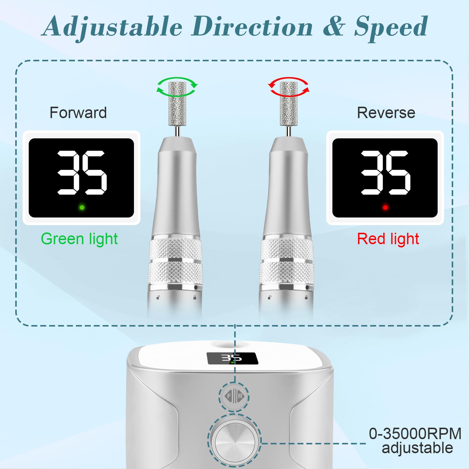 Der Nagelfraeser verfuegt ueber eine einstellbare Drehzahl von bis zu 35'000 Umdrehungen pro Minute. Eine hochaufloesende Digitalanzeige zeigt sowohl die aktuelle Geschwindigkeit als auch die Drehrichtung an und ermoeglicht eine kontrollierte Anpassung an unterschiedliche Anwendungen und Materialien.