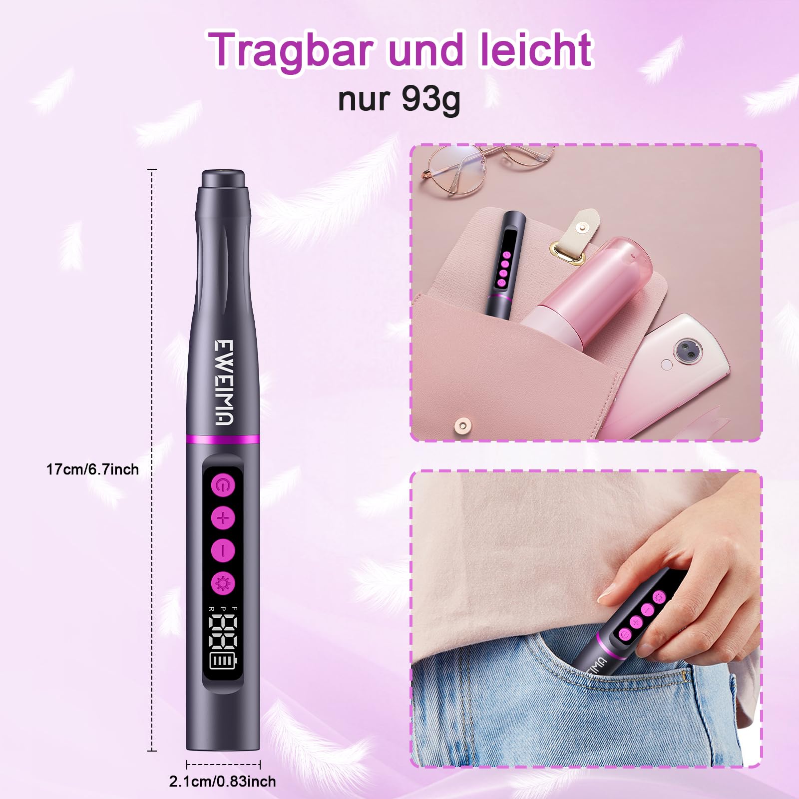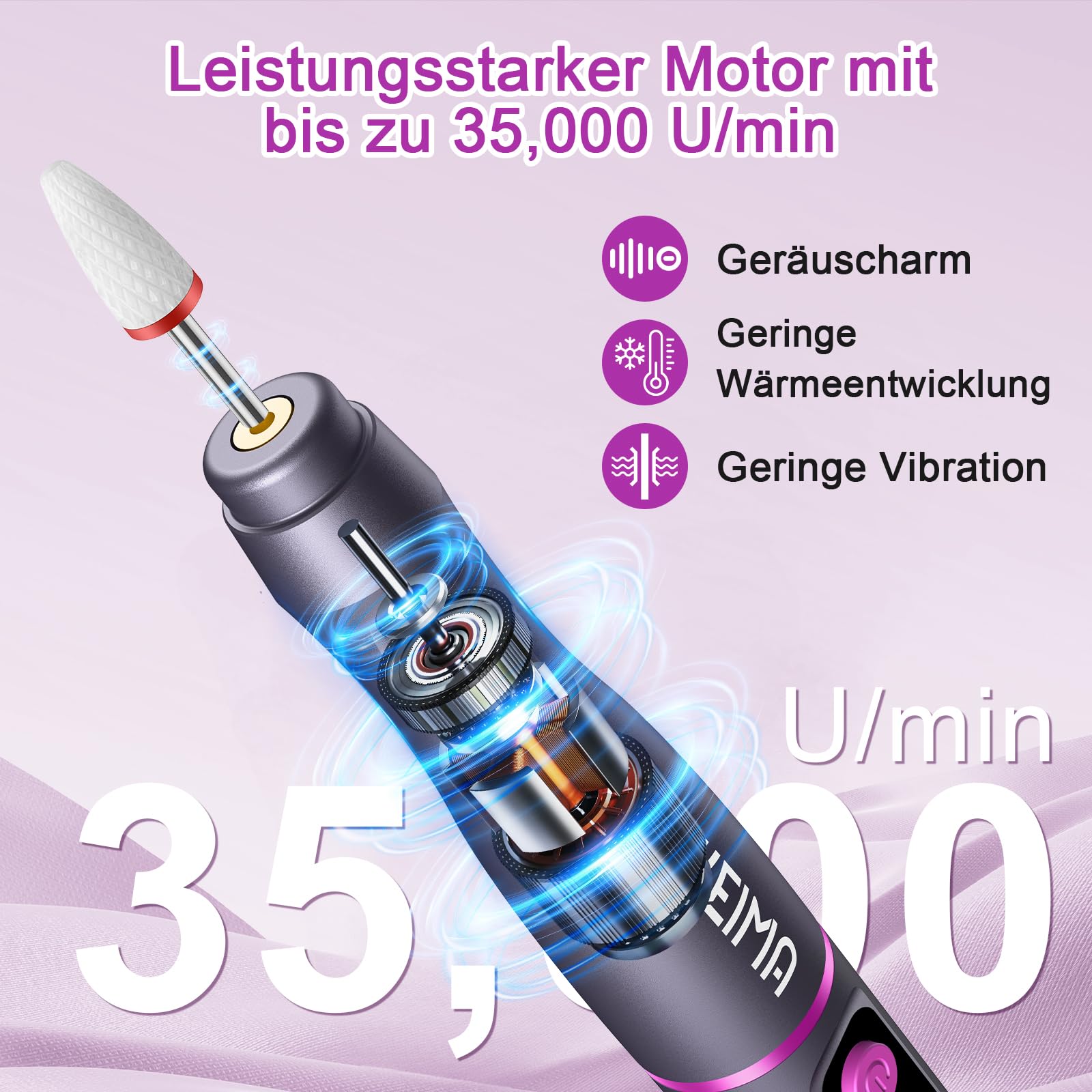 EWEIMA Kabelloser Nagelfraeser 35000 u/min 1000 mAh mit 66 Schleifbaendern Grau