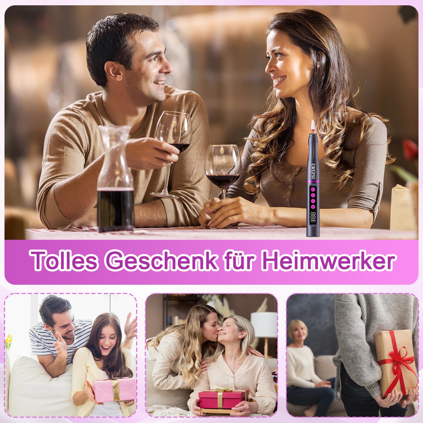 Dieser elektrische Nagelfraeser ist ein vielseitiges Werkzeug fuer die Manikuere und Nagelpflege. Er eignet sich zum Schleifen, Abtragen und Polieren von Naegeln sowie zum Entfernen von Gel Nagellack, Nagelhaut und abgestorbener Haut und ist fuer Heimanwender und den mobilen Einsatz konzipiert.