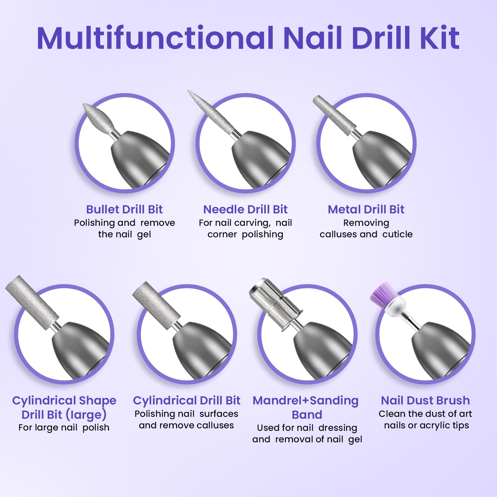 Der elektrische Nagelfraeser unterstuetzt das Formen, Glaetten und Polieren von Natur- und Kunstnaegeln sowie das Entfernen von Gel, Acryl und Nagellack. Die mitgelieferten Fraeseraufsaetze und Schleifbaender decken unterschiedliche Pflegebeduerfnisse ab und ermoeglichen vielseitige Anwendungen mit einem Geraet.