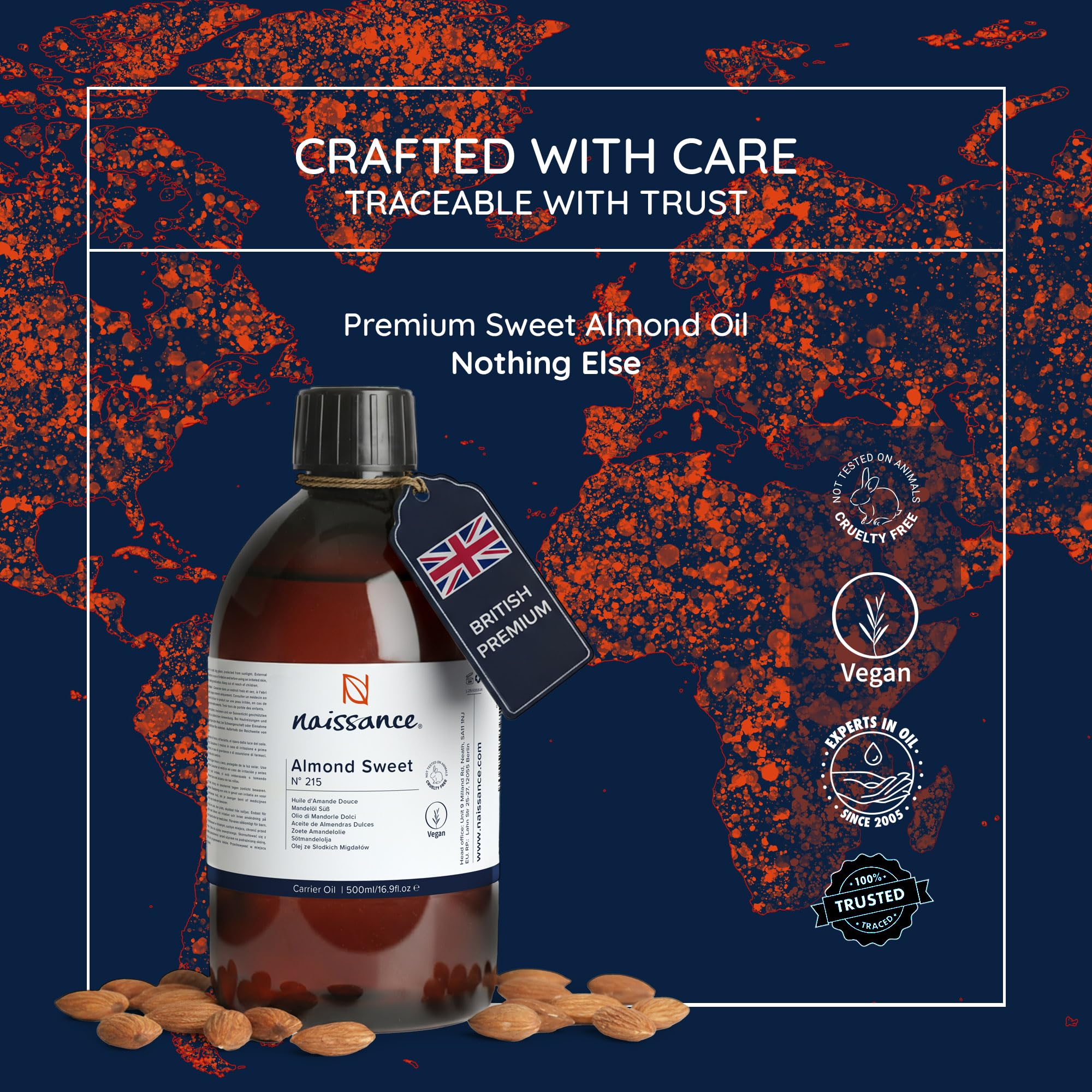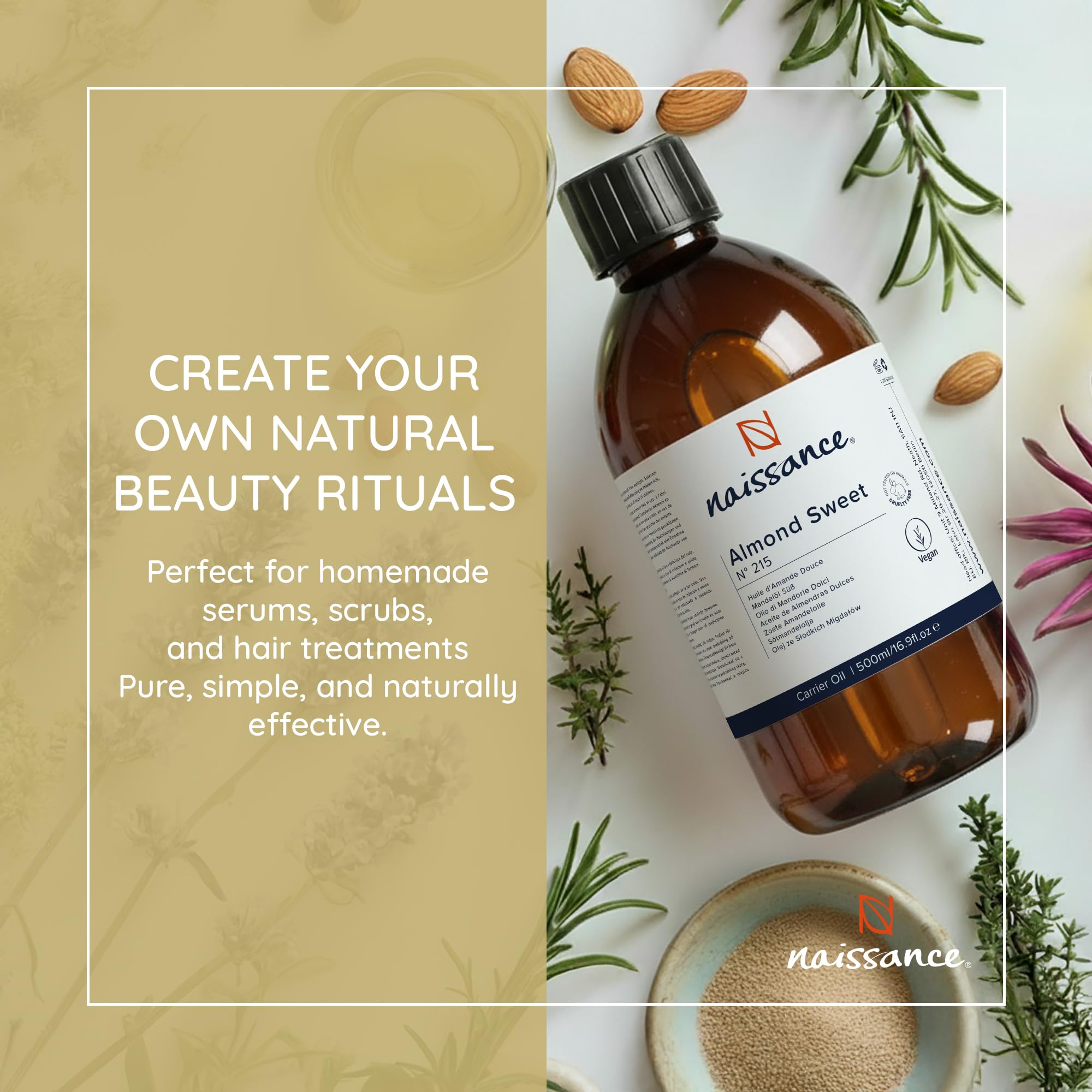 Naissance Natürliches Süsses Mandelöl (Nr. 215) 500ml – Vegan, Gentechnikfrei – Ideal zur Haar– und Körperpflege, für Aromatherapie und als Basisöl für Massageöle