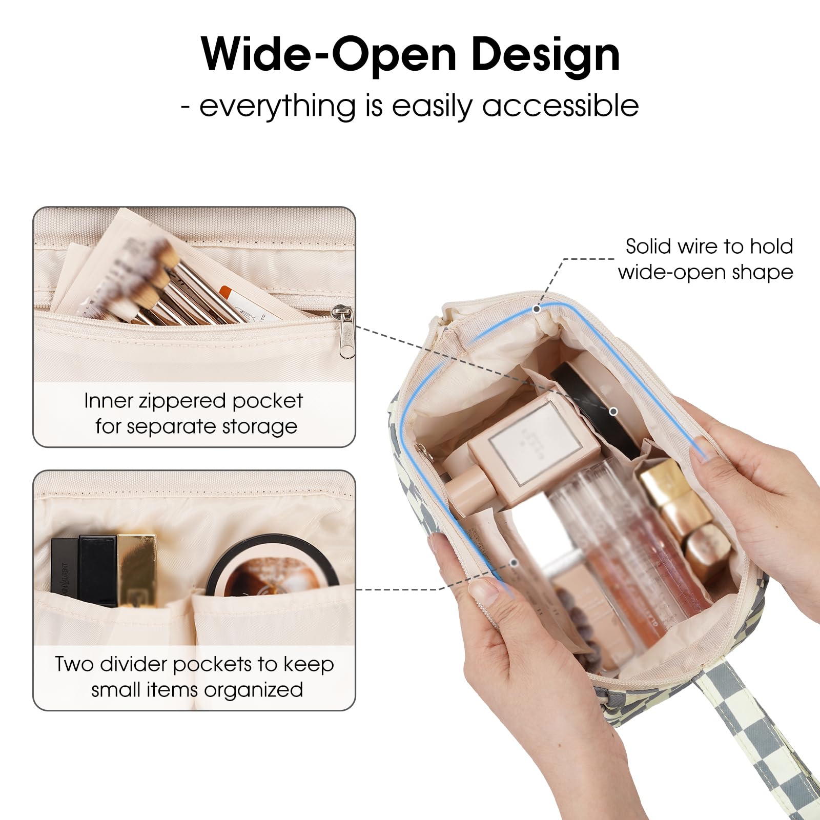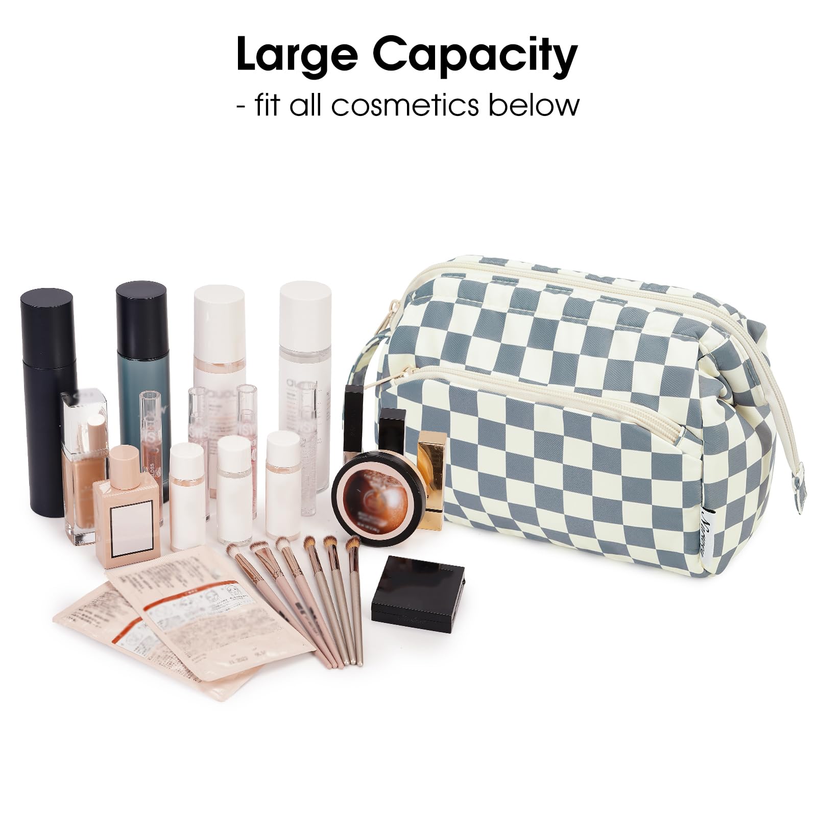 Die Narwey Kulturtasche für Damen überzeugt durch ihr stilvolles graublaues Gitterdesign, eine besonders weit offene Taschenform und eine durchdachte Innenstruktur. Diese Kosmetiktasche wurde speziell für Frauen entwickelt, die ihre Make-up- und Pflegeprodukte auf Reisen oder im Alltag übersichtlich, griffbereit und sicher aufbewahren möchten.