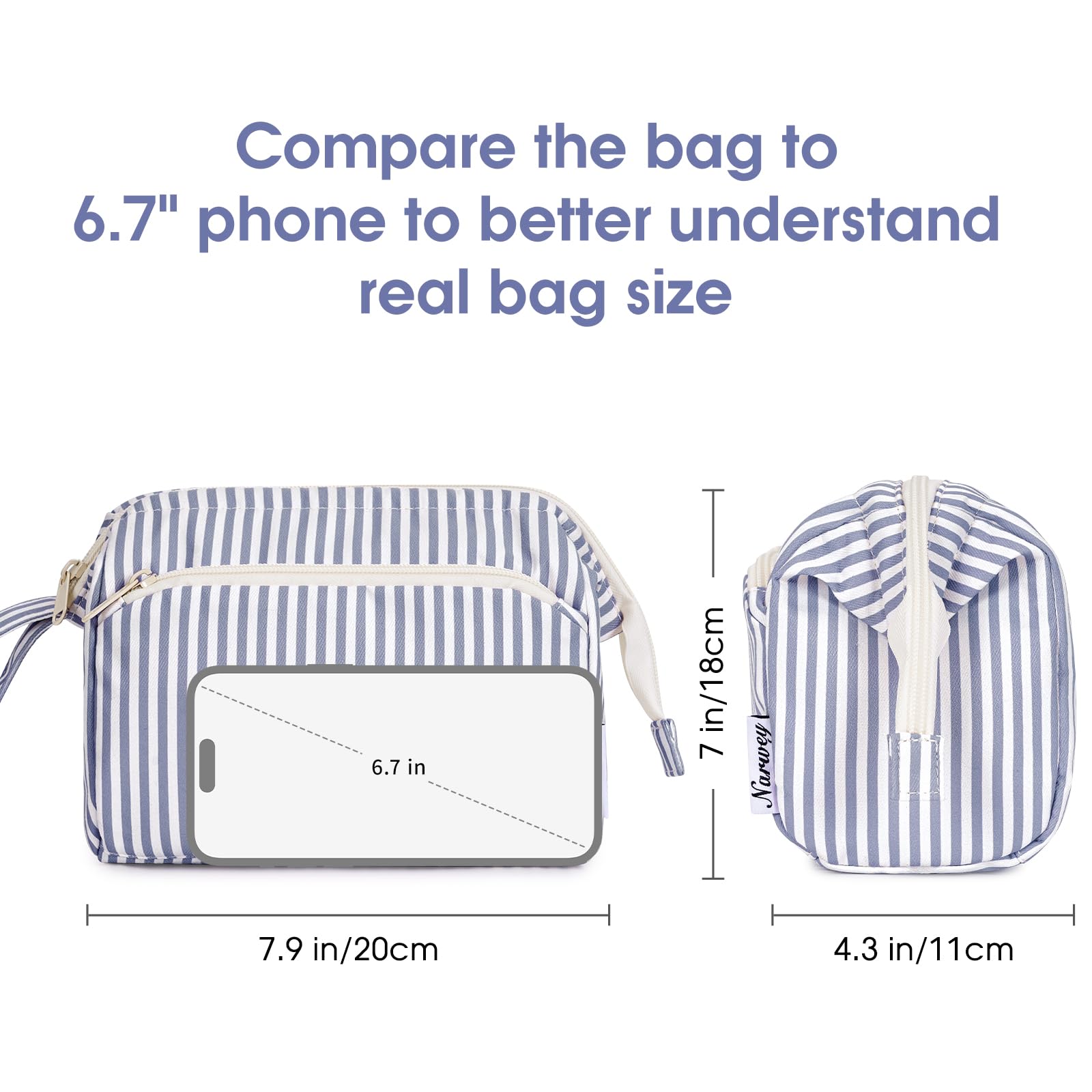 Die Narwey Kulturtasche für Damen verbindet ein elegantes graublaues Streifen-Design mit einer besonders weit offenen Taschenform und durchdachter Funktionalität. Diese hochwertige Kosmetiktasche ist perfekt für Frauen, die ihre Make-up- und Pflegeprodukte im Alltag und auf Reisen übersichtlich, griffbereit und sicher organisieren möchten.