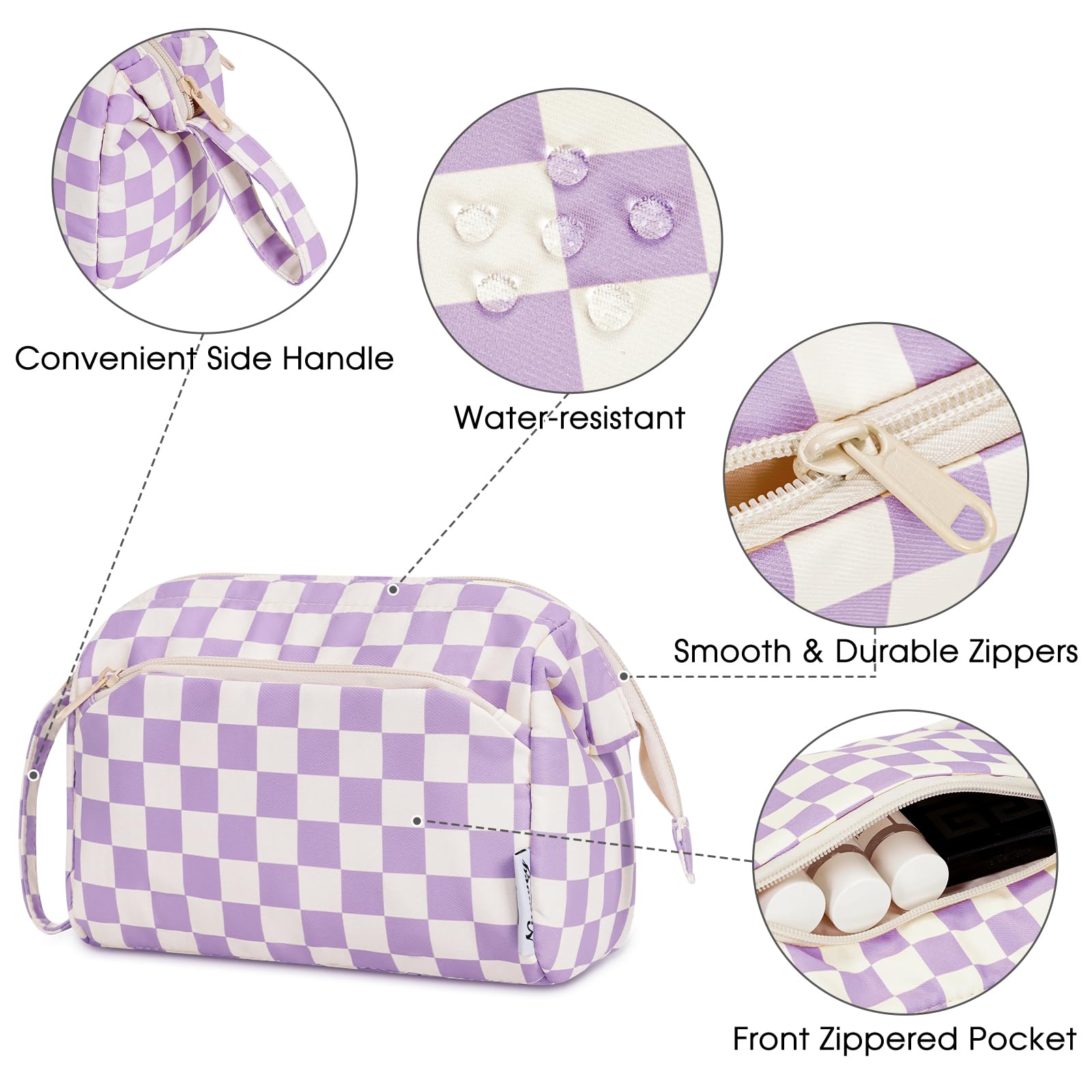 Die Narwey Kulturtasche für Damen kombiniert ein stilvolles lila Gitterdesign mit einer besonders weit offenen Taschenform und hoher Alltagstauglichkeit. Diese durchdachte Kosmetiktasche ist ideal für Frauen, die ihre Make-up- und Pflegeprodukte auf Reisen oder im Alltag übersichtlich, griffbereit und sicher organisieren möchten.