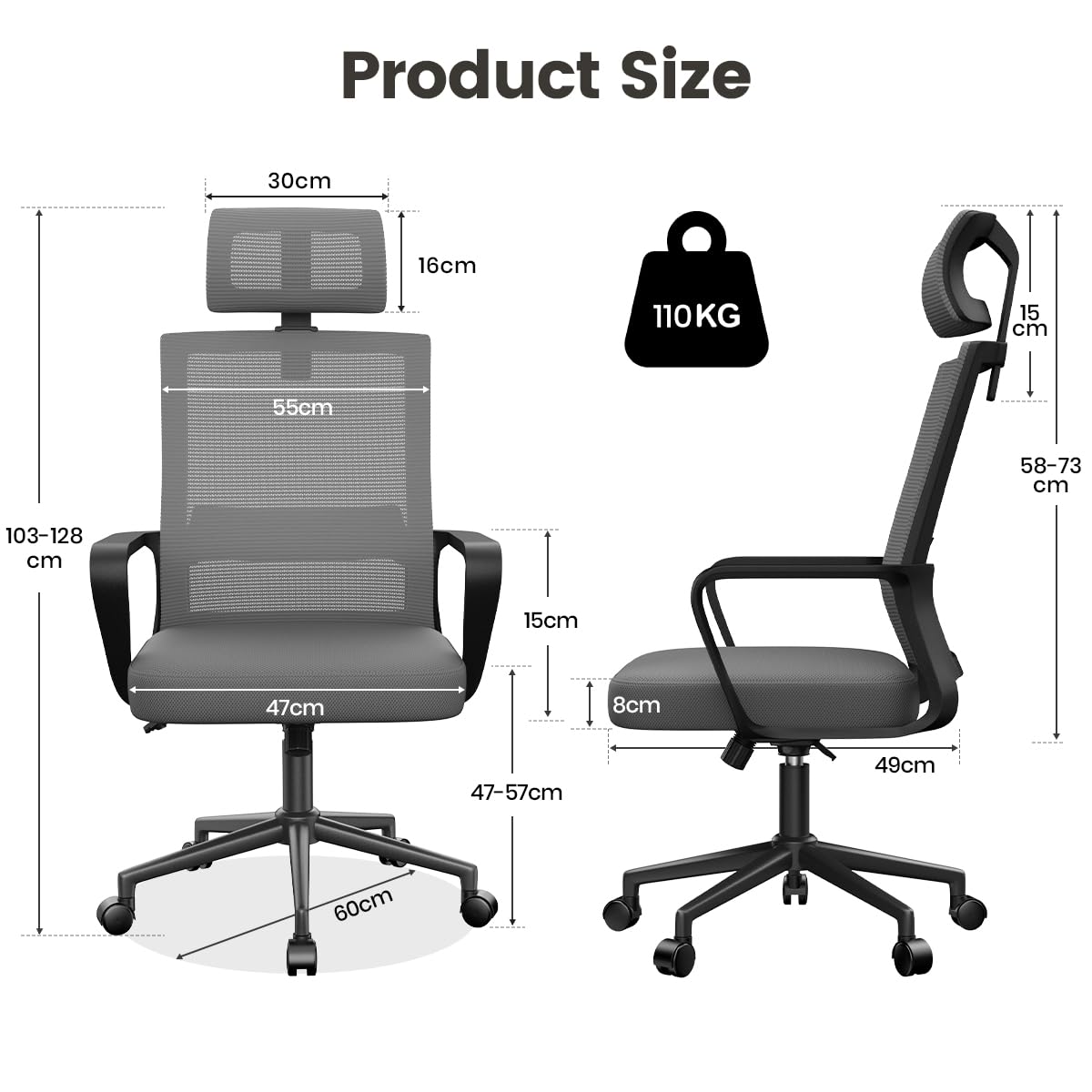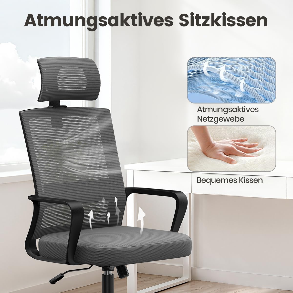 naspaluro Ergonomischer Bürostuhl, Schreibtischstuhl mit Verstellbarer Kopfstütze, Atmungsaktiver Netzbezug, Höhenverstellbar, Computerstuhl, 360° Drehstuhl für das Zuhause und Büro, Dunkelgrau