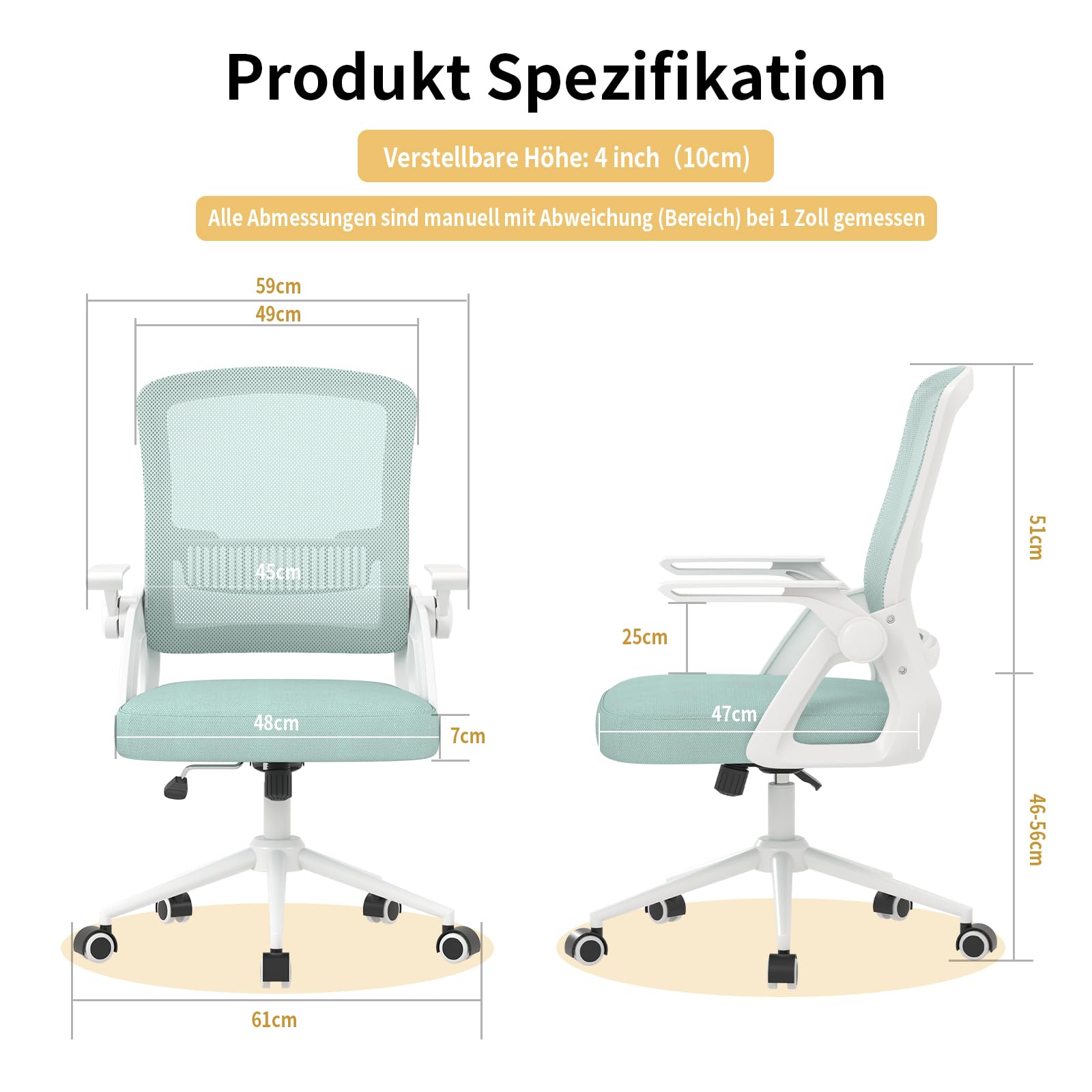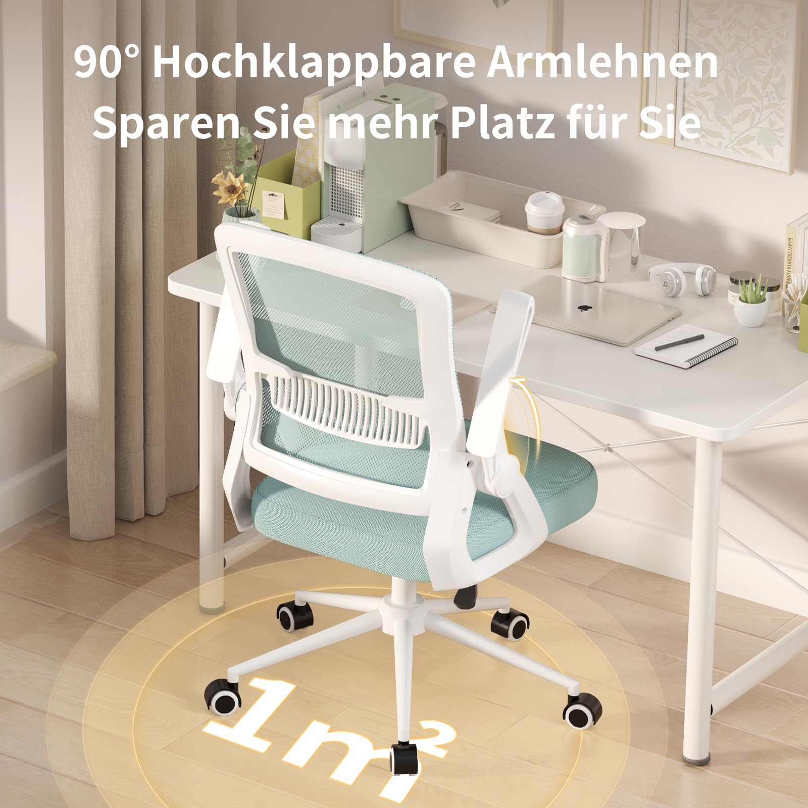 naspaluro Bürostuhl mit Hochklappbare Armlehnen, Schreibtischstuhl Ergonomisch, Drehstuhl mit Netzbespannung, Lordosenstütze, Höhenverstellbarer, Wippfunktion, Gepolstertem Sitzkissen, Grün
