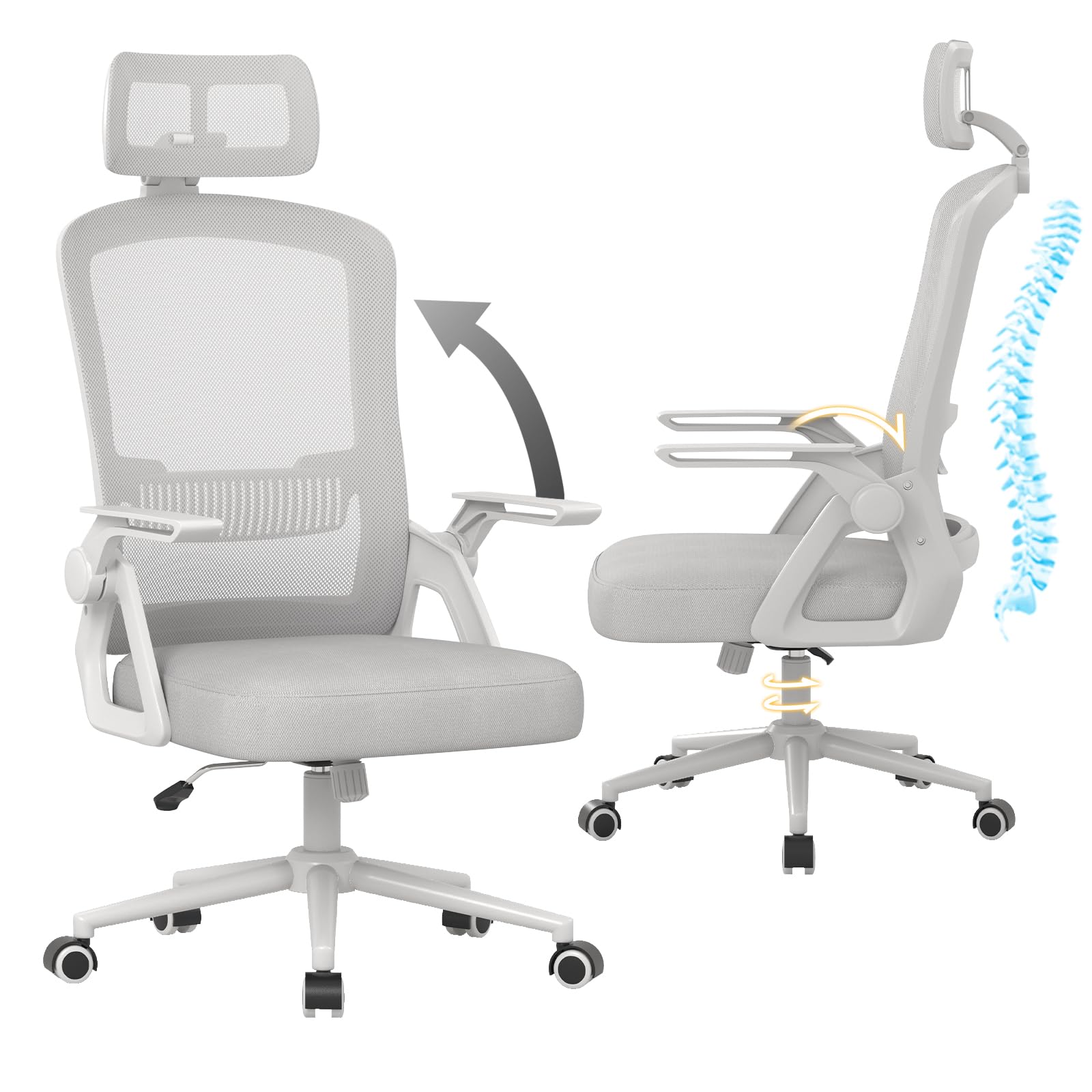 naspaluro Bürostuhl Ergonomisch mit Verstellbarer Armlehnen, Schreibtischstuhl mit Kopfstütze, Atmungsaktiver Netzbespannung, Lordosenstütze, Höhenverstellung Computerstuhl, 360° Drehstuhl, Grau, Stil: Mit Kopfstütze, Farbe: Grau-1