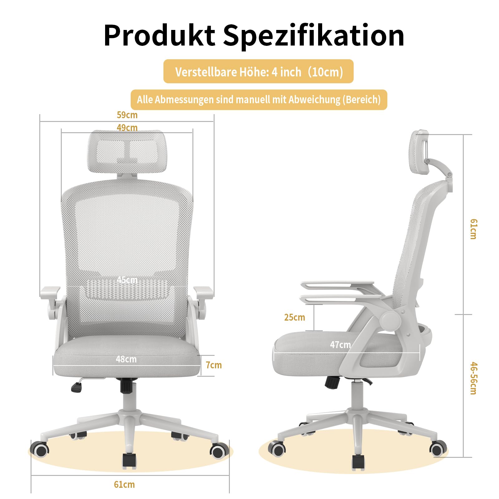 Dieser Schreibtischstuhl Ergonomisch ist aus einem hochwertigen, atmungsaktiven Netzmaterial gefertigt, das Ihren Rücken auch nach stundenlangem Sitzen kühl hält. Das Kissen des drehstuhl besteht aus hochdichtem Schwamm, der weich und hautfreundlich, ungiftig und unschädlich ist und auch nach langem Sitzen nicht ermüdet. Der Computerstuhl verfügt über eine multifunktionale Einstellung: 10 cm Höhenverstellung, Verstellbare Kopfstütze, 90°-105° Wippfunktion, die sich an verschiedene Höhen und Sitzhaltungen anpassen kann, was eine persönlichere und bequemere Erfahrung ermöglicht. Der Stuhl verfügt auch über verstellbare Armlehnen, sodass Sie den Bürostuhl nach der Arbeit einfach und platzsparend unter den Tisch schieben können. Das schlanke, moderne Design dieses Ergonomische Stuhl ist perfekt für Ihren Arbeitsplatz.