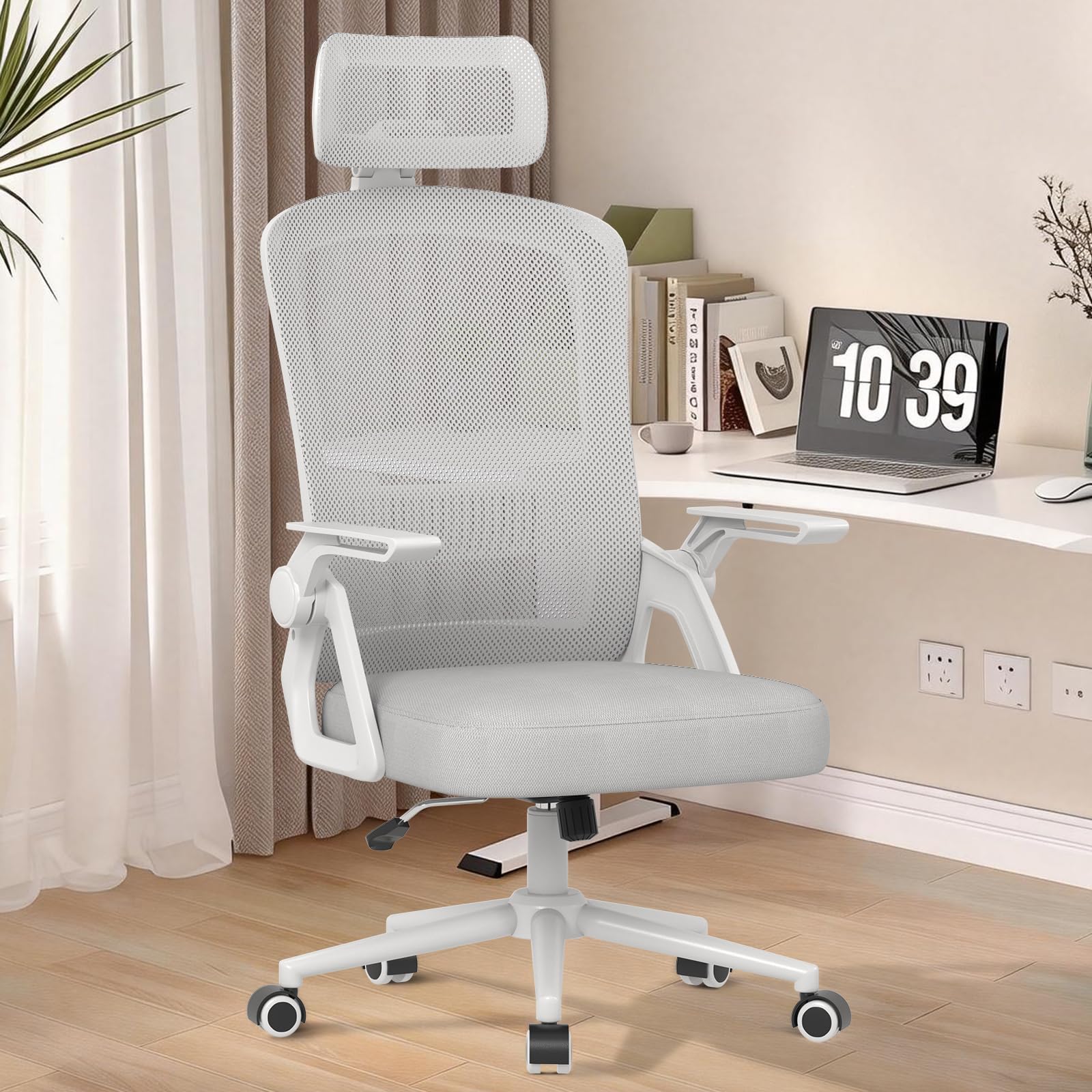 • 【90° Verstellbare Armlehne】Dieser Bürostuhl mit Kopfstütze ist mit verstellbaren Armlehnen ausgestattet, die sich um 90° umklappen lassen, sodass Sie den Bürostuhl nach der Arbeit einfach und platzsparend unter den Tisch schieben können.