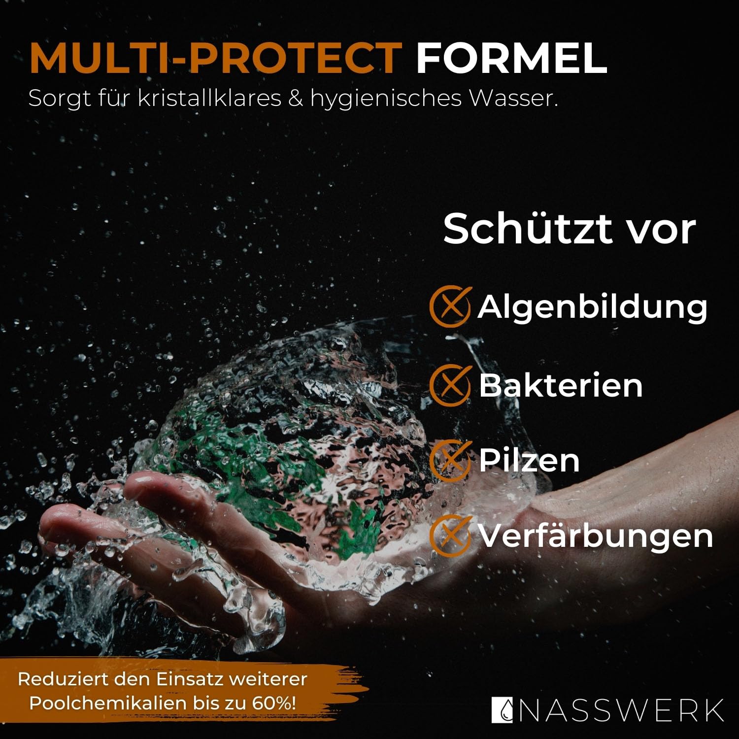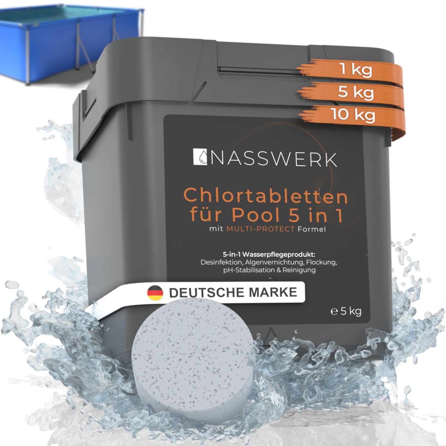 NASSWERK Chlortabletten für Pool 5 in 1 (5kg) | 200g Pooltabs Multitabs 5 in 1 mit Chlor, Algizid, pH Stabilisator, Flockungsmittel & Reiniger | Langzeit Multitabs Pool 200g für optimales Poolwasser