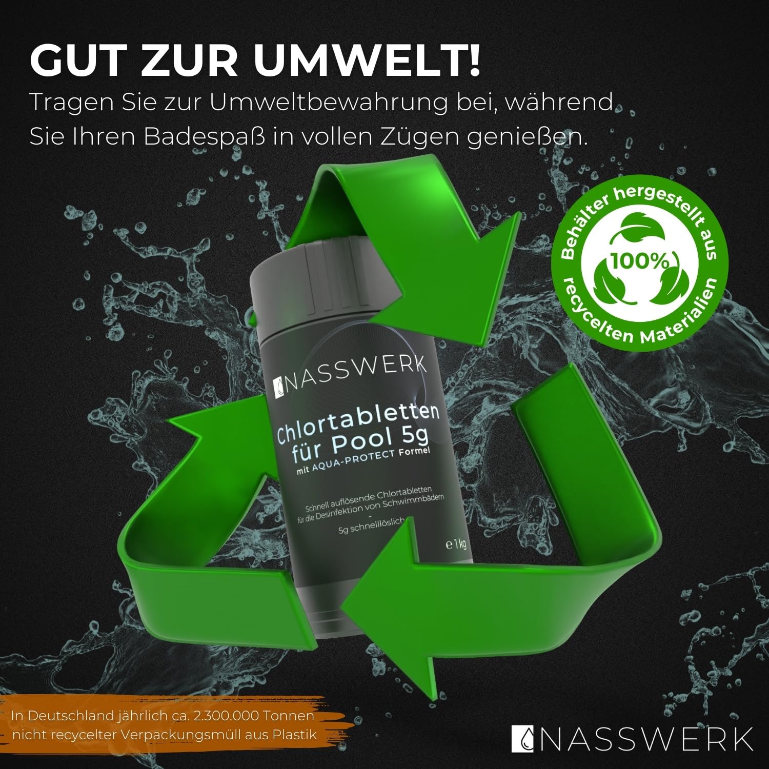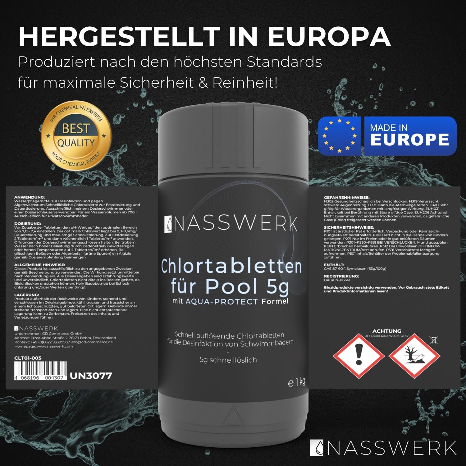 NASSWERK Mini Chlortabletten für Planschbecken 5g (1kg) | Chlortabs 5g schnelllöslich für Whirlpool & Pool | Reinigungstabletten zur Schockchlorung, Stosschlorung & Dauerdosierung | Chlor Tabs klein