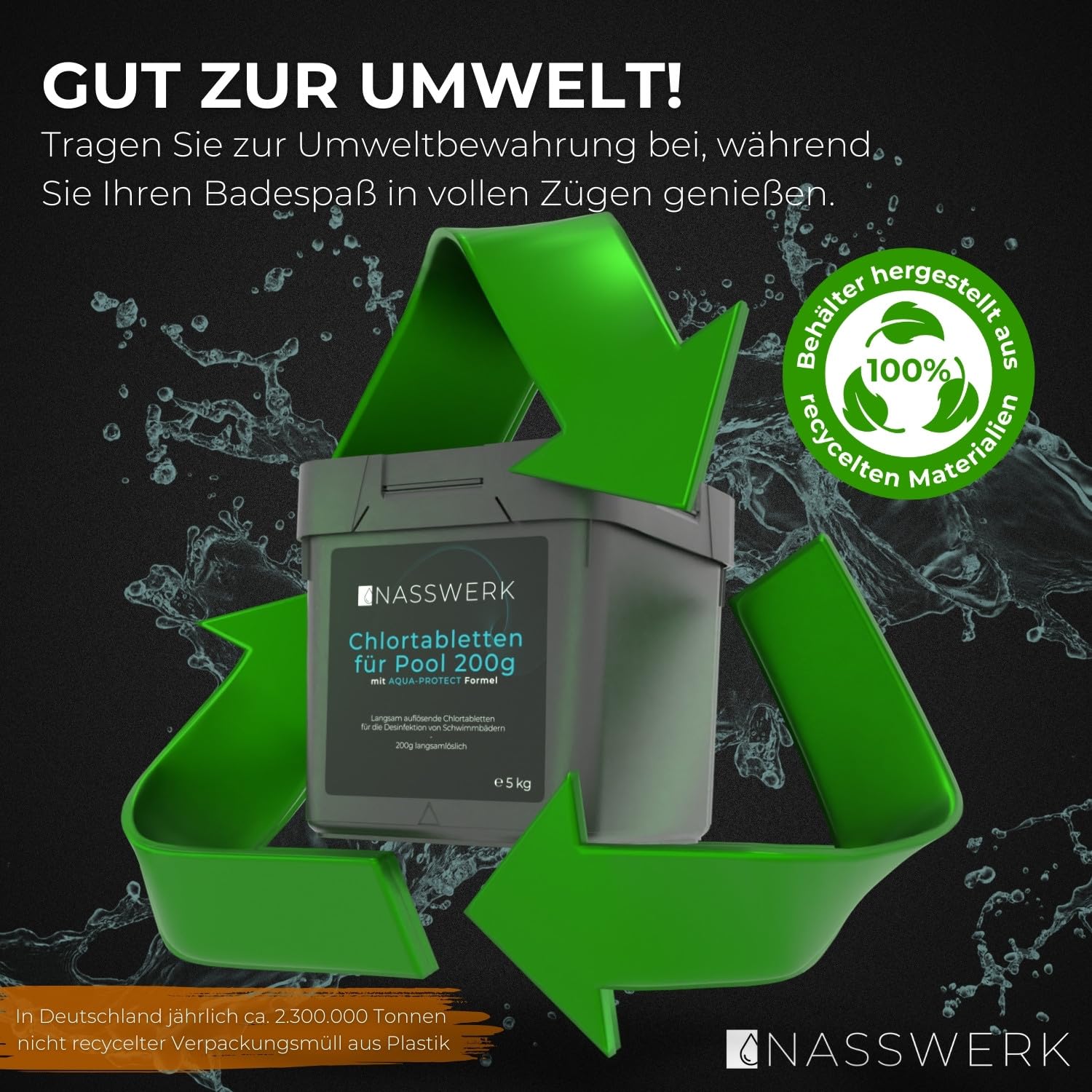 NASSWERK Pool Chlortabletten 200g (1kg bis 10kg) | Chlortabs 200g langsamlöslich zur Langzeitpflege | Chlor Langzeittabletten Pool zur Desinfektion & Pflege | Pooltabletten Reinigungstabletten