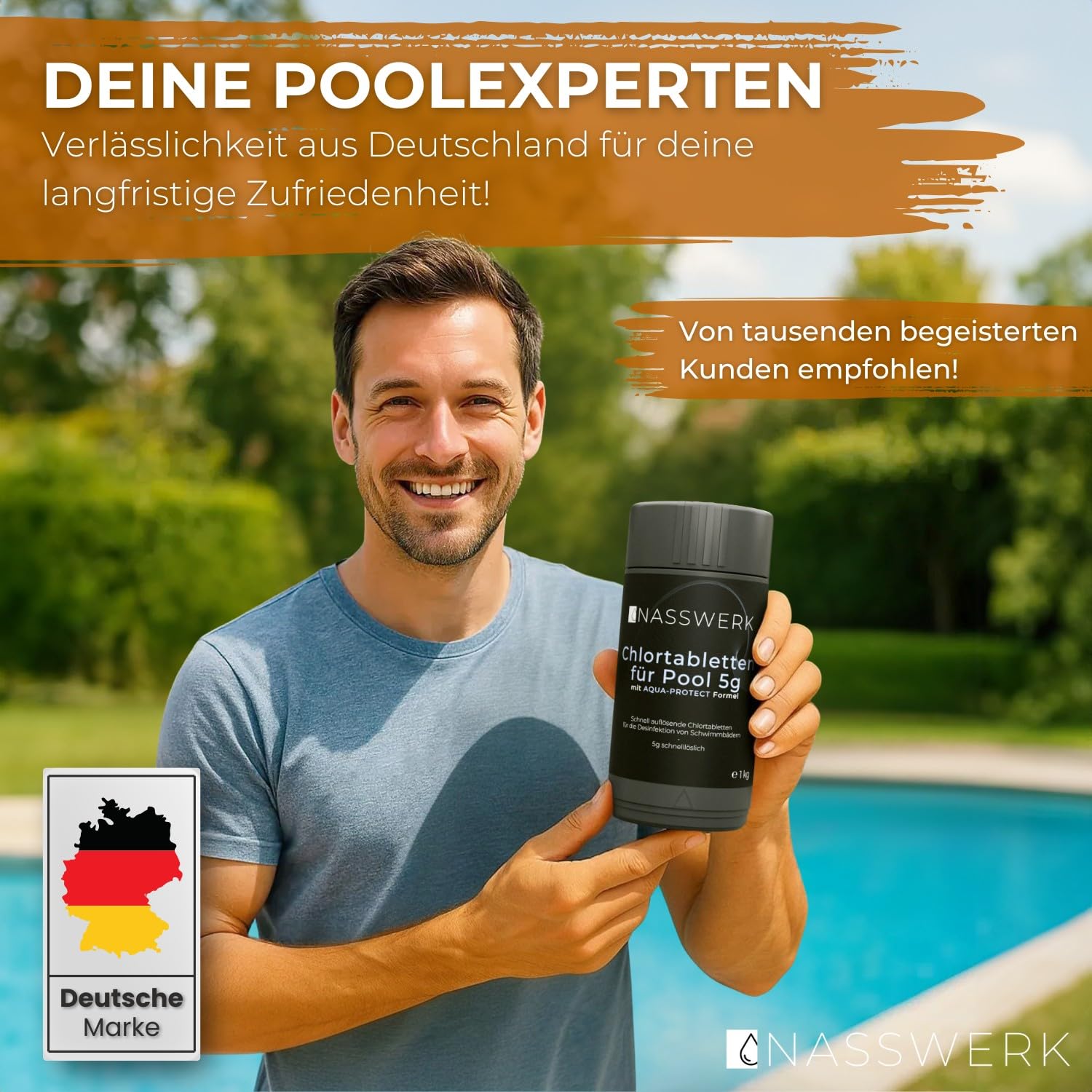 NASSWERK Mini Chlortabletten für Whirlpool 5g (2kg) | Chlortabs 5g schnelllöslich für Pool & Planschbecken | Reinigungstabletten zur Schockchlorung, Stosschlorung & Dauerdosierung | Chlor Tabs klein
