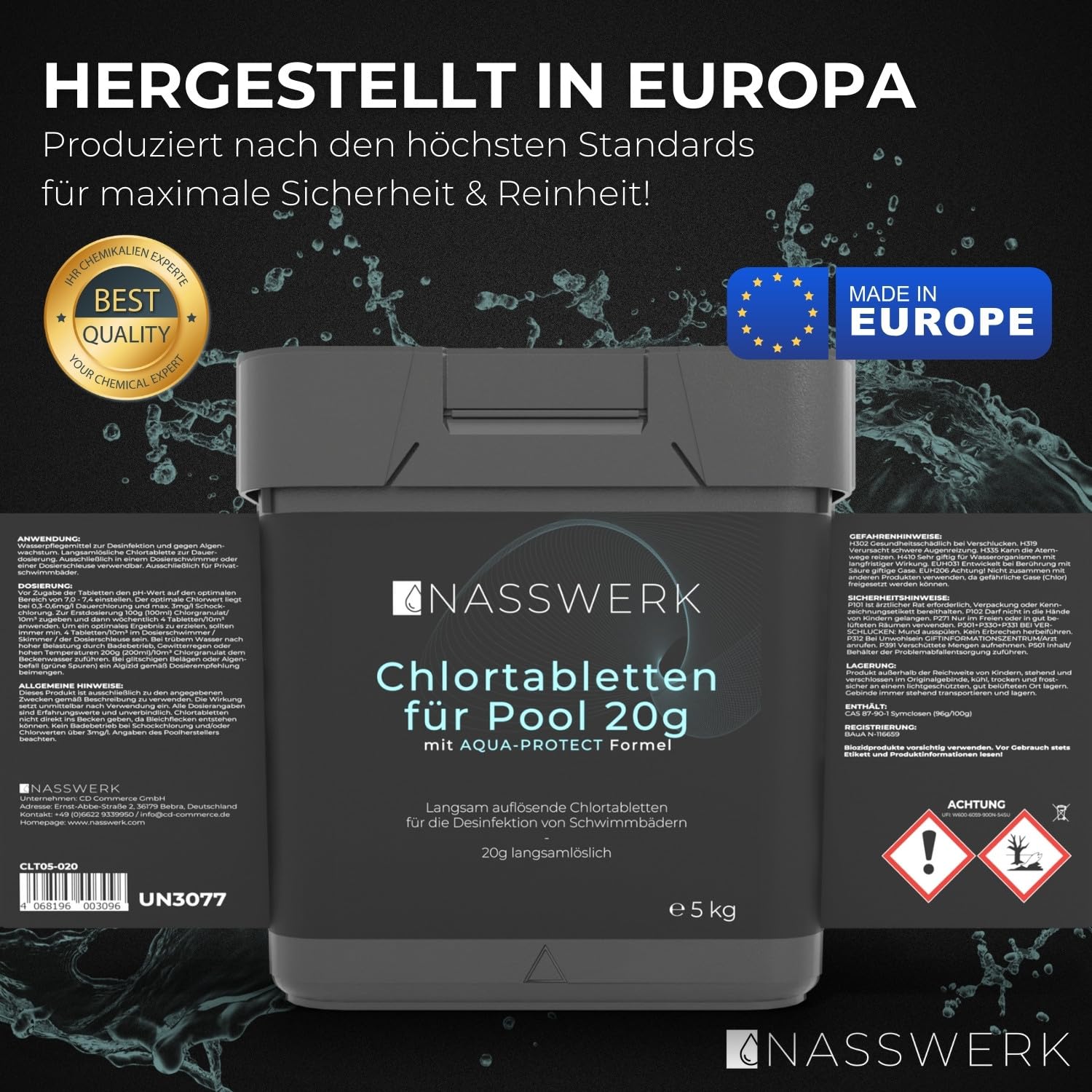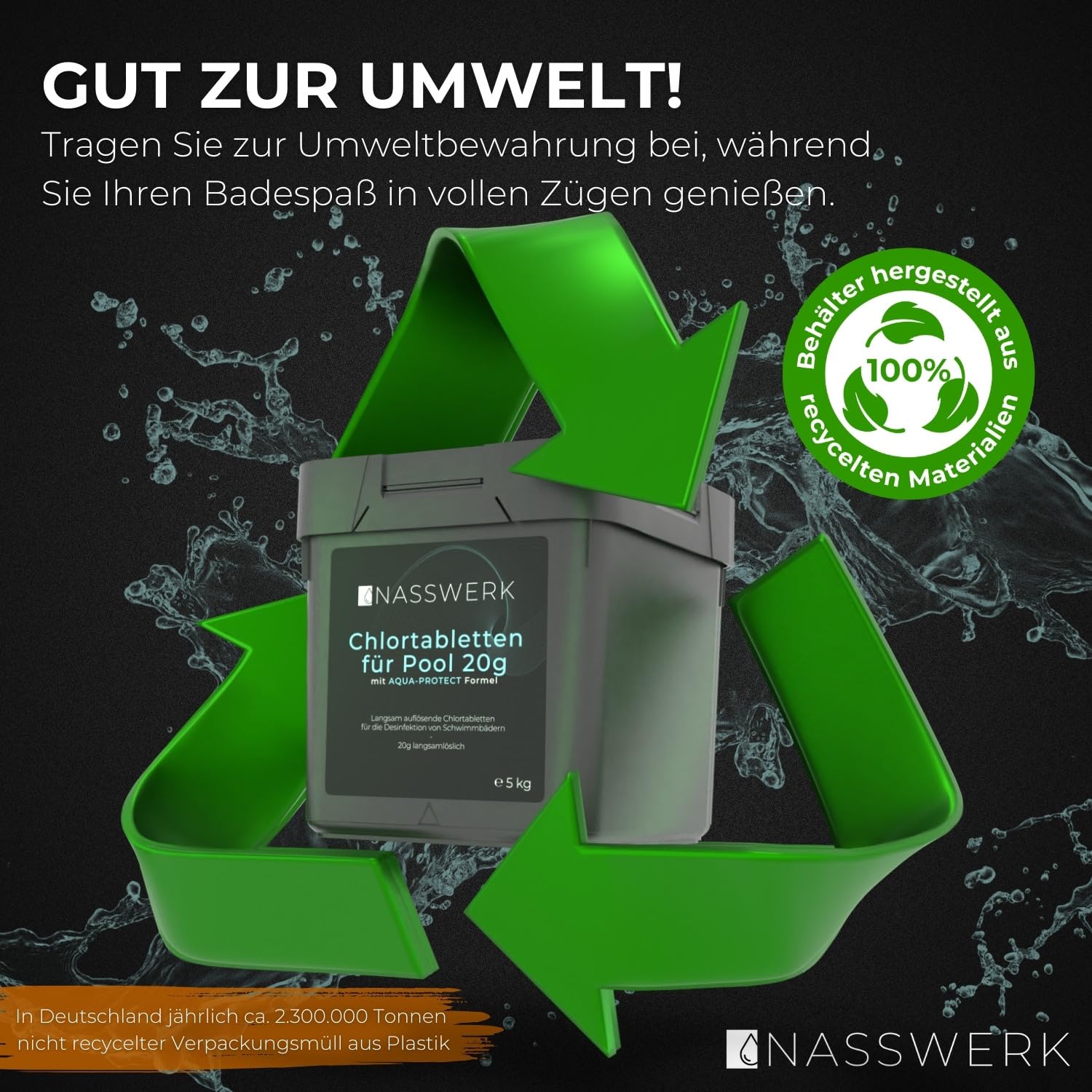 NASSWERK Langzeit Chlortabletten für Pool 20g (1kg bis 10kg) | Chlortabs 20g langsamlöslich für Whirlpool | Chlor Tabletten Pool zur Desinfektion & Pflege | Poolpflege Mini Tabs Langzeittabletten