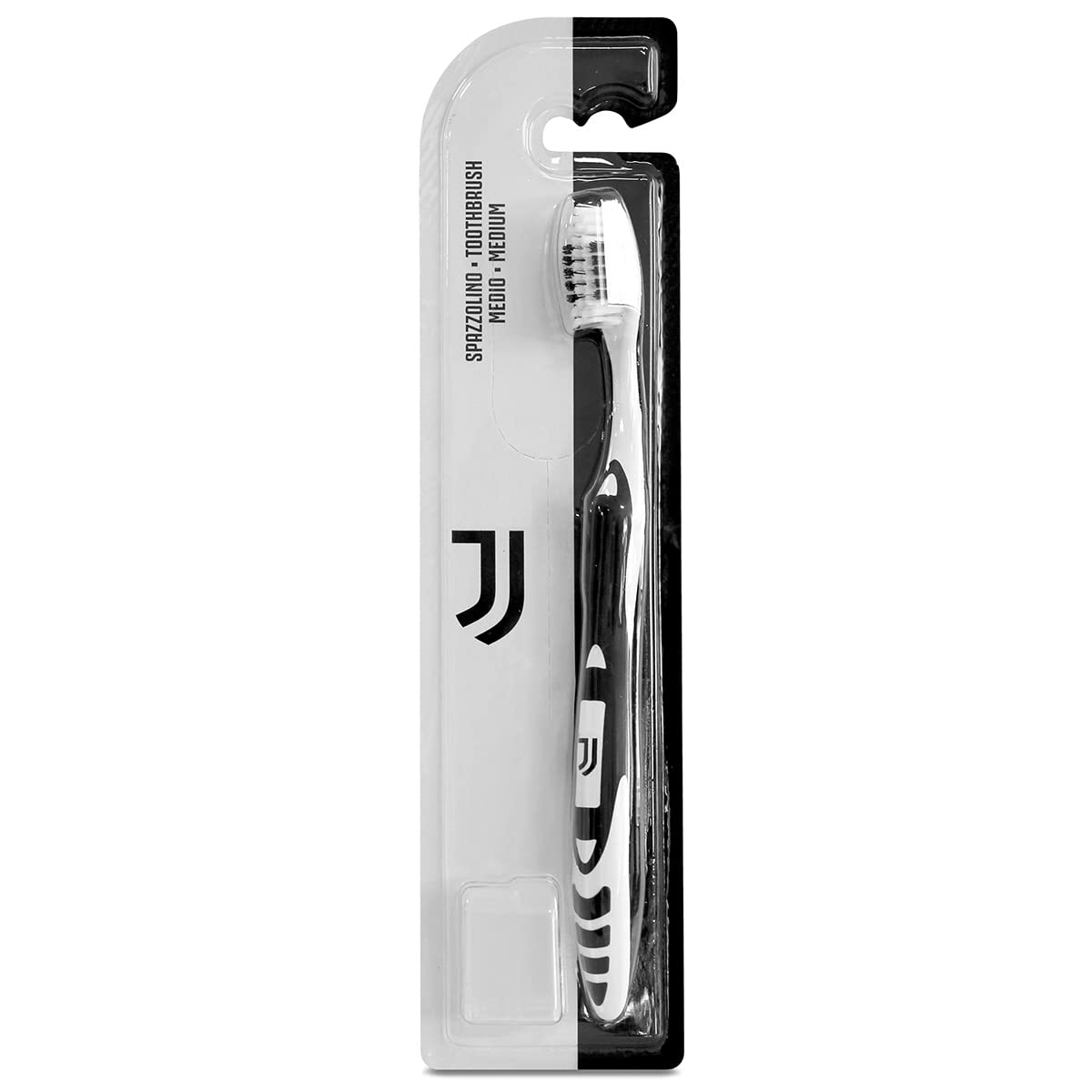 Kid-sized toothbrush with soft bristles and Juventus-themed design. Ergonomic handle ensures comfortable grip and effective cleaning for young users.