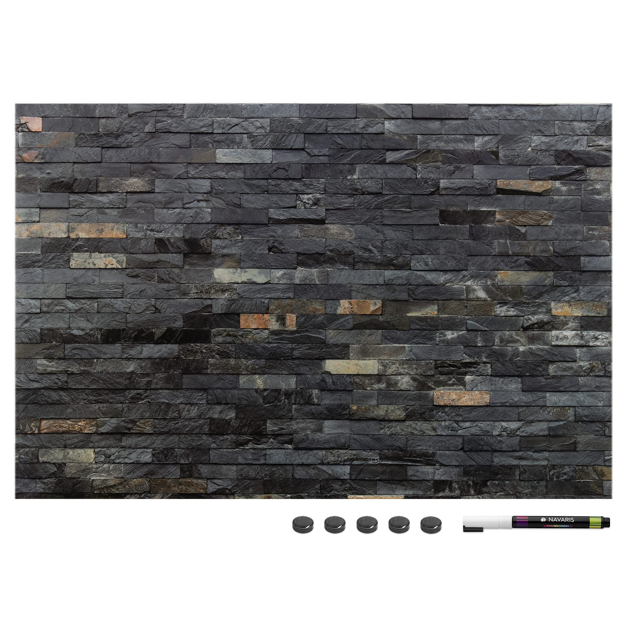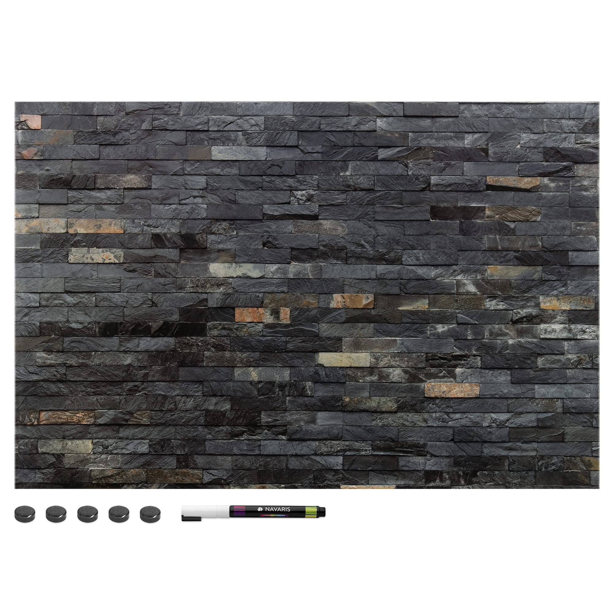 Organisieren Sie Ihre Ideen mit der multifunktionalen Magnettafel. KOMPLETT Die Wandtafel wird mit einem Befestigungsset, 5 Magneten und 1 Filzstift geliefert. Die Aufhängung ist an der Wand nicht sichtbar. Schreiben Sie wichtige Dinge auf und hängen Sie Ihre Fotos auf denselben Ständer. Dekoration: Das Gemälde schmückt jeden Raum in Ihrem Zuhause. Küche, Büro oder Kinderzimmer, es bringt überall eine dekorative Note! Leichtgewichtig. Da es nicht aus Glas besteht, ist das Memoboard besonders leicht. Geschenkidee: Das Love Live Laugh Design Painting ist ein originelles und praktisches Geschenk für jeden Anlass. Unser Sortiment. Unser Angebot umfasst viele praktische und stilvolle Magnettafeln. Zögern Sie nicht, einen Blick darauf zu werfen! Technische Daten: Materialien: MDF, Blech, Bagasse-Karton. Abmessungen 60 x 40 x 2 cm Gewicht 900 Gramm Design: dunkle Steine Im Lieferumfang enthalten. 1 x Magnettafel 1 x Marker 5 x Magnete 1 x Montageset