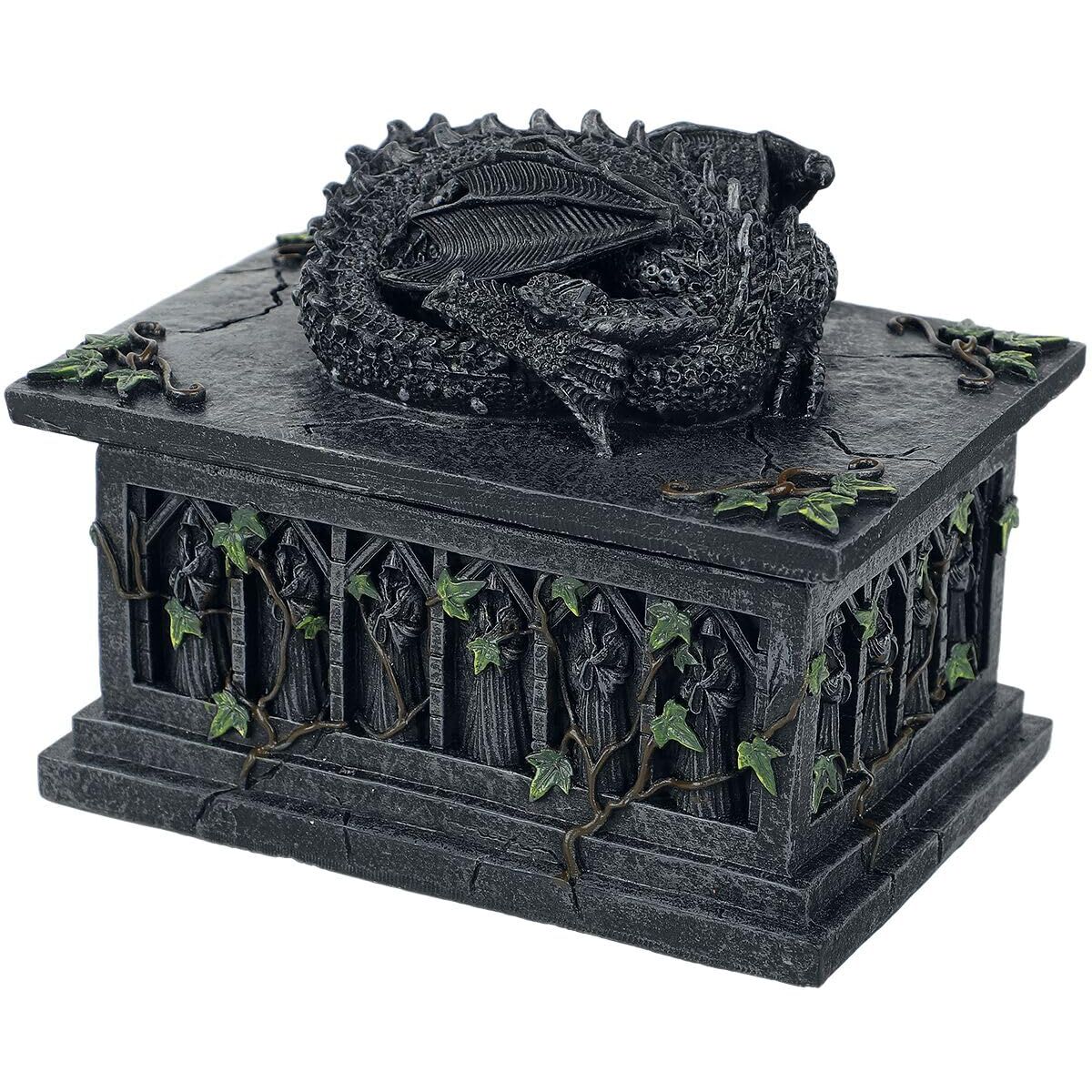. Bewahren Sie Ihre Prophezeiungswerkzeuge sicher mit Stil mit dieser drakonischen Tarotbox auf. Auf einem Obsidian-Altar zusammengerollt, schläft dieser junge schwarze Drache zufrieden, das Kinn ruht bequem auf dem Schwanz. Darunter ist der rechteckige Altar mit betenden Skeletten in langen, fliessenden Gewändern geschnitzt. Die Efeu-Ranke kriecht aus dem Boden und absorbiert langsam den Altar zurück in den Wald. Aus feinstem Harz gegossen, bevor sie sorgfältig von Hand bemalt werden. Warum nicht diese Tarotbox mit kombinieren. Eines unserer fantastischen Tarotkartendecks?
