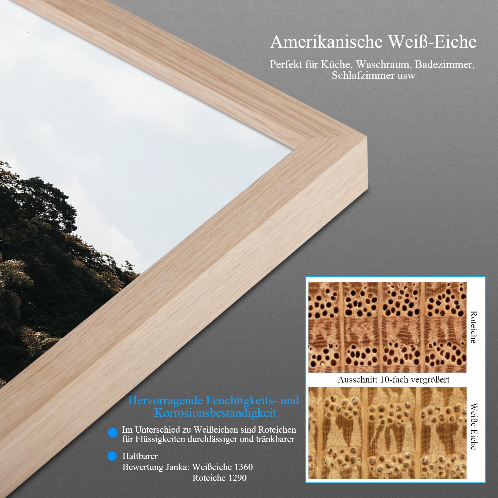 HOCHWERTIGER BILDERRAHMEN AUS EICHENHOLZ A3 (29,7 x 42 cm): Unsere hellen Holzrahmen bestehen aus amerikanischer Weisseiche, die transparent beschichtet ist, um ein natürliches Finish zu erzielen. Darüber hinaus bestimmen die hervorragende Feuchtigkeits- und Korrosionsbeständigkeit sowie die Härte der Weisseiche ihre hohe Stabilität und Haltbarkeit. Es ist eine ideale Wahl für Ihre Schlafzimmerdekoration, Wohnzimmerdekoration, Bürodekoration, Küche, Bad, Kinderzimmer, Flurdekoration. Frontabdeckung aus gehärtetem Glas: 1. Stärker: Die Stossfestigkeit ist etwa 4-mal höher als bei gewöhnlichem Glas; 2. Bessere Lichtdurchlässigkeit; 3. Vergilbungsfrei; 4. Zeigt Bilder klar und natürlich an. MINIMALISTISCHES DESIGN: Rahmenformbreite – 1,3 cm, Rahmenformtiefe – 2 cm. Einfach aufzuhängen: Unsere Holzrahmen haben dank Holzqualität und robuster MDF-Rückwand eine hohe Stabilität und Haltbarkeit. Stabile Clips ermöglichen das Aufhängen der Rahmen sowohl in vertikaler als auch in horizontaler Ausrichtung. QUALITÄT UND NACHHALTIGKEIT Unsere Bilderrahmen werden von erfahrenen Handwerkern mit langjähriger Erfahrung in der Rahmenherstellung in Europa und Asien handgefertigt. Wir sind ausserdem stolz darauf, ein FSC-zertifiziertes Unternehmen zu sein. Dies bedeutet, dass die zur Herstellung unserer Bilderrahmen verwendeten Bäume aus verantwortungsvoll und nachhaltig bewirtschafteten Wäldern stammen.
