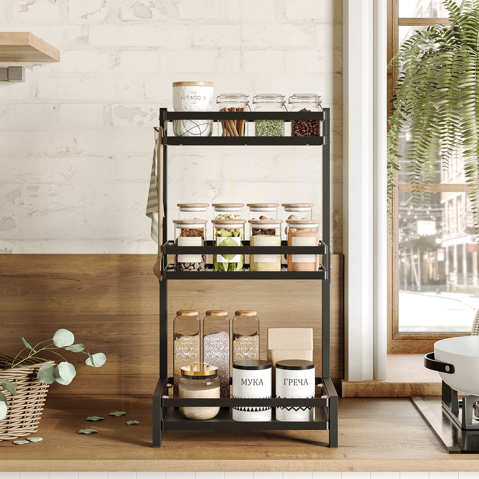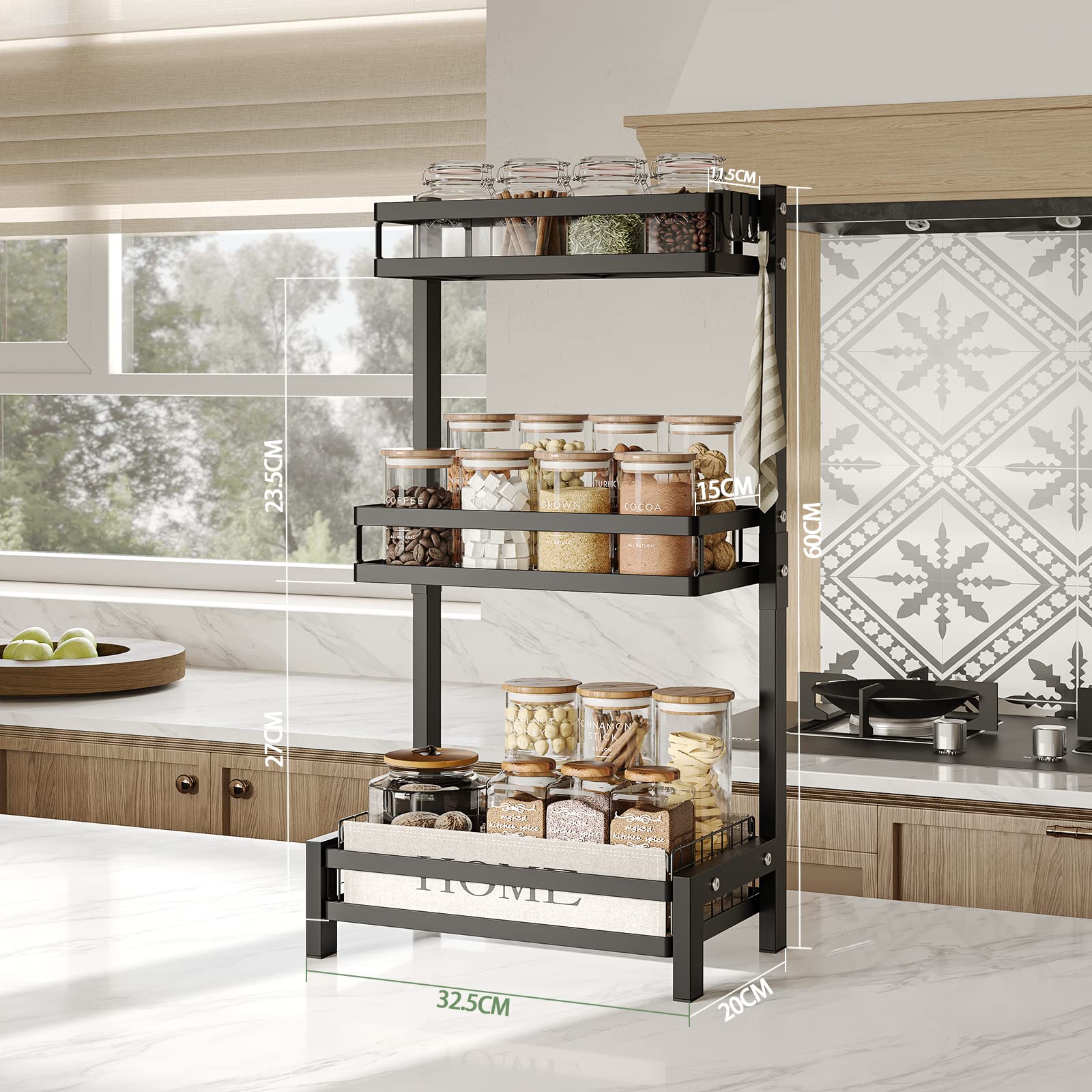 Netel Multifunktionales Stehendes Gewürzregal, 3-Stöckiges Edelstahl-Gewürzregal/Gewürzhalter Für Die Küchenaufbewahrung, Arbeitsplatten-Küchenorganisator Mit Haken, Schwarz, 32,5 × 20 × 60 Cm