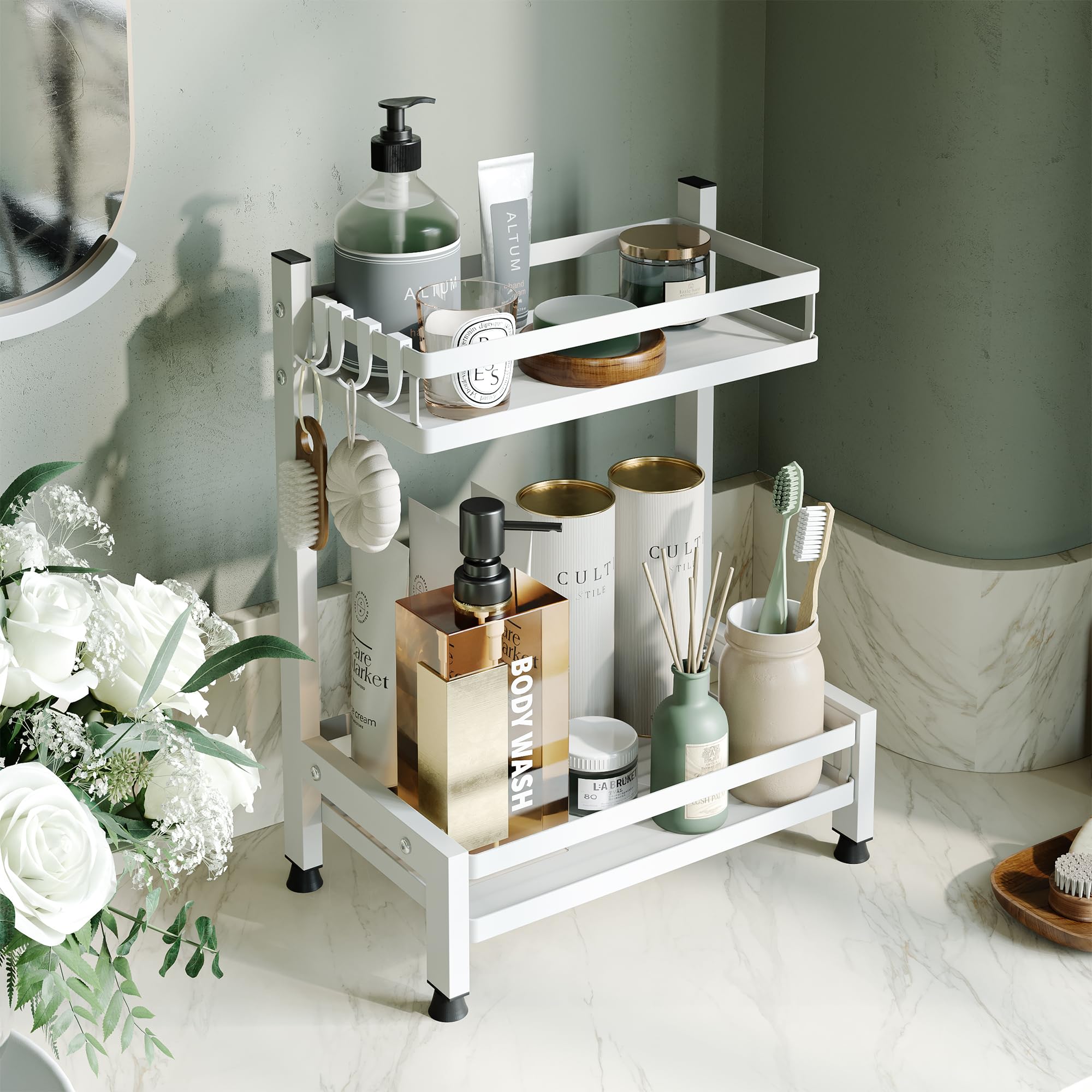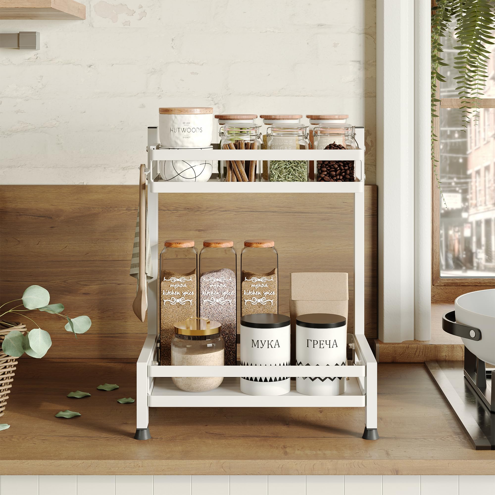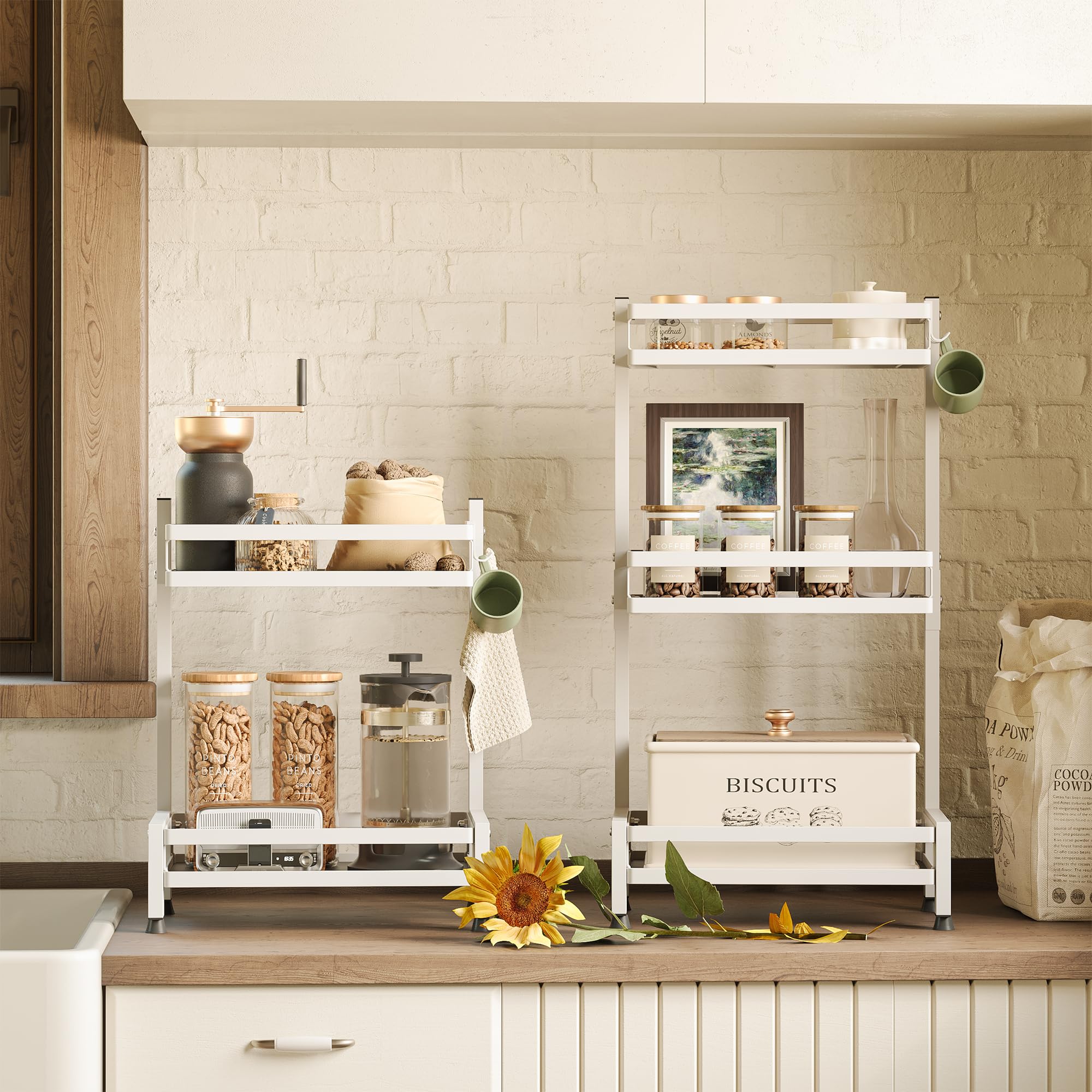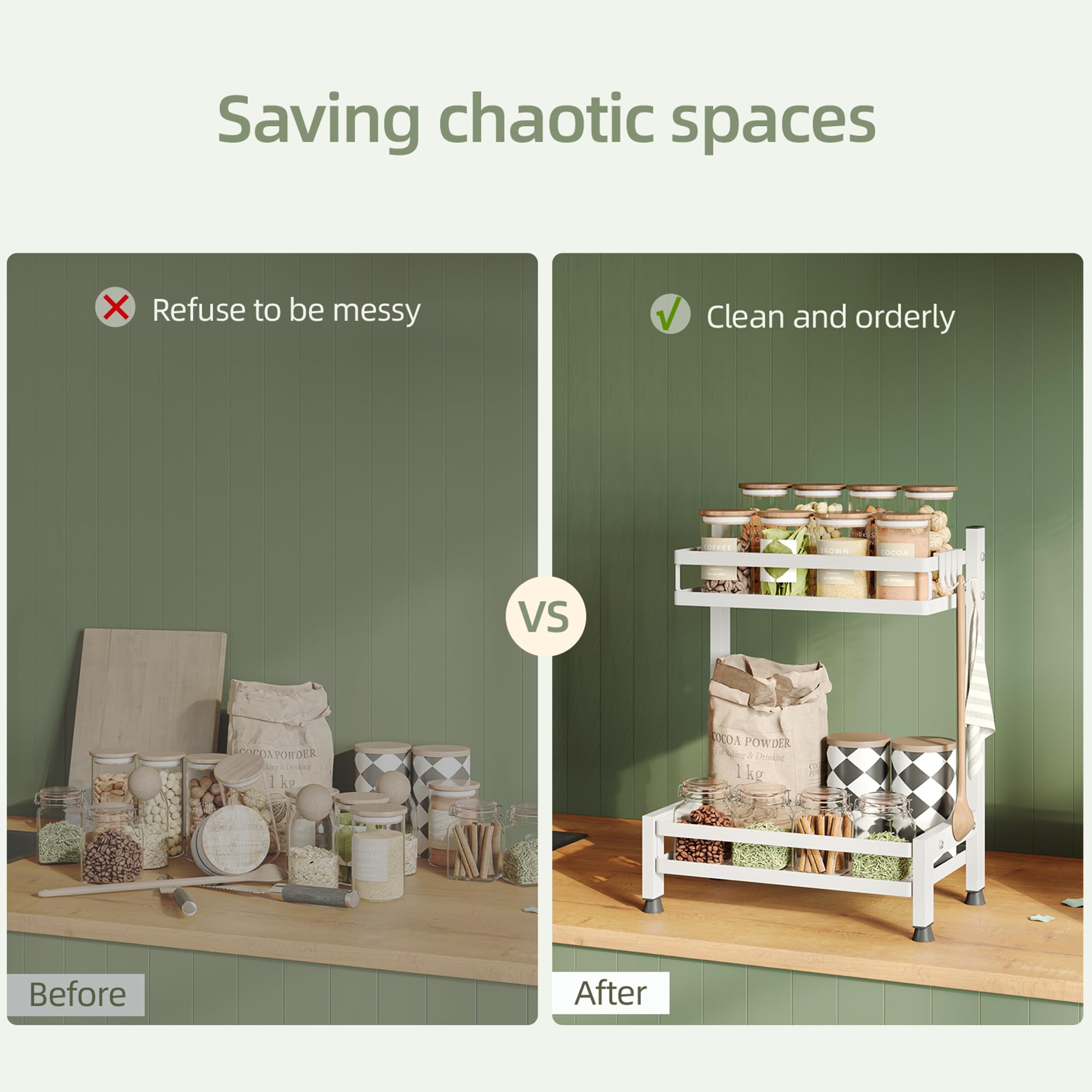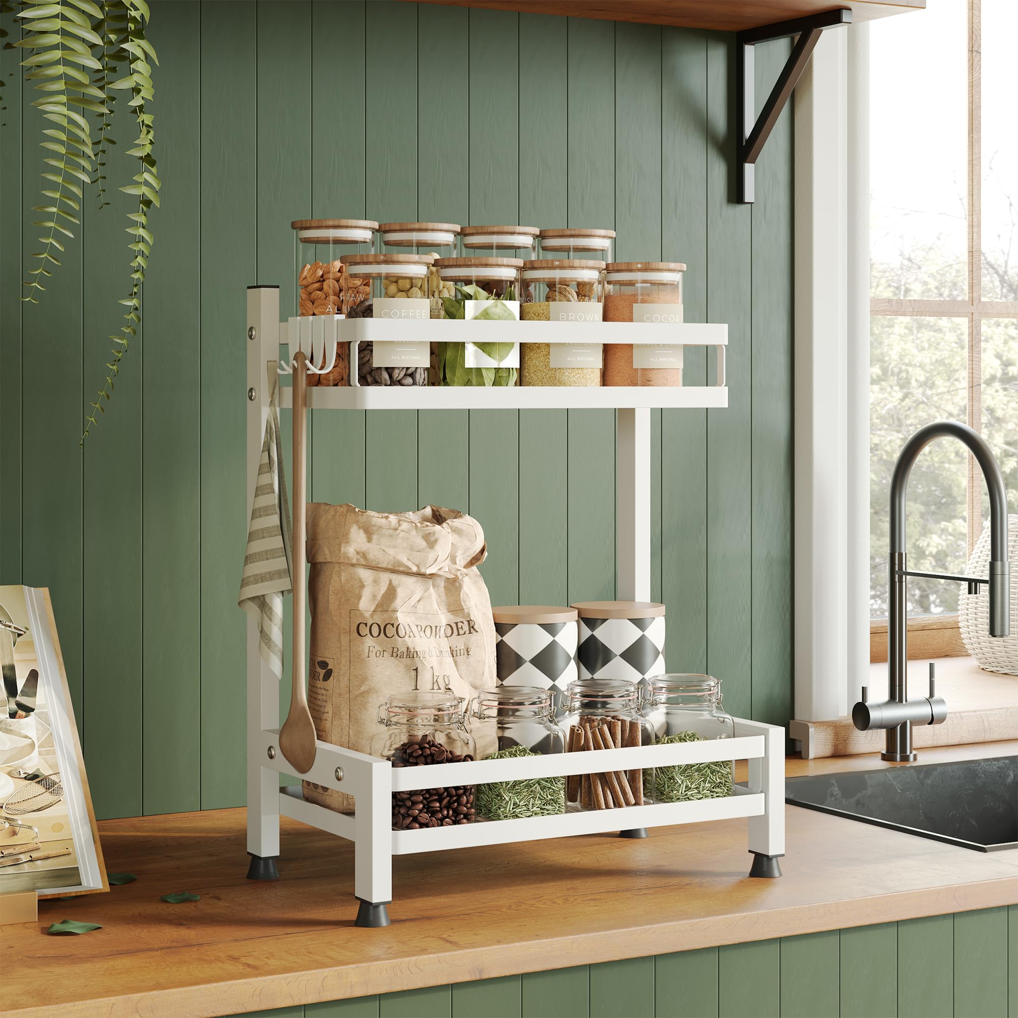 NETEL Multifunktional Gewürzregal Stehend, 2 Etagen Rostfrei Gewürzständer/Gewürzhalter, Küchenregal Organizer für 4 Haken, Weiss