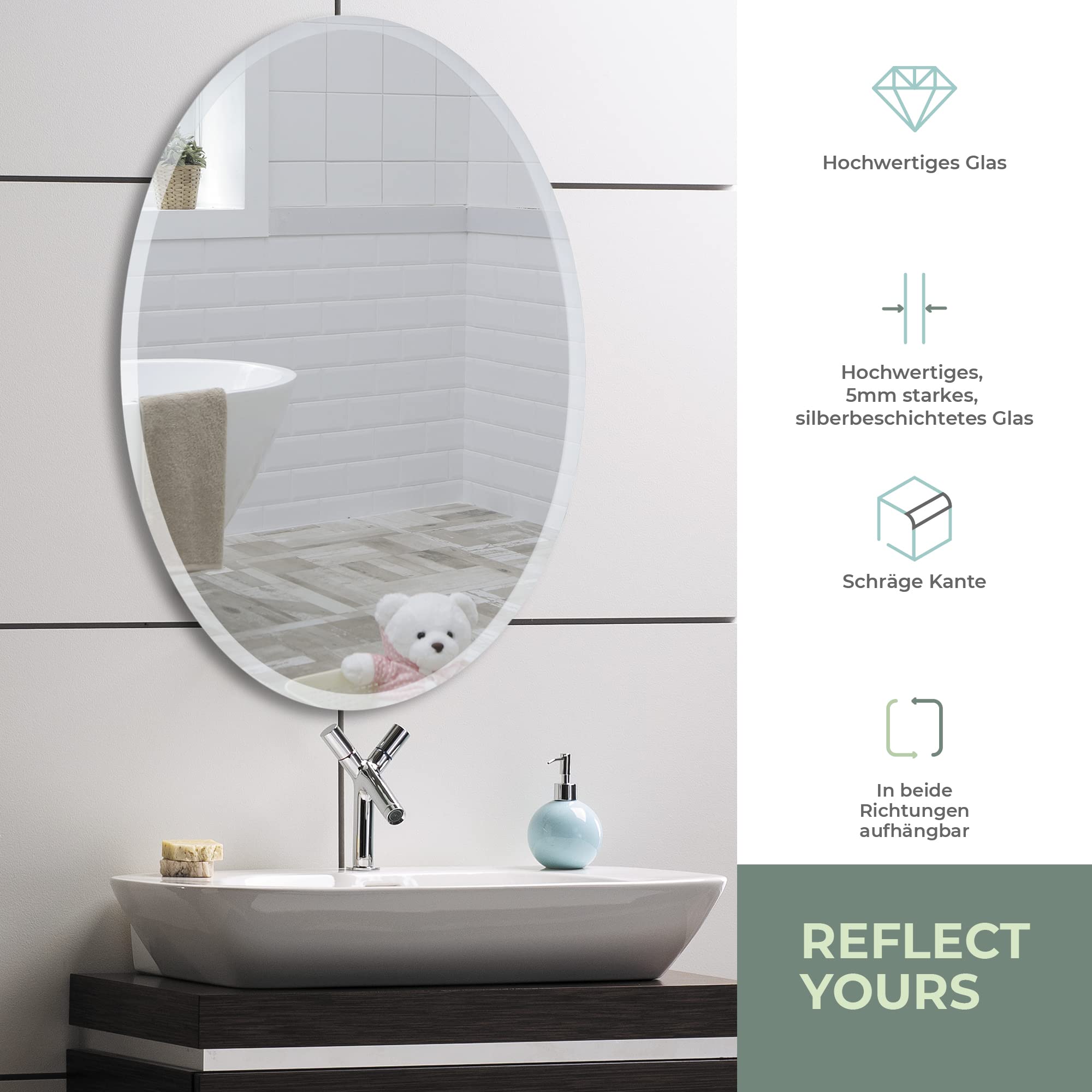 Neue Design Mood® Premium Oval Bathroom Mirror, Wall Mounted Bevelled Frameless Mirrors, Hangs Both Ways, Toilet Bedroom Hallway, (70cm x 50cm)