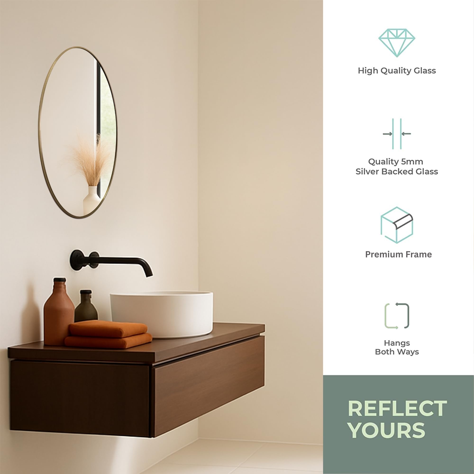 Neue Design Mood® Premium Oval Bathroom Mirror Gold Framed Wall Mounted, Frame Modern & Stylish (70cm x 50cm)