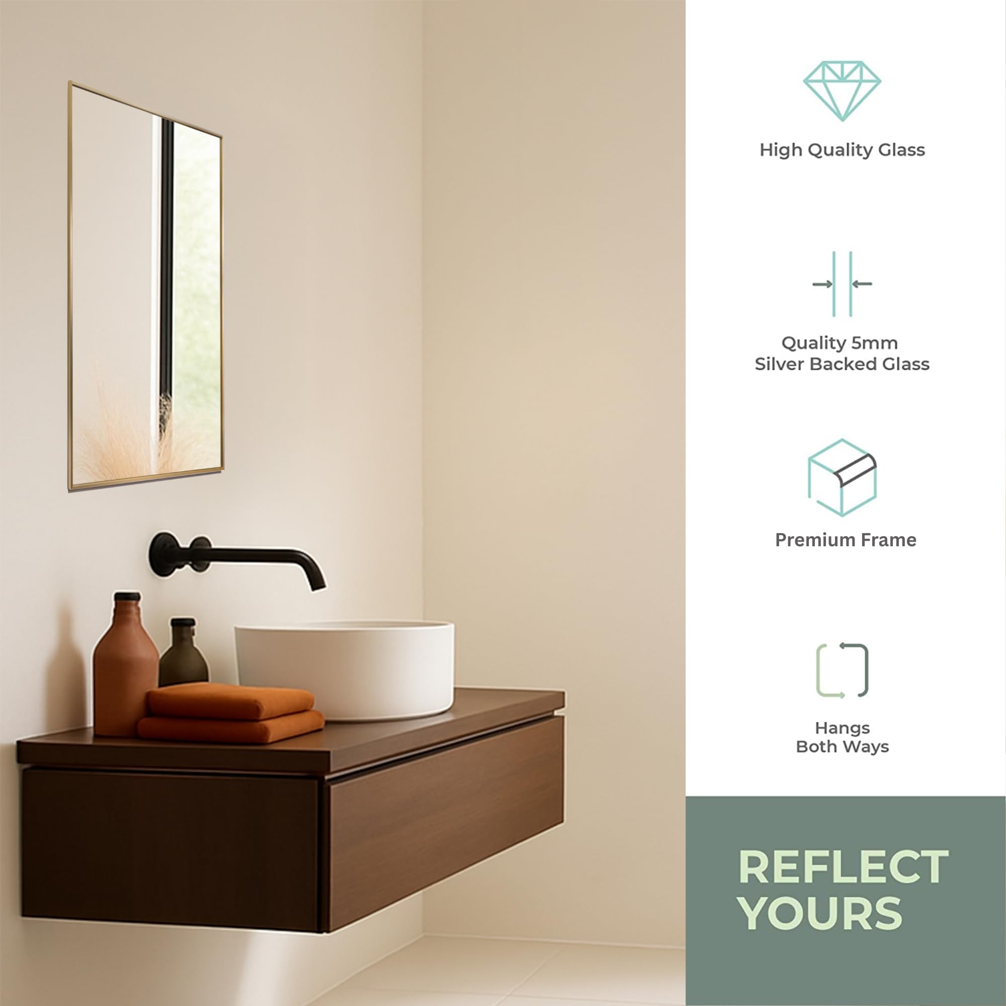 Neue Design Mood® Premium Rectangular Bathroom Mirror Gold Framed Wall Mounted, Rectangle Frame Modern & Stylish (70cm x 50cm)