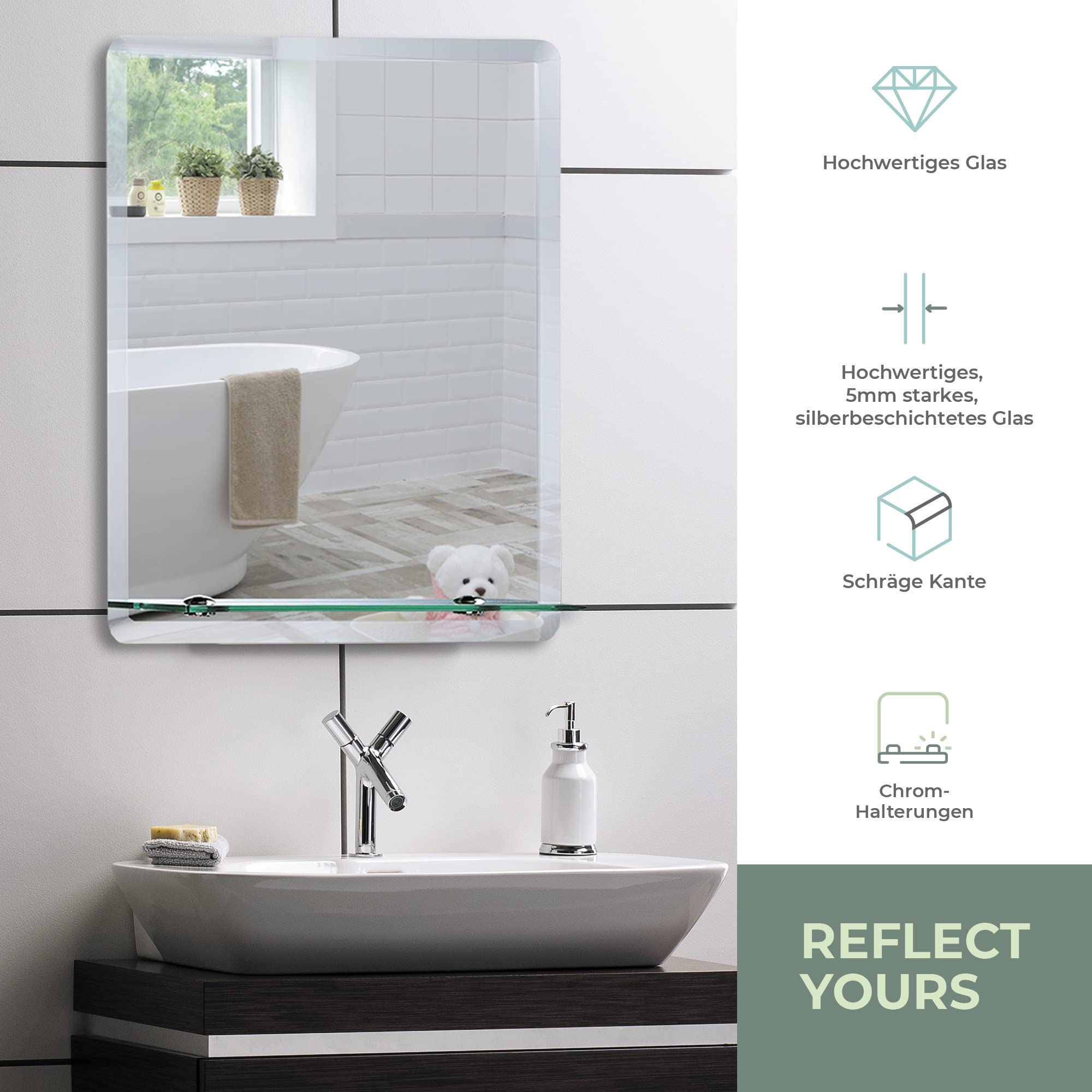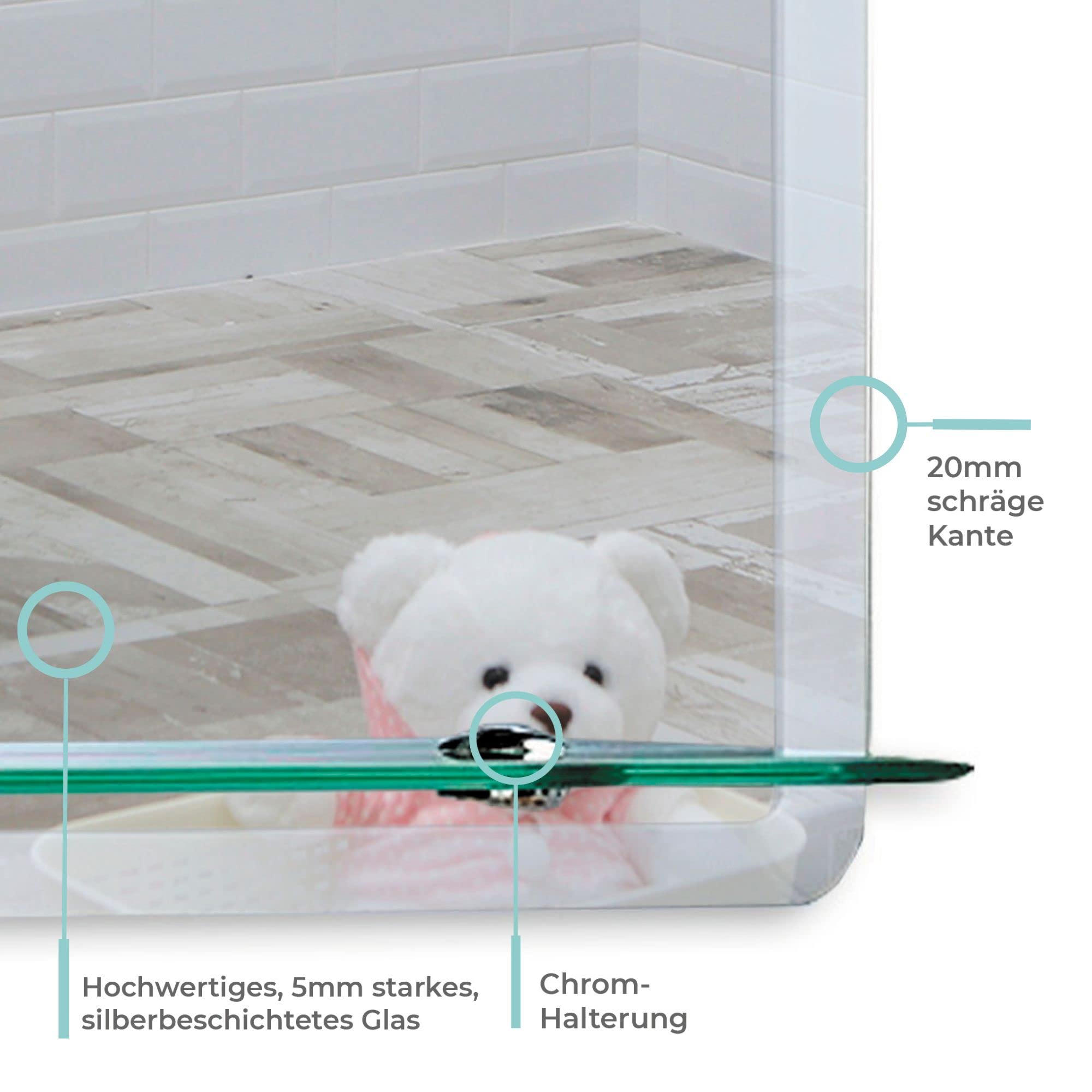 Neue Design Badezimmer-Wandspiegel, modernes, stilvolles Design mit Ablage und abgeschrägter Ebene, 3 Grössen: 70 cm x 50 cm, 60 cm x 45 cm, 50 cm x 40 cm, EM1002, glas, silber, 60cm X 45cm