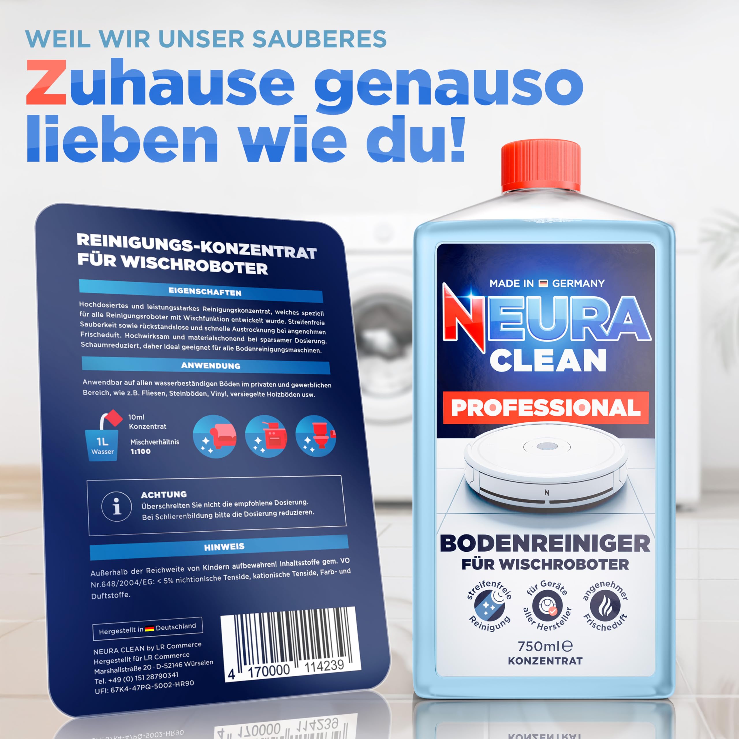NeuraClean Bodenreiniger Wischroboter Reinigungsmittel [Extra Stark] Schaumarm 750ml - Saugroboter Reinigungsmittel für streifenfreie Reinigung mit Duft - Reiniger für Saugwischer aller Art