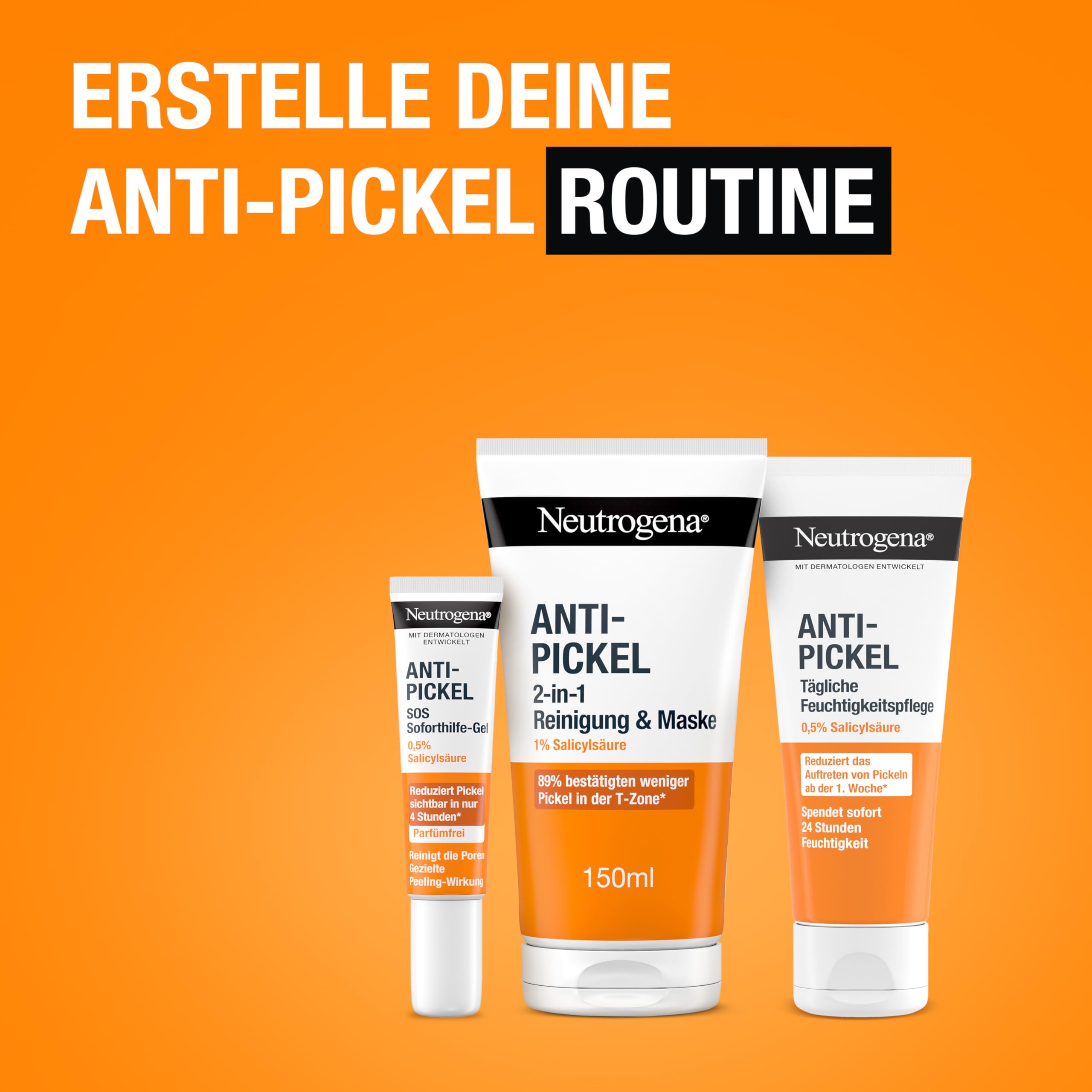 Die Neutrogena Anti-Pickel 2-in-1 Reinigung & Maske ist eine vielseitige Gesichtspflege, die die Vorteile einer reinigenden Formel mit der Wirksamkeit einer Maske vereint. Entwickelt fuer unreine und zu Akne neigende Haut, hilft dieses Produkt dabei, Poren tief zu reinigen, Pickel sowie Mitesser zu reduzieren und gleichzeitig die Haut vor Austrocknung zu schuetzen.