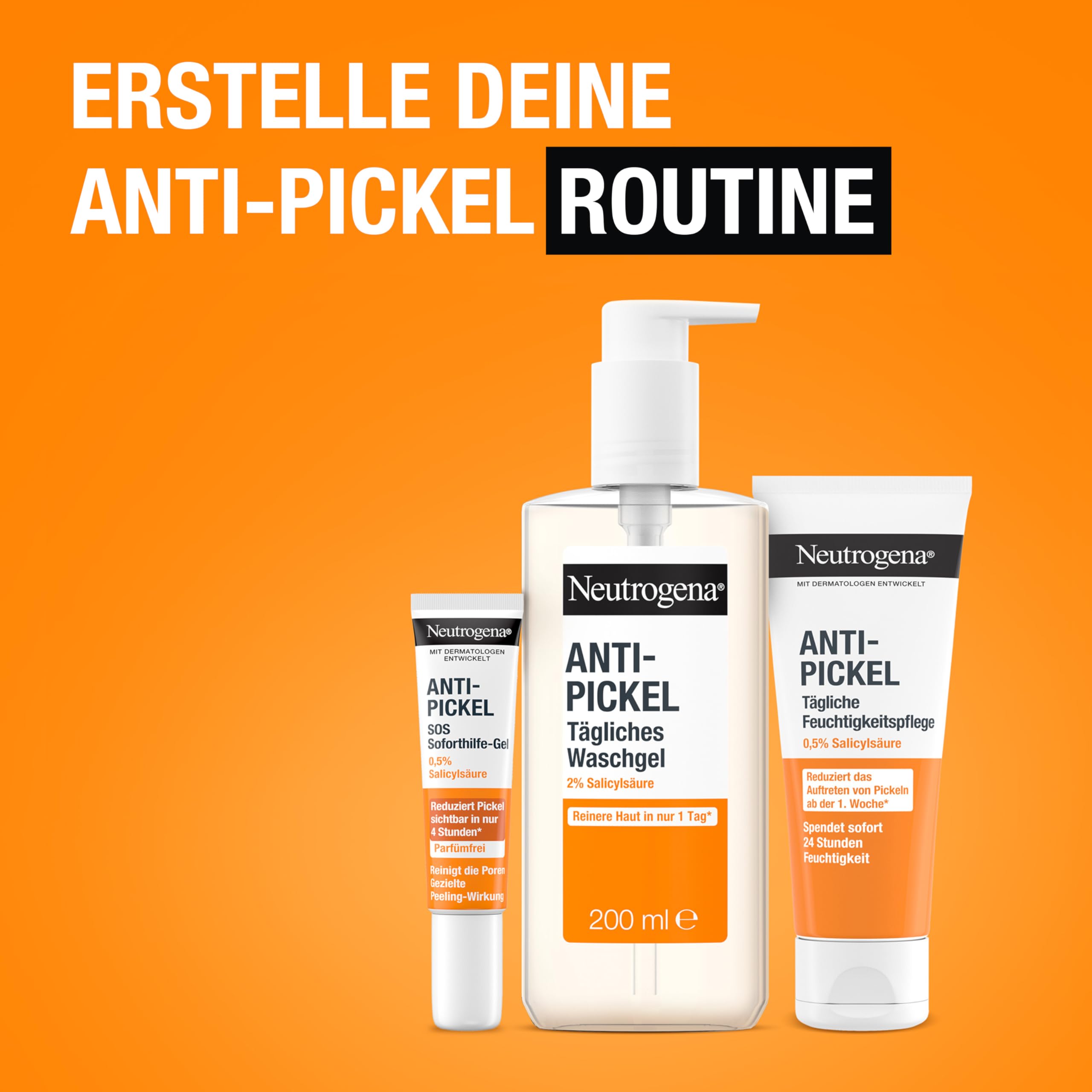 Gesünder aussehende Haut in nur 1 Woche*: Das Neutrogena Anti-Pickel SOS Soforthilfe-Gel im neuen Design reinigt die Poren dank gezielter Peeling-Wirkung und verleiht gesünder aussehende Haut in nur 1 Woche*. Das schnell-einziehende Anti Pickel Gel mit 0,5% Salicylsäure (BHA) hilft, den natürlichen Erneuerungsprozess der Haut zu unterstützen und verstopfte Poren zu reinigen, damit sie weniger sichtbar erscheinen. Zudem reduziert das Gel wissenschaftlich erwiesen die Grösse von Pickeln und Rötungen sichtbar in nur 4 Stunden*. Anwendung: Das Öl-freie & mit Dermatologen entwickelte Pickelentferner Gel mit einem pH-Wert von 4 morgens und abends direkt an der gewünschten Stelle auftragen, Kontakt mit den Augen vermeiden. (*Wissenschaftliche Studie mit 32 Teilnehmer:innen)