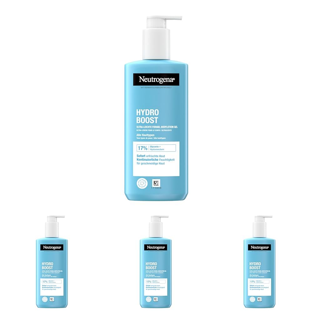 Praktisches Vorteilspack Lieferumfang: 4 x 250 ml Neutrogena Hydro Boost Bodylotion Gel mit Pumpspender – fuer langanhaltend gepflegte, hydratisierte Haut.