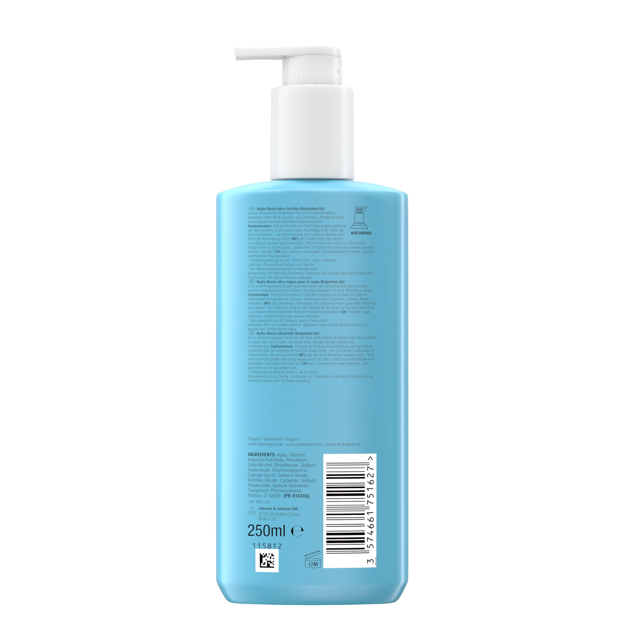 Die Neutrogena Hydro Boost Bodylotion Gel bietet ultraleichte, erfrischende Pflege, die wissenschaftlich erwiesen sofort einzieht und die Haut glatt, geschmeidig und strahlend hinterlässt. Die leichte Gel-Textur verschmilzt mit der Haut, zieht sofort ein und hinterlässt keinen fettigen Film, sodass Sie sich direkt nach dem Eincremen anziehen können.