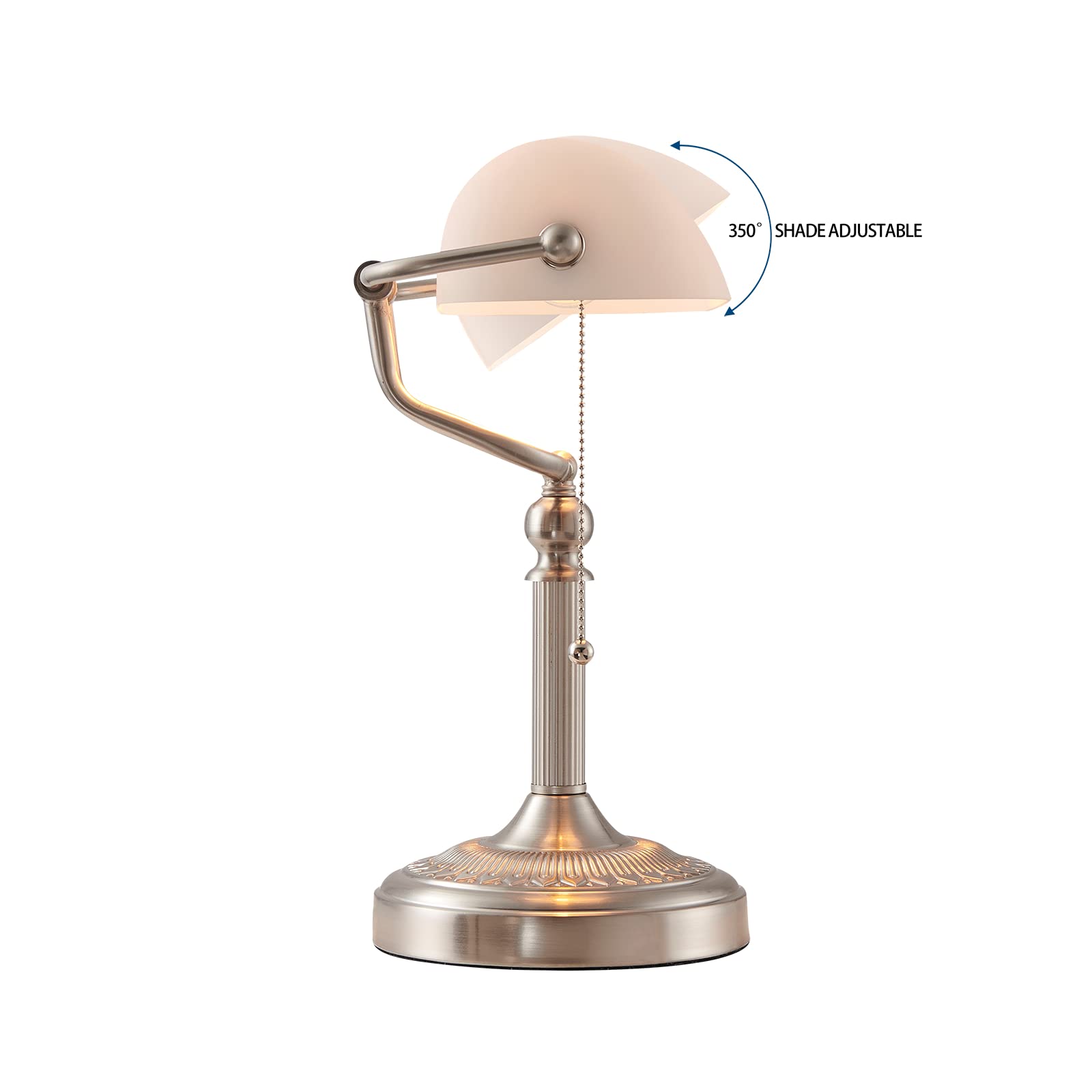 1. Antike Banker-Schreibtischlampe aus weissem Milchglas mit Zugkettenschalter. Sie können den Winkel ganz einfach an Ihre Beleuchtungsanforderungen anpassen.