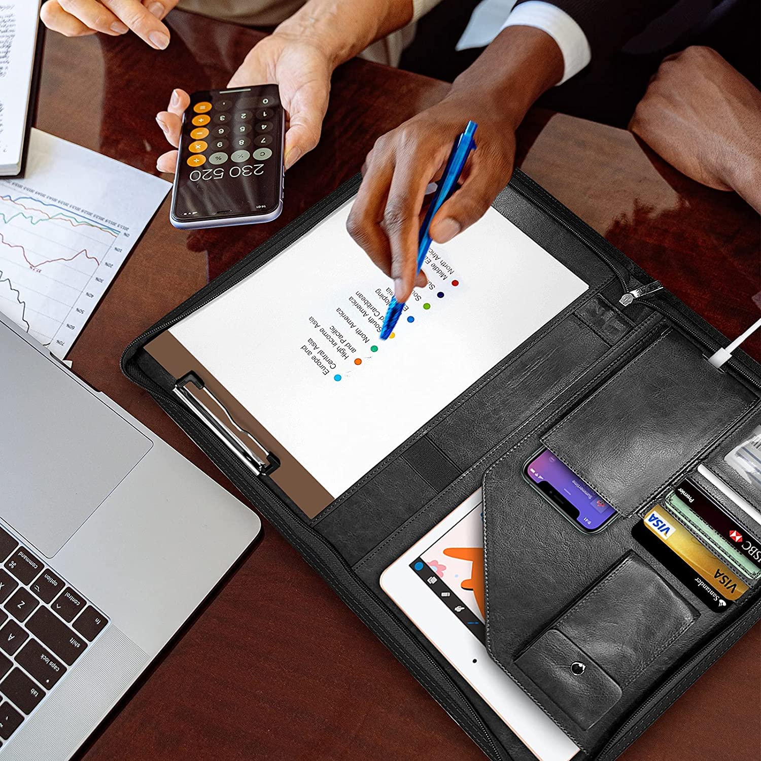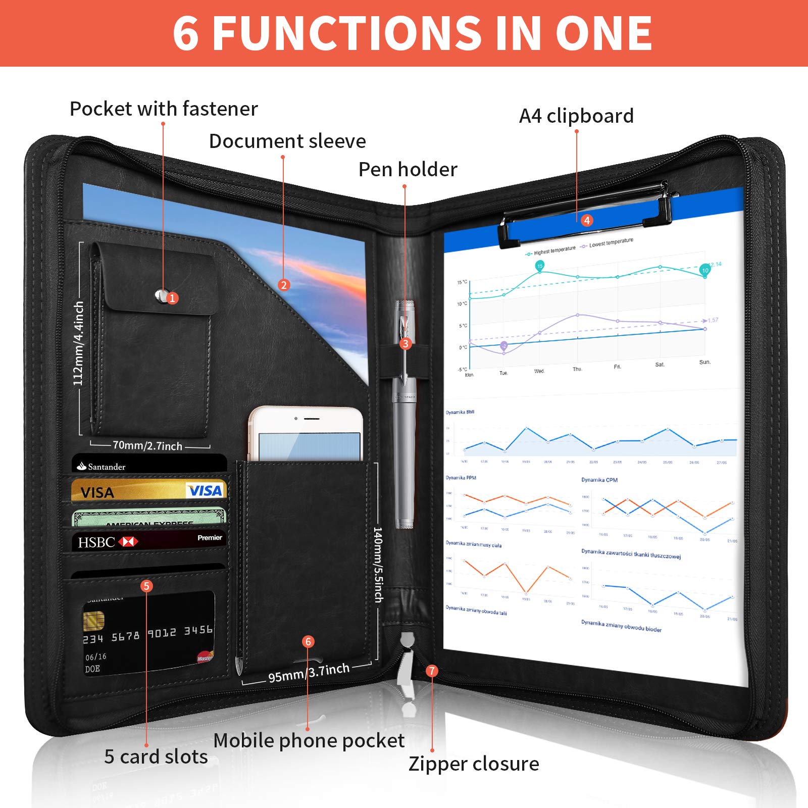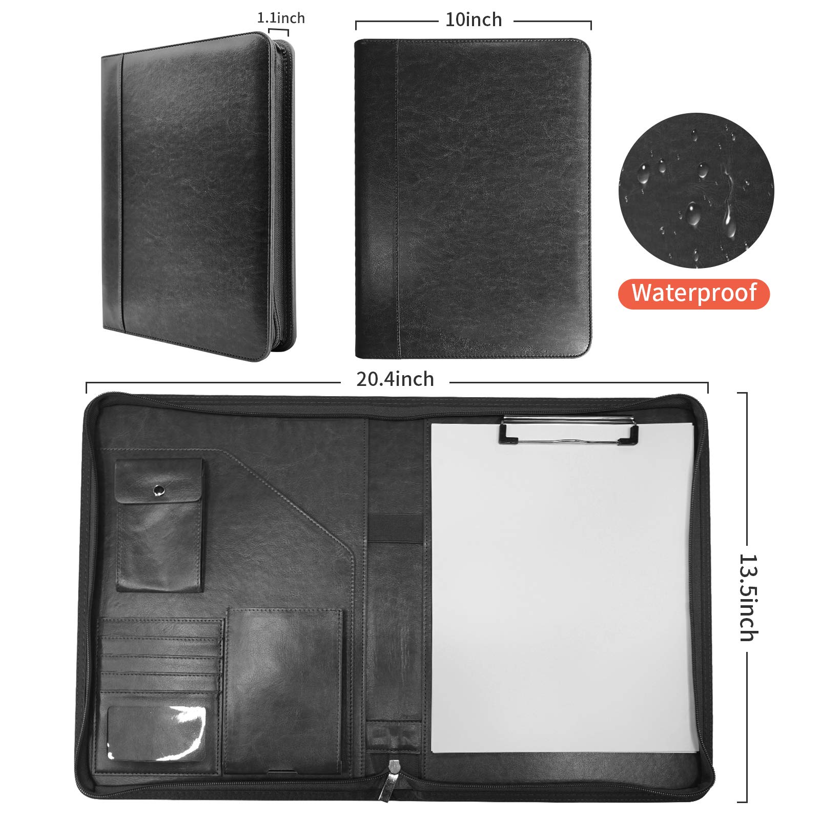 NEWYES NY-A403-BL-EU Konferenzmappe aus Leder, mit Reissverschluss, A4, Reisedokumentenmappe, Portfolio-Reisetasche, persönlicher Agenda-Organizer, 33,5 cm x 25 cm x 3,5 cm, Schwarz-Weiss